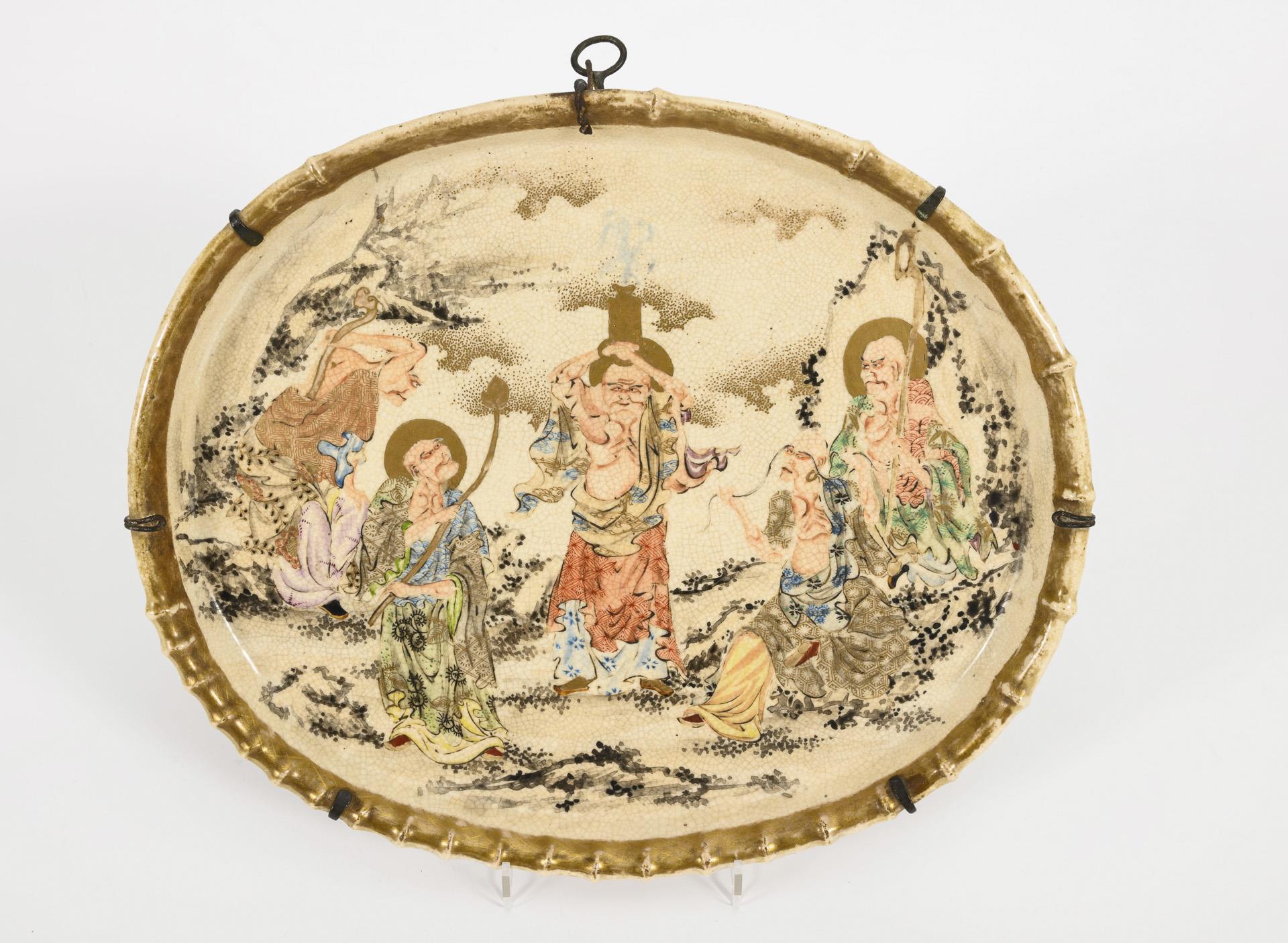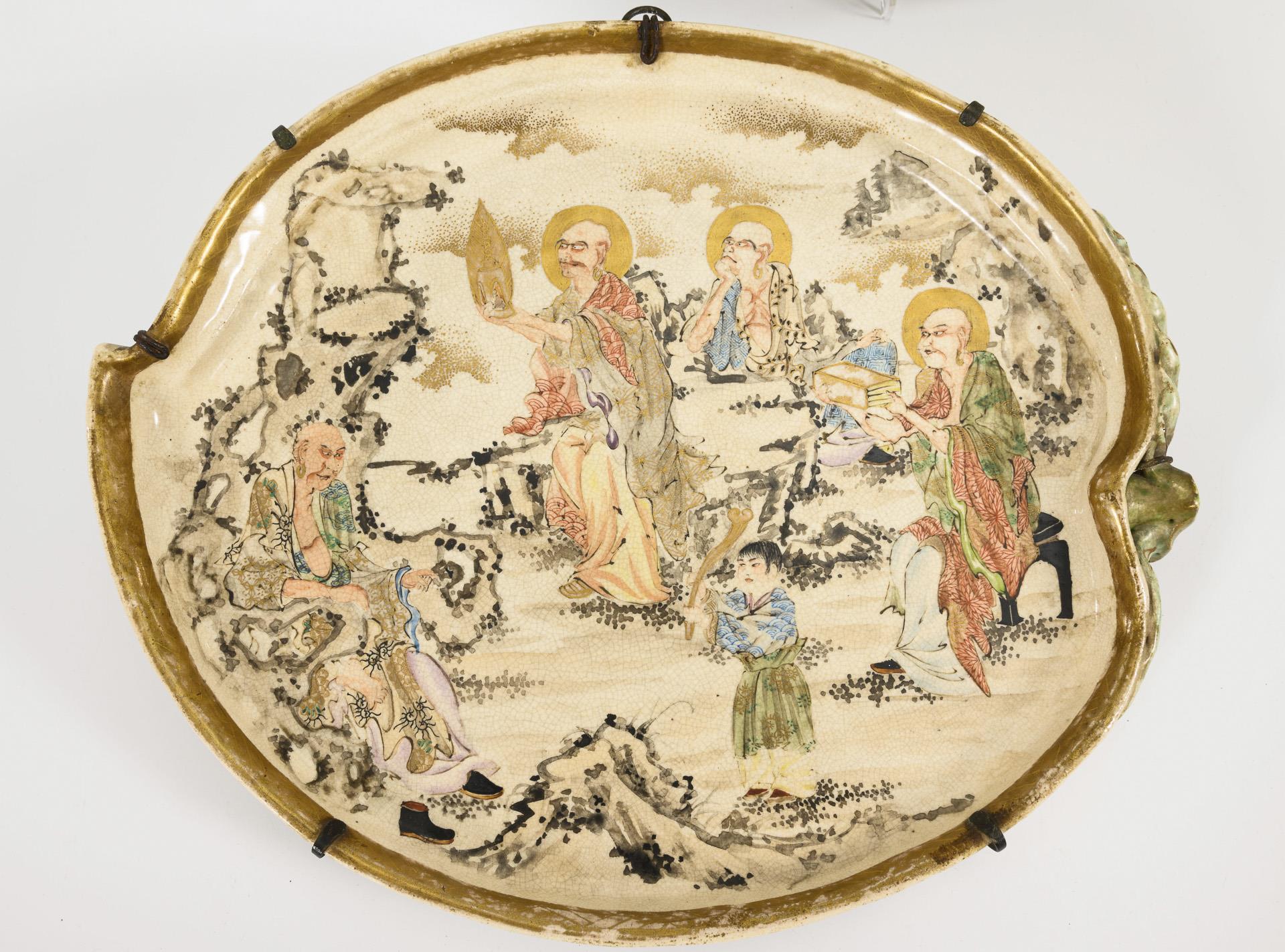 In der Art der Satsumaware. Beide mit vielfigurigen Heiligendarstellungen in angedeuteter Landschaft. Einmal entspricht die Randform des Tabletts einem Pfirsich mit plastischen Blättern und Stiel. Bei dem anderen Stück ist der Rand als Bambus geformt. Unglasierte Unterseite leicht unregelmäßig, wie mit Fingern flach gedrückt. Beide mit Wandhalterungen. Ränder berieben.