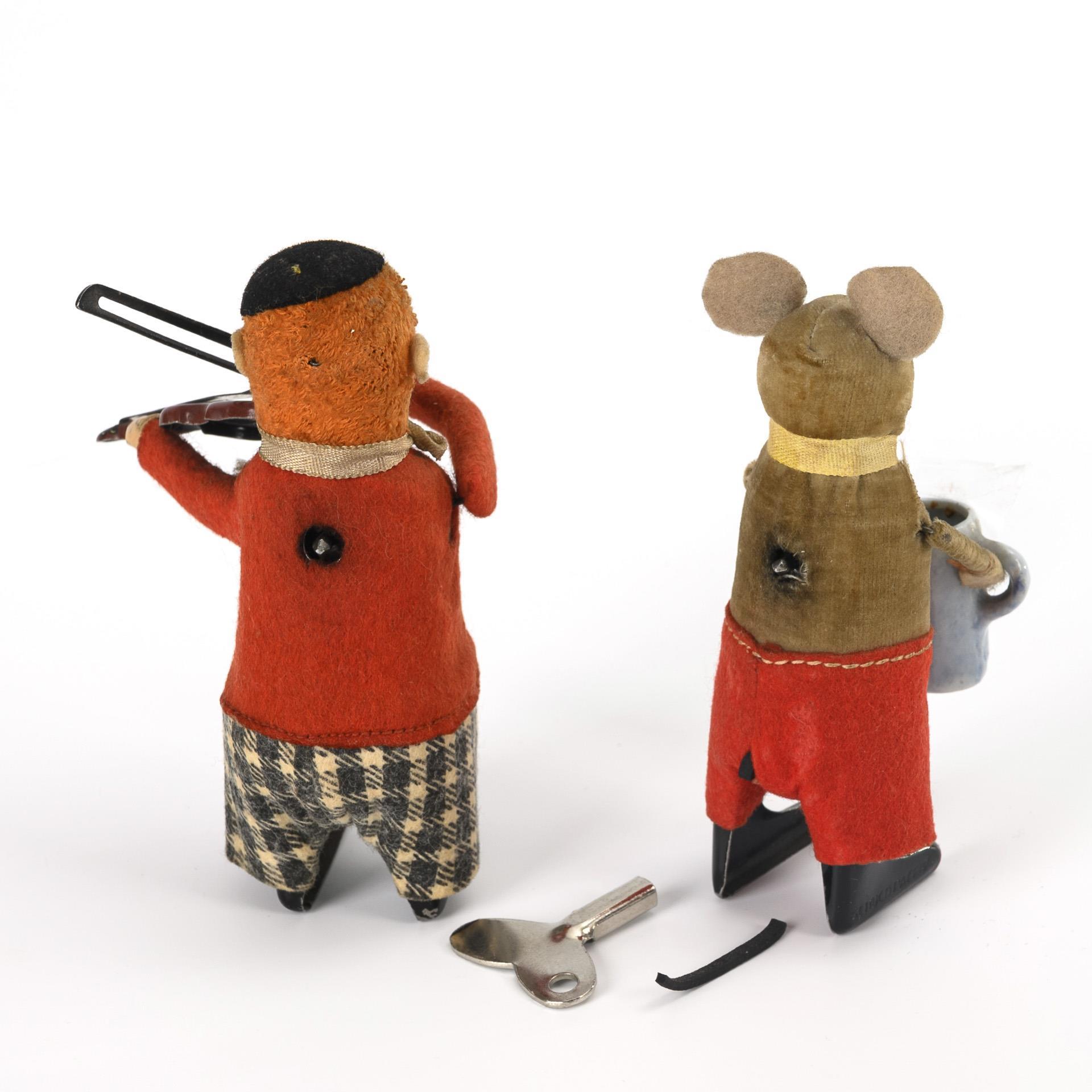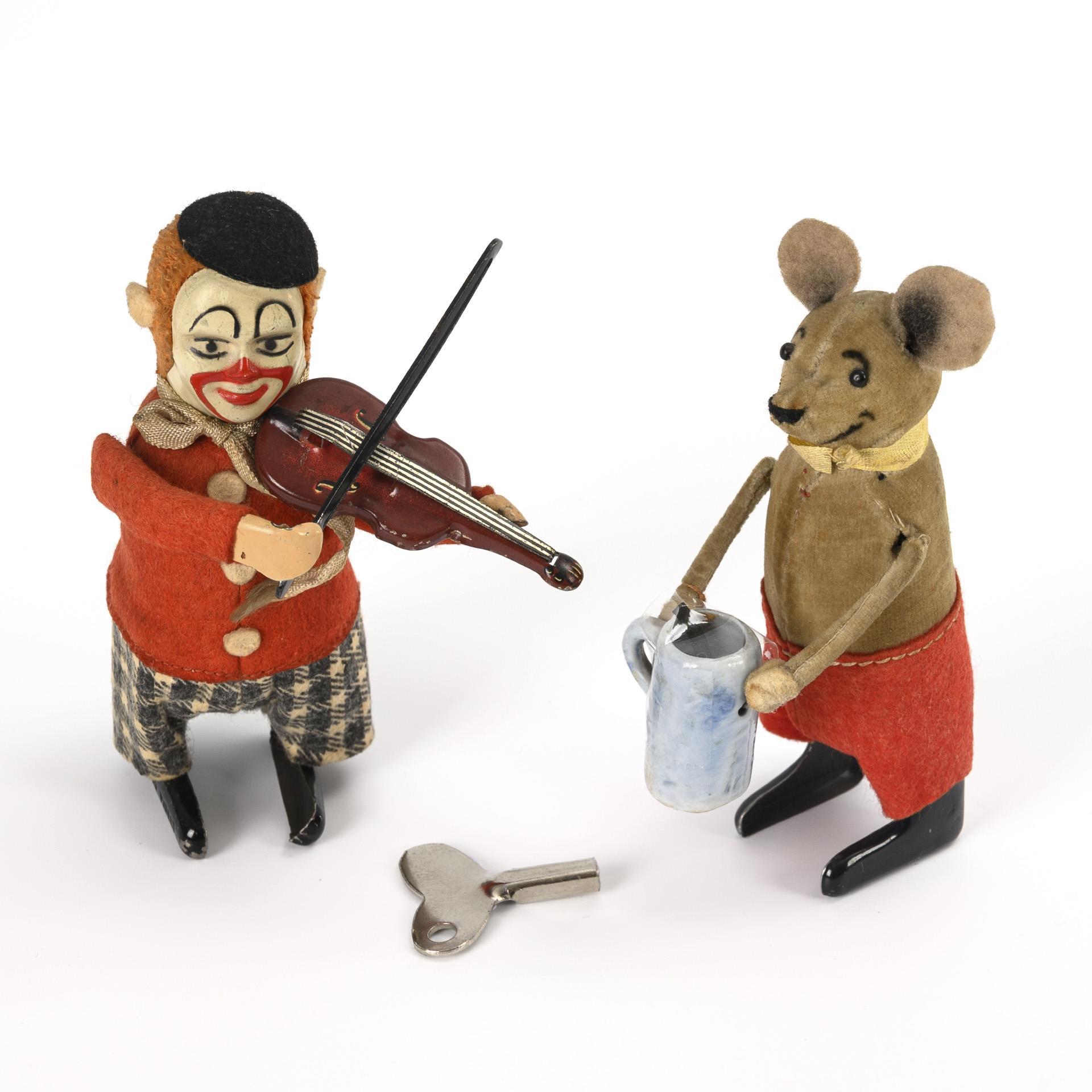 2 mechanische Figuren: Tanzfigur "Karikatur-Maus mit Bierkrug" (965). Fehlender Schwanz lose anbei. / Geigender Clown "Solisto" (986/2). 1 Fuß etwas verbogen. Beide mit intaktem Werk, dazu 1 Schlüssel. Altersspuren.