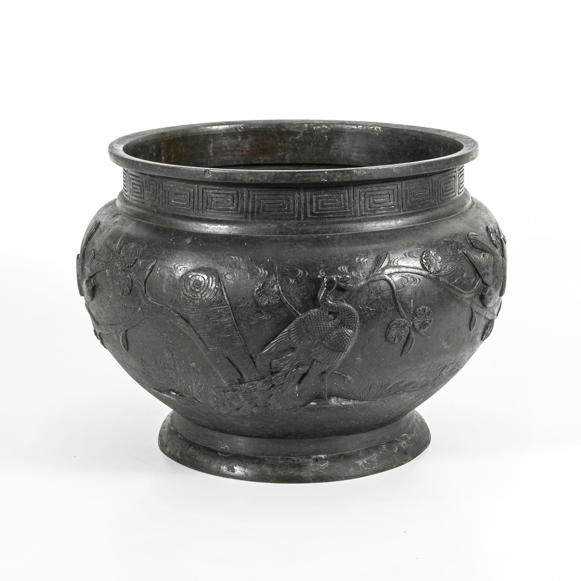 Wohl Blumengefäß mit Vogelrelief und umlaufendem Mäanderband. Nutzungsspuren, etwas fleckig und alte Reparaturspuren am Fuß und Innenrand.