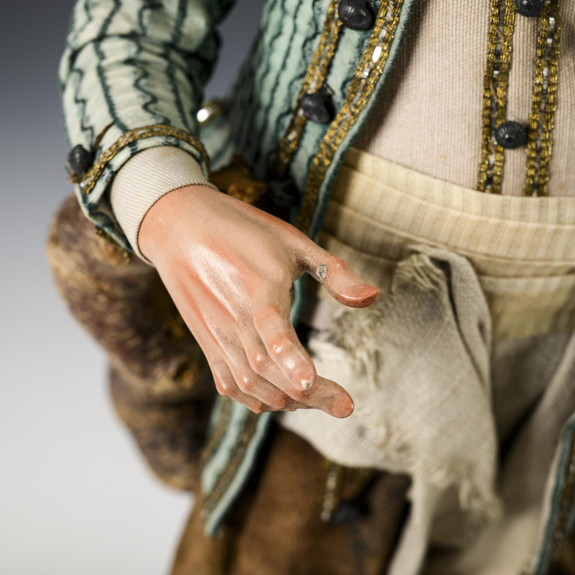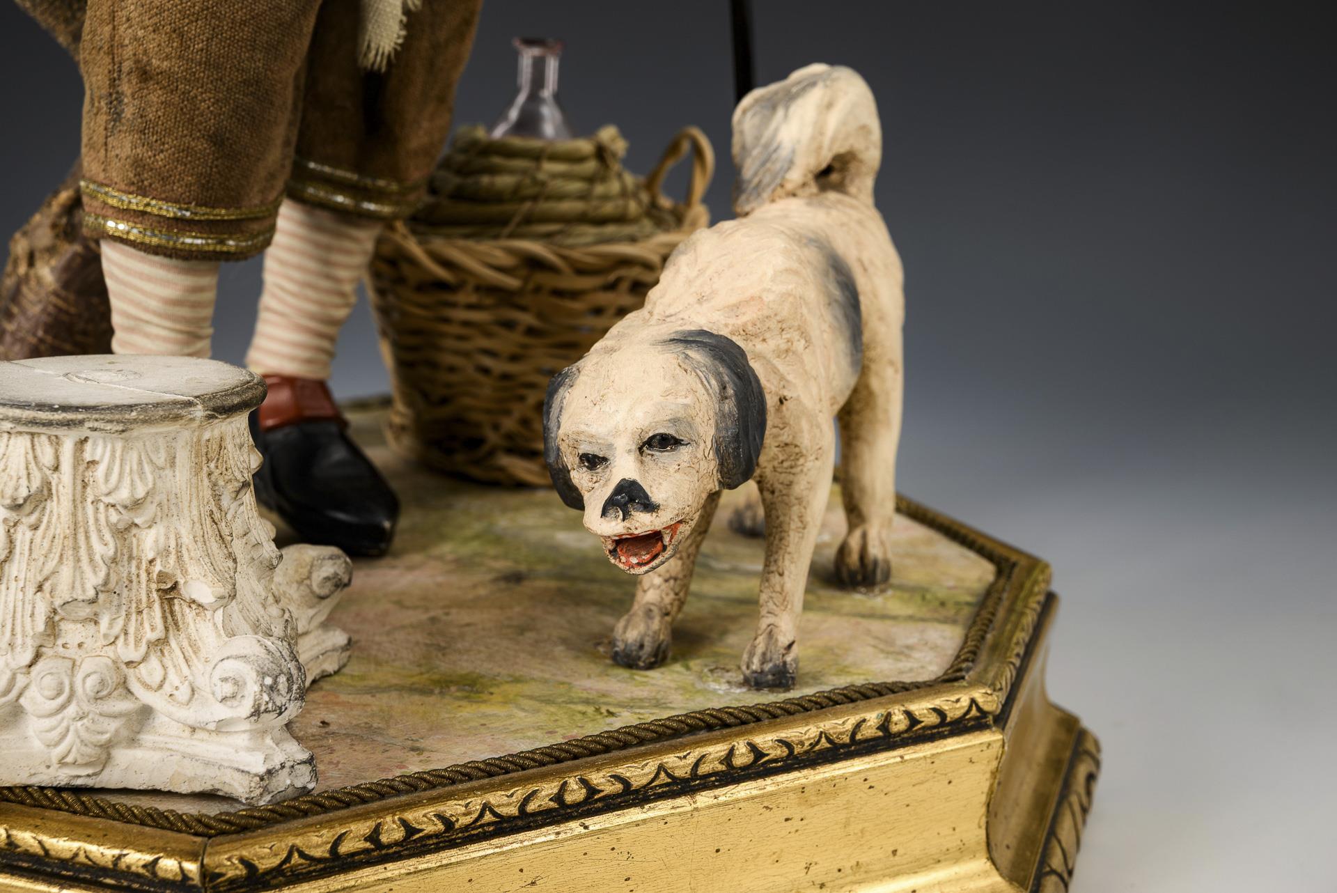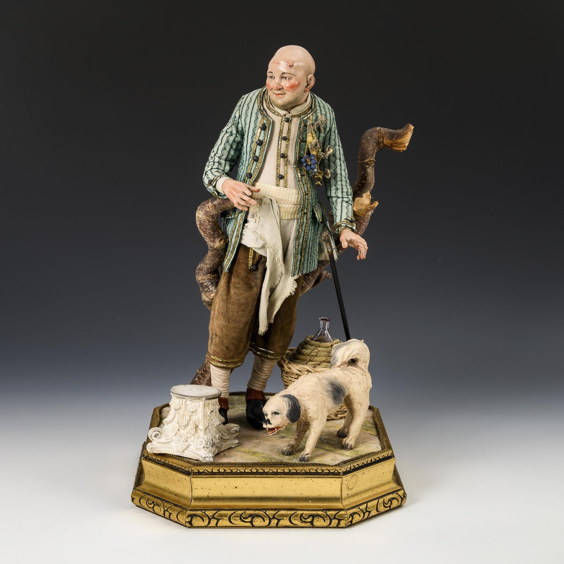 Neopolitanische Krippenfigur: Mann mit Hund auf einem Sockel.