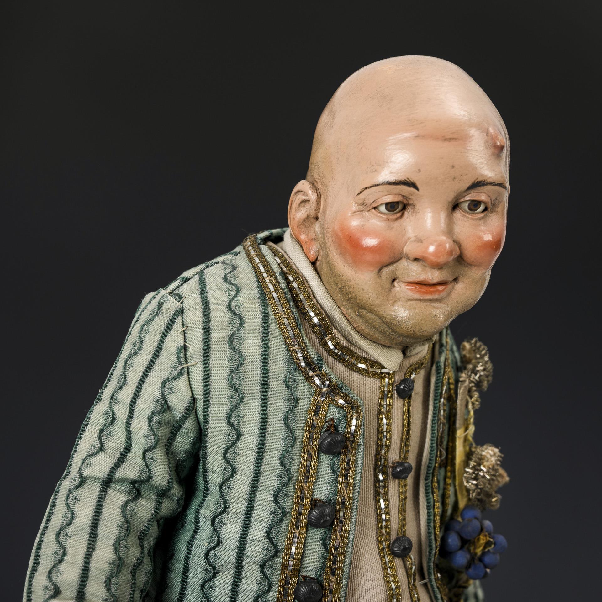 Reich gekleideter, glatzköpfiger Mann mit freundlichem Gesichtsausdruck und ausdrucksstarken Händen sowie Spazierstock mit versilbertem Adlerknauf. Auf dem Sockel ein Hund, ein Kapitell und ein Weinballon. Minimale Farbabplatzer an einer Hand.