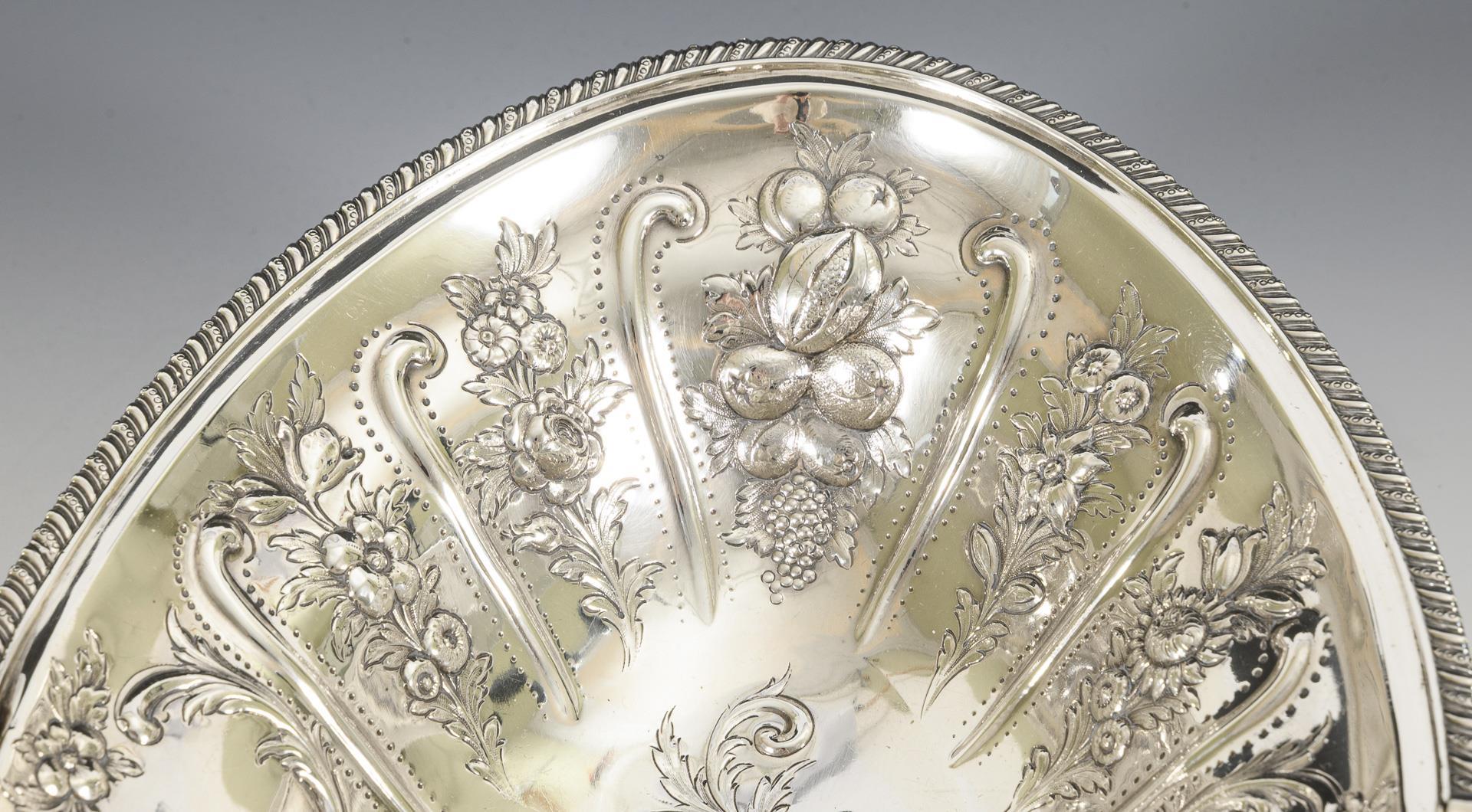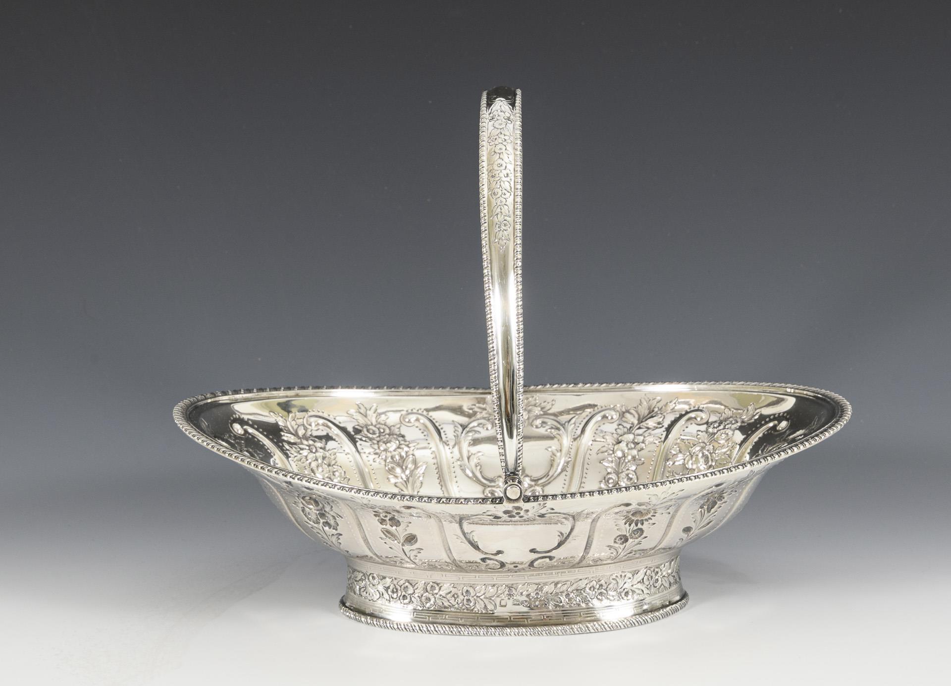 Ovaler, floral reliefierter Korb mit Scharnierhenkel.