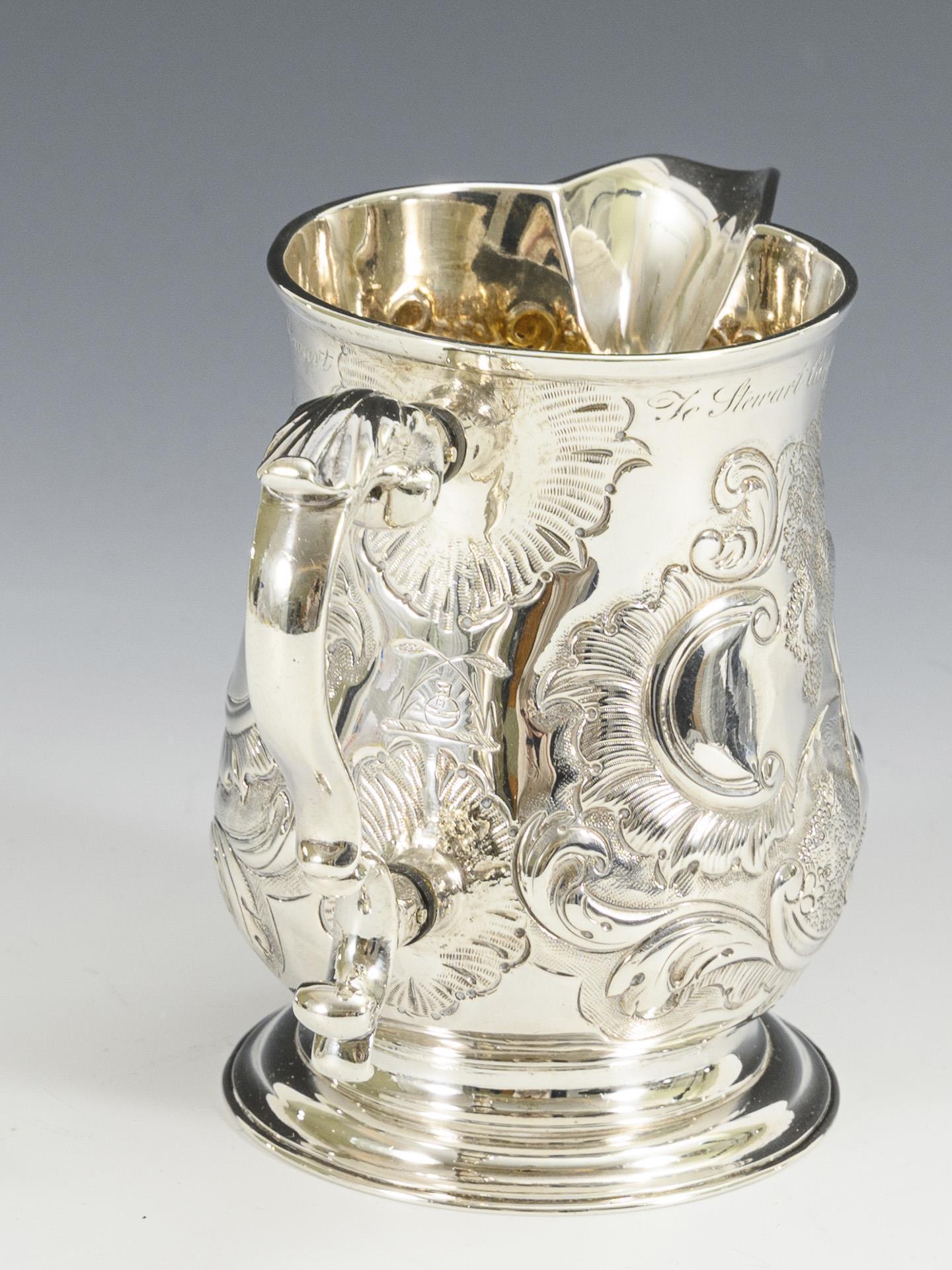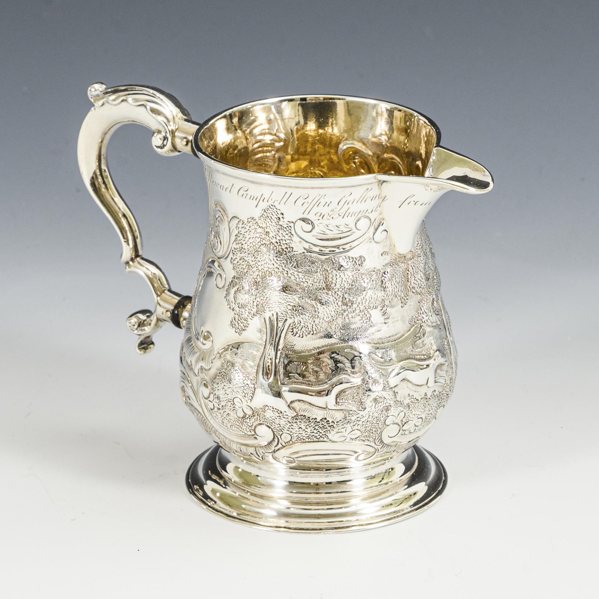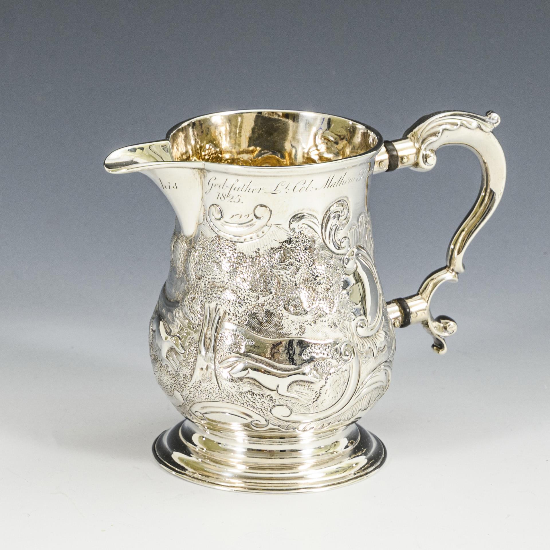 Reliefiertes Kännchen mit Fuchsjagd-Darstellung und Widmung: "To Stewart Campbell Coffin Galloway 20th August 1825 from his God-father Lt. Col. Mathew Stewart".