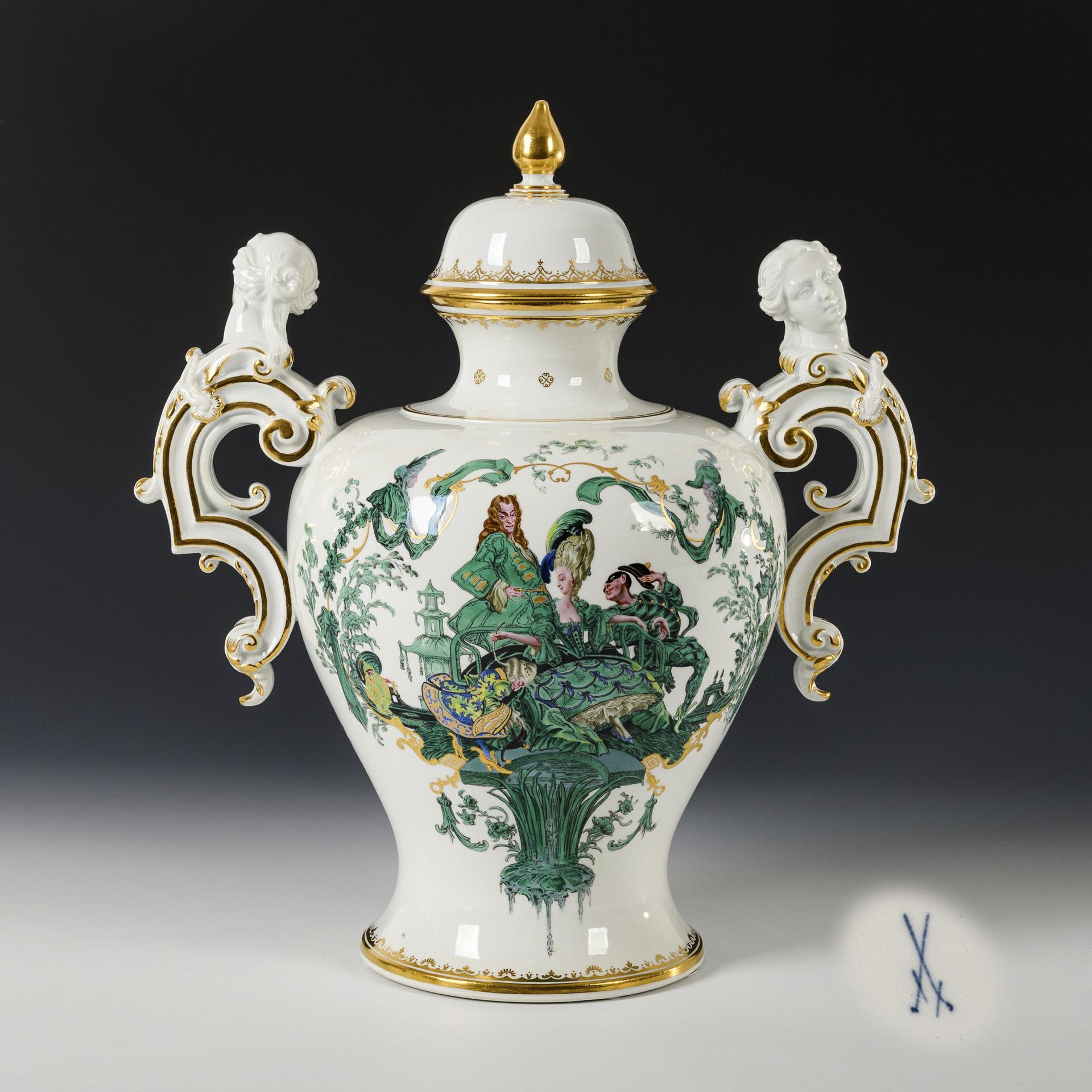 Balustervase mit zwei Frauenkopfhandhaben und Knaufdeckel. Schauseitig die sich an Rokokomotive anlehnende, karikierende Darstellung einer Rokokodame mit Kavalier, Diener und Harlekin.