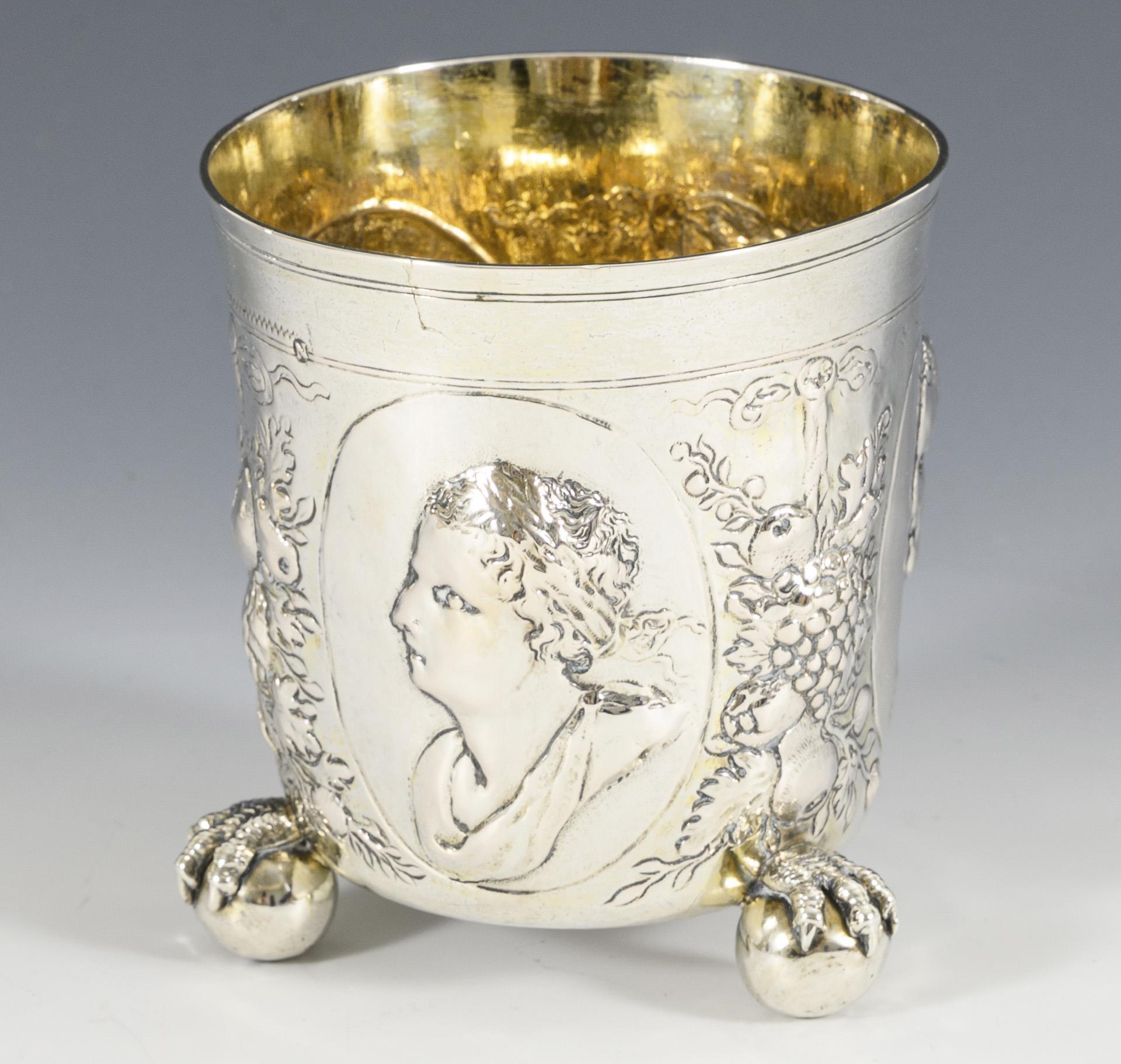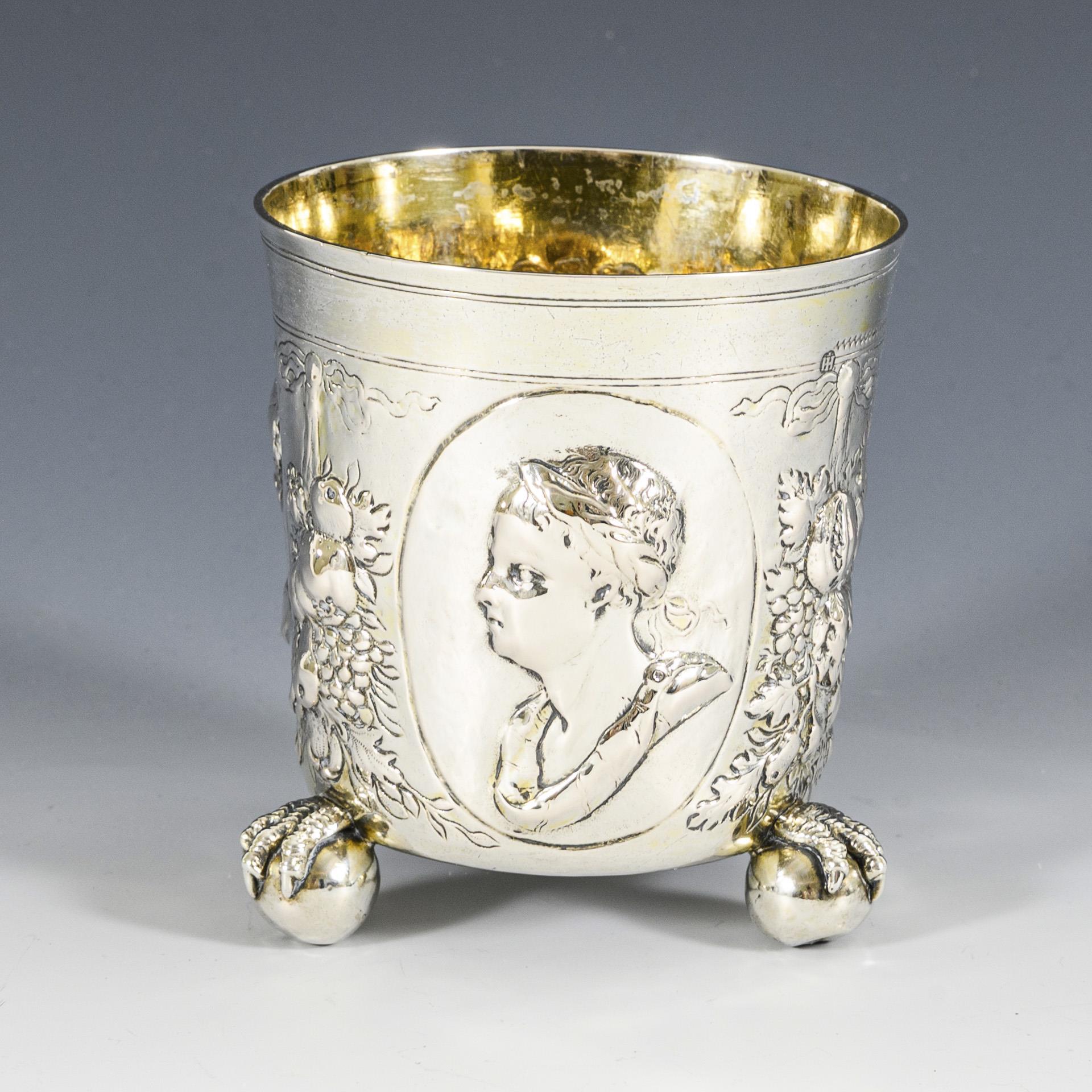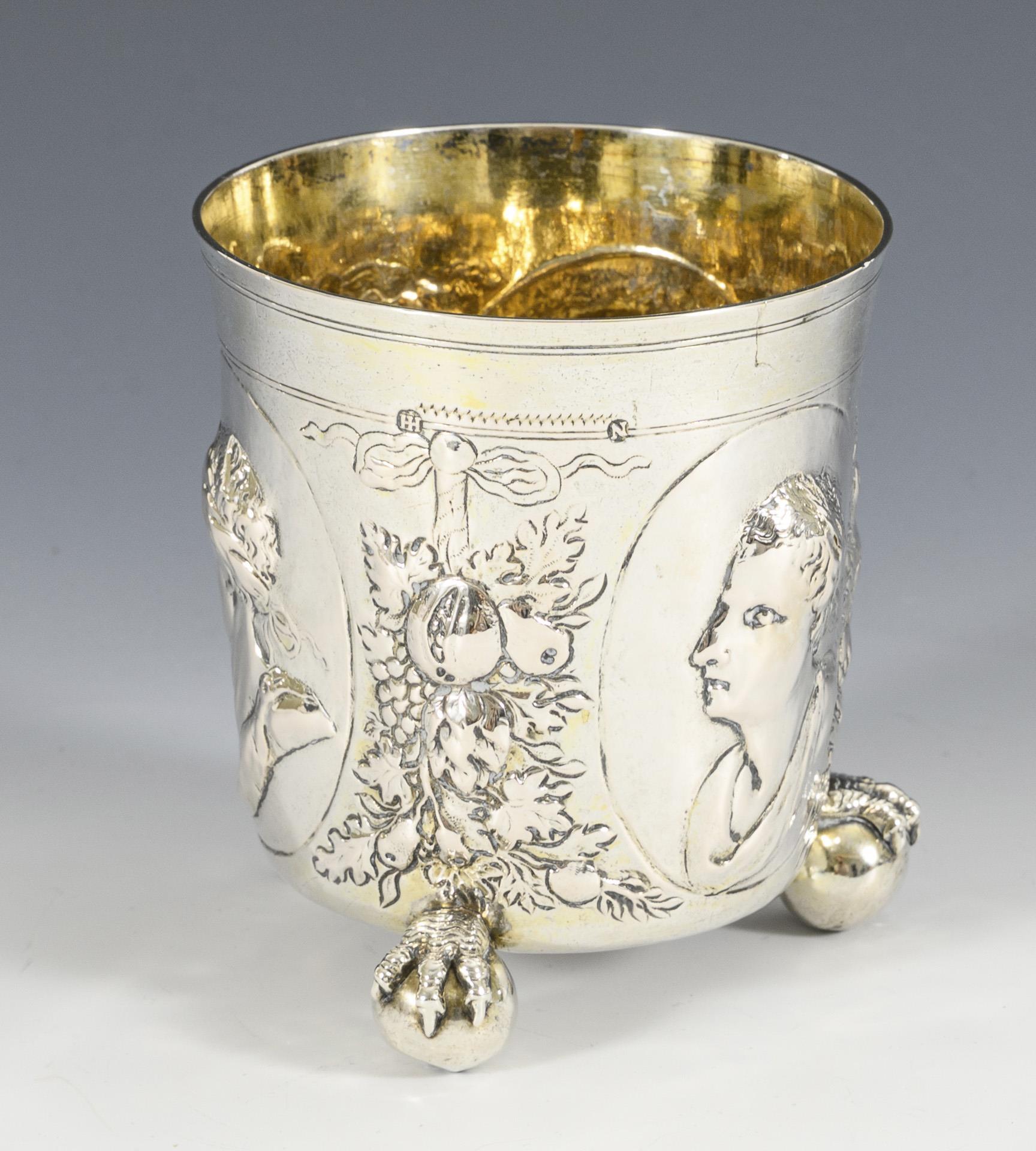 Reliefierter Becher mit 3 Bildnis-Medaillons, Fruchtgirlanden und Klauen-Kugel-Füßen. An einem der Köpfe 3 kleine Risse im Material (max. 3 mm).