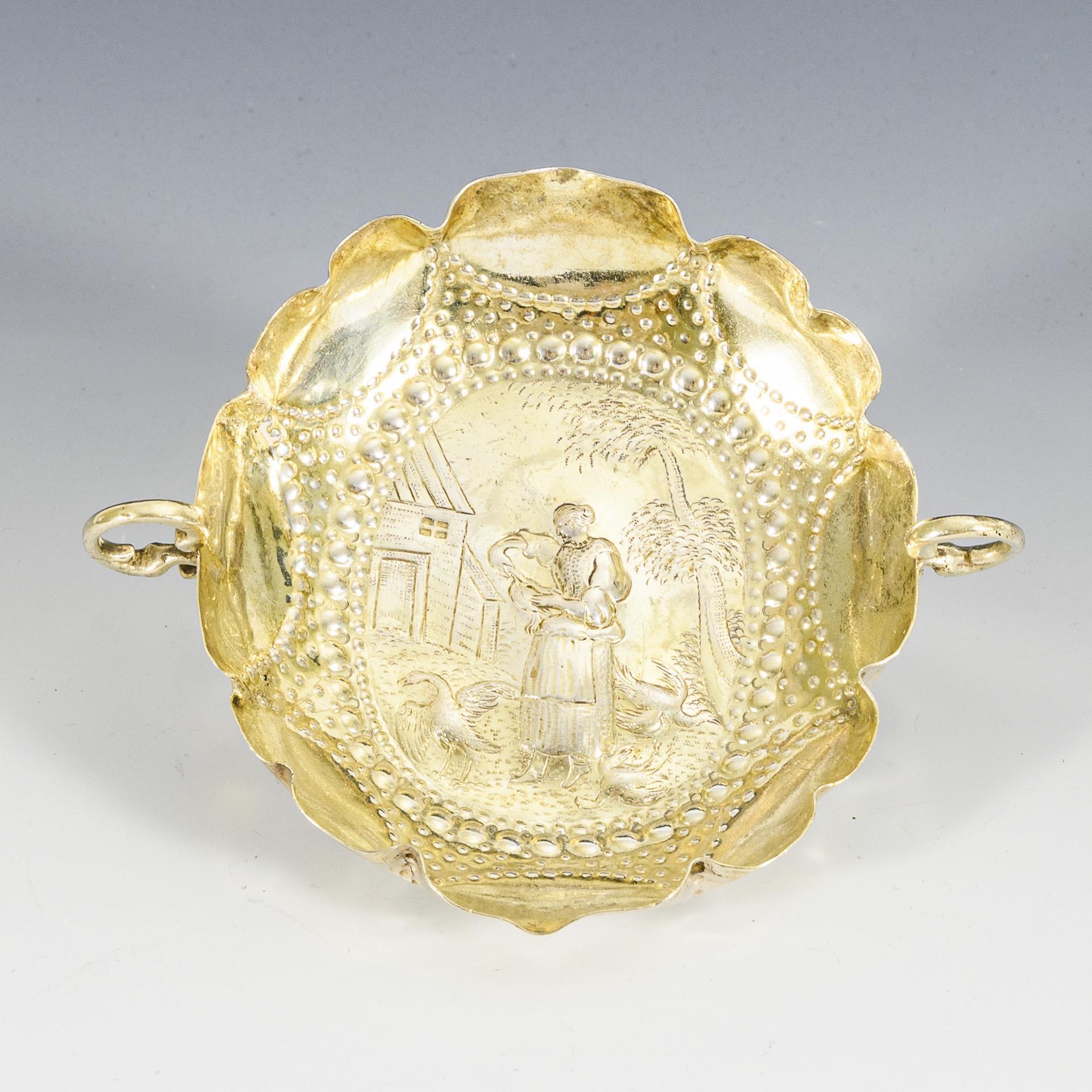 Kleine Henkelschale mit reliefiertem Gänsemagd-Motiv im Spiegel. 1 Henkel minimal gestaucht.