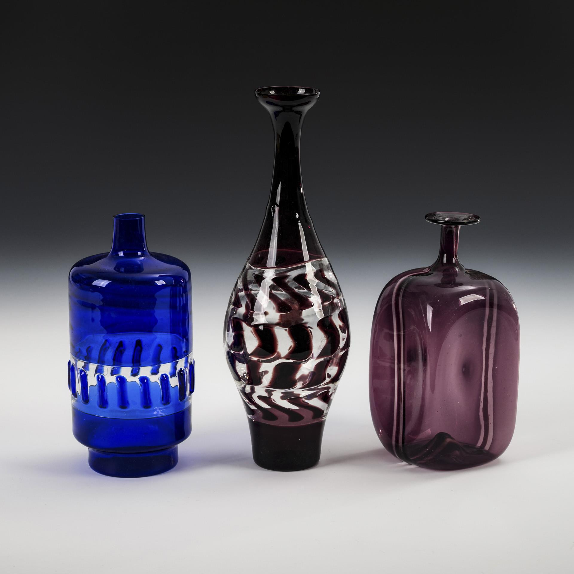 2 Vasen aus violettem und farblosem Glas. / 1 Vase aus kobaltblauem Glas.