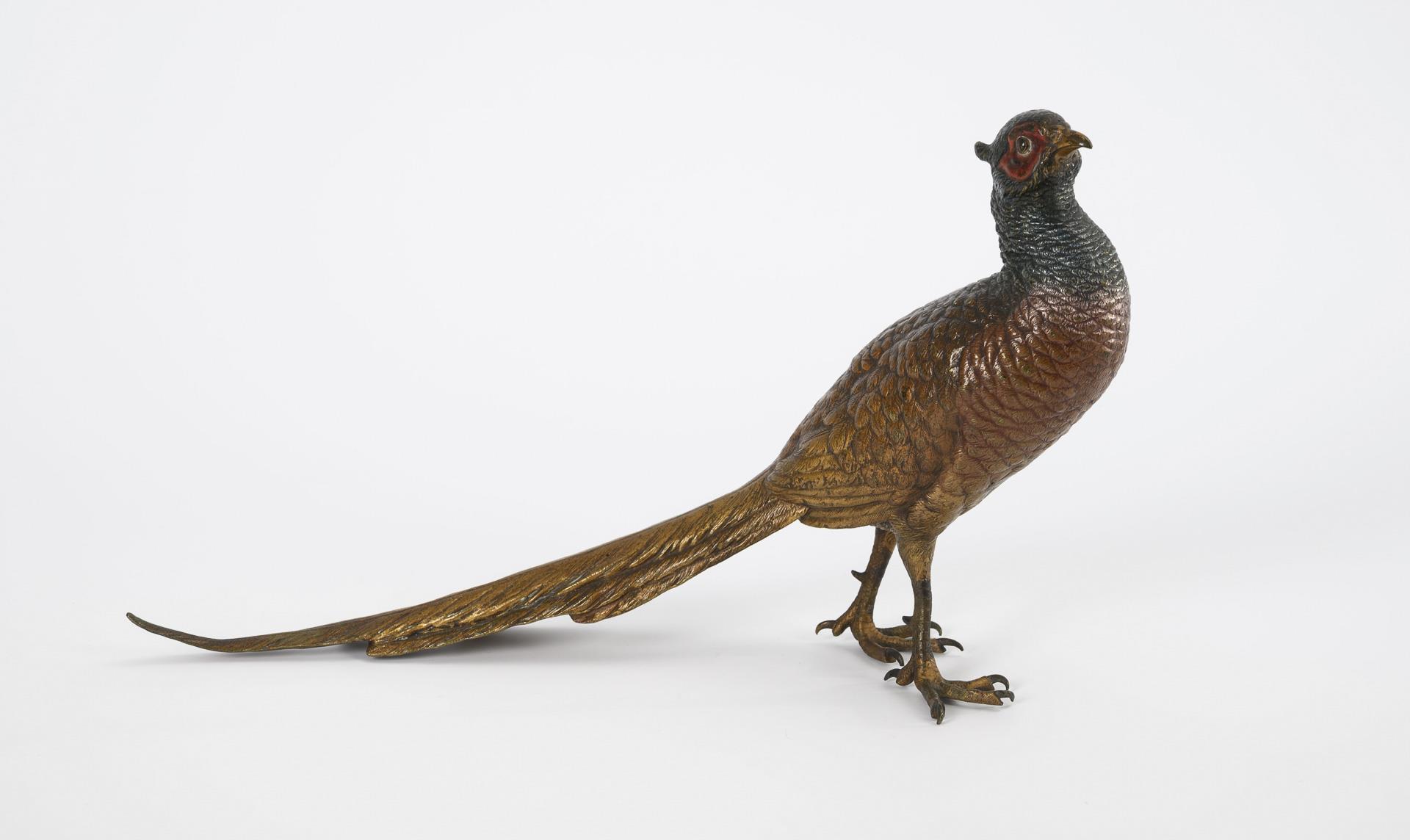 Detailgetreu realistisch gestalteter, prächtiger Jagdfasan mit aufmerksam erhobenem Kopf. Beine leicht verbogen, minimale Farbfehlstellen.