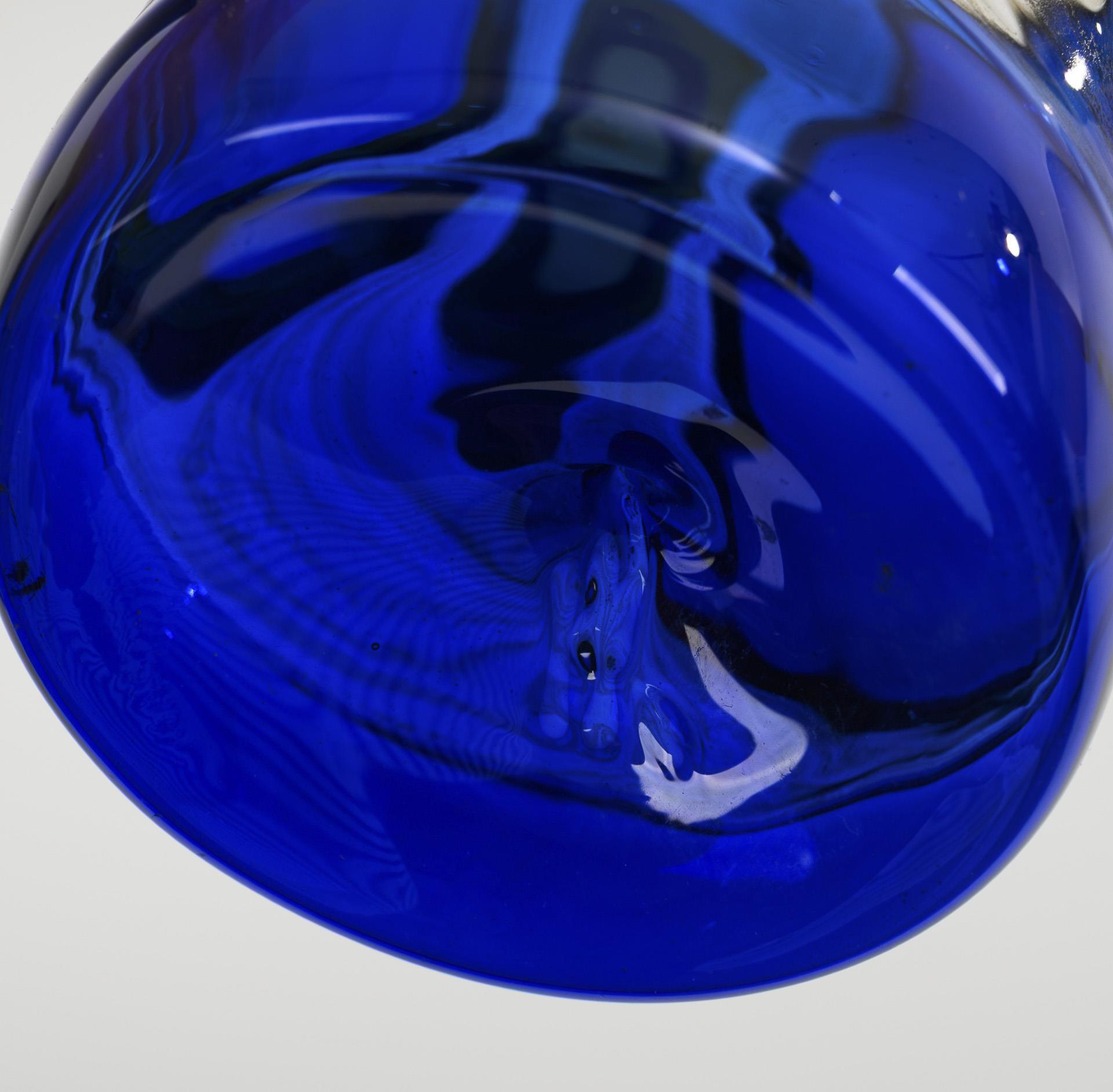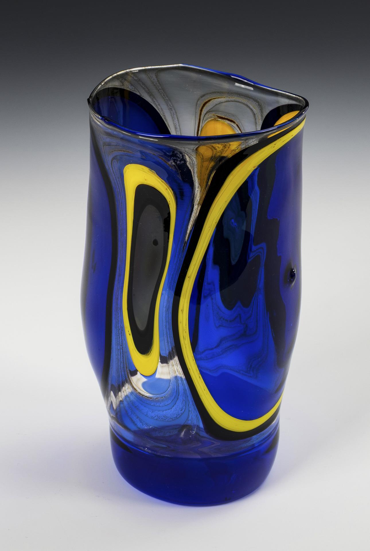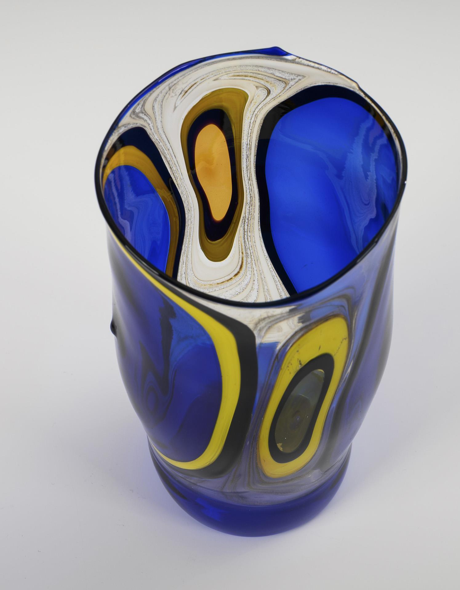 Montiertes und vor der Lampe geblasenes kobaltblaues, farbloses, bernsteinfarbenes und opakgelbes Glas, Glasemailaufschmelzung. H 19 cm. 180 g.