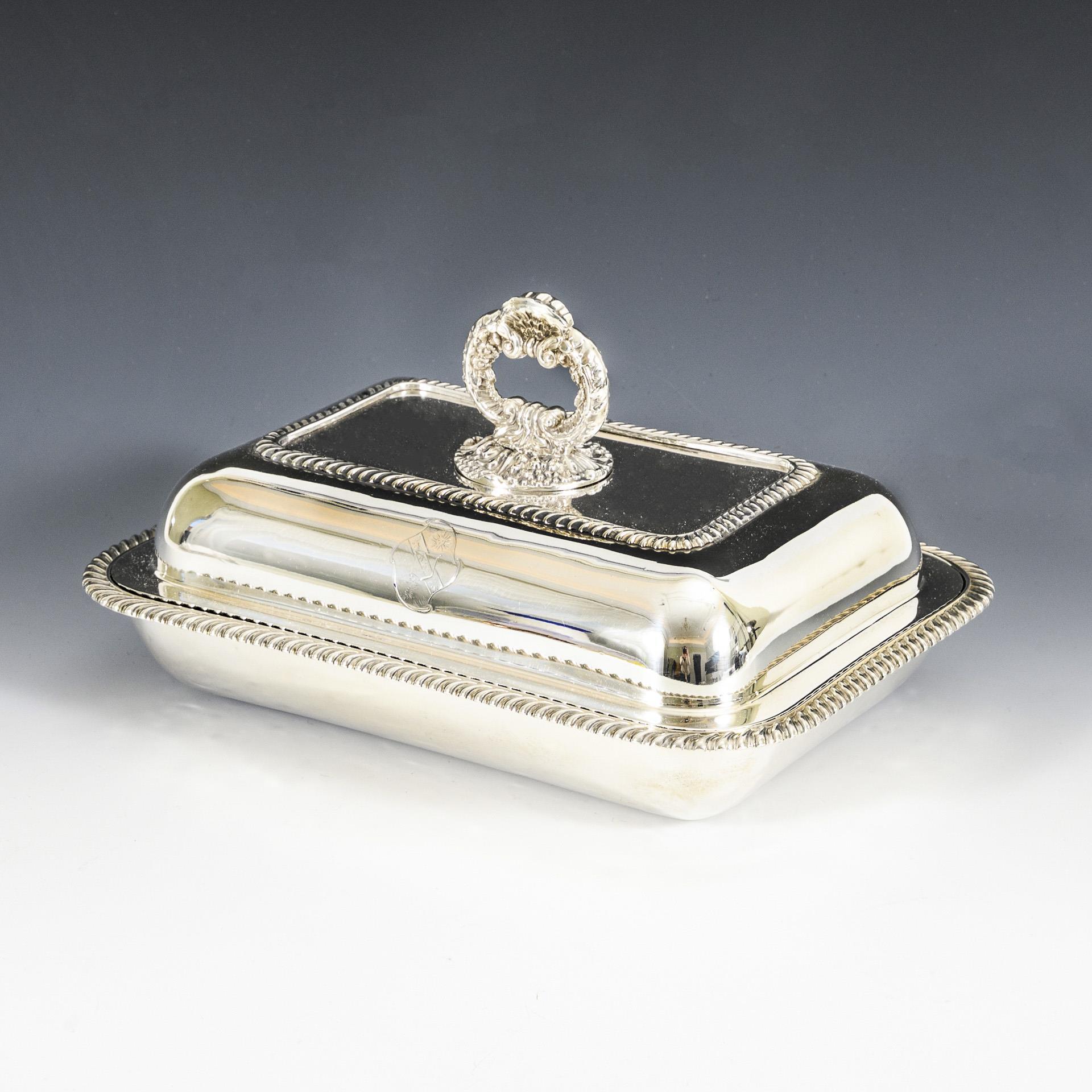 Gemüseschüssel mit Deckel, abnehmbarem Griff und Wappengravur (Wappen möglicherweise zu den Familien Brabazon (Earls of Meath) oder Harding gehörig).