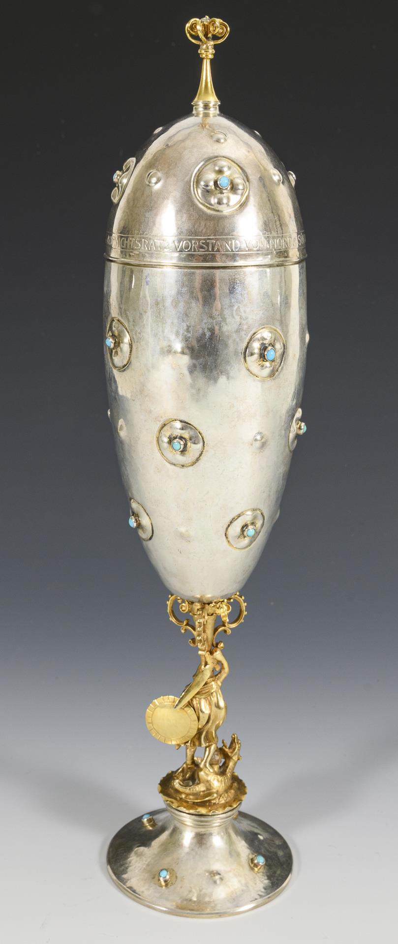 Schlanker, ovoider Korpus, auf vergoldetem Schaft. Verziert mit zahlreichen kleinen Türkis-Cabochons und Widmungsgravur am Deckel: "J/L. Scheidenden Kollegen z. frdl. Erinnerung Aufsichtsrat & Vorstand von Nord & Süd 1913". Ansatz der Kuppa mit Reparaturstelle innen.