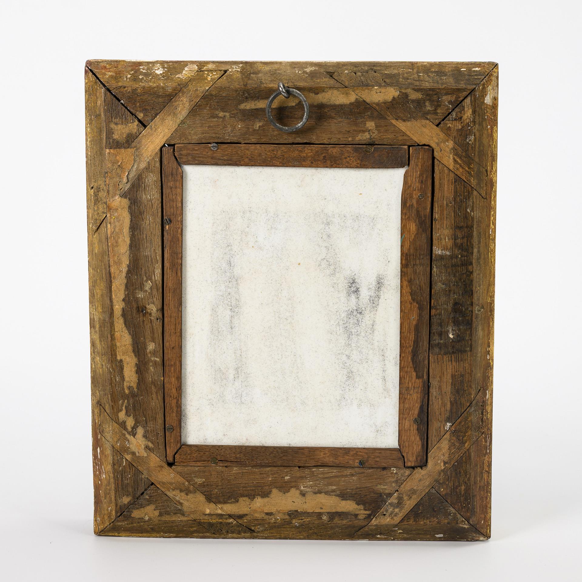 Polychrome Malerei. 20,5 x 16 cm, im Goldstuckrahmen (33,5 x 28,5 cm). Ca. 1,6 kg.