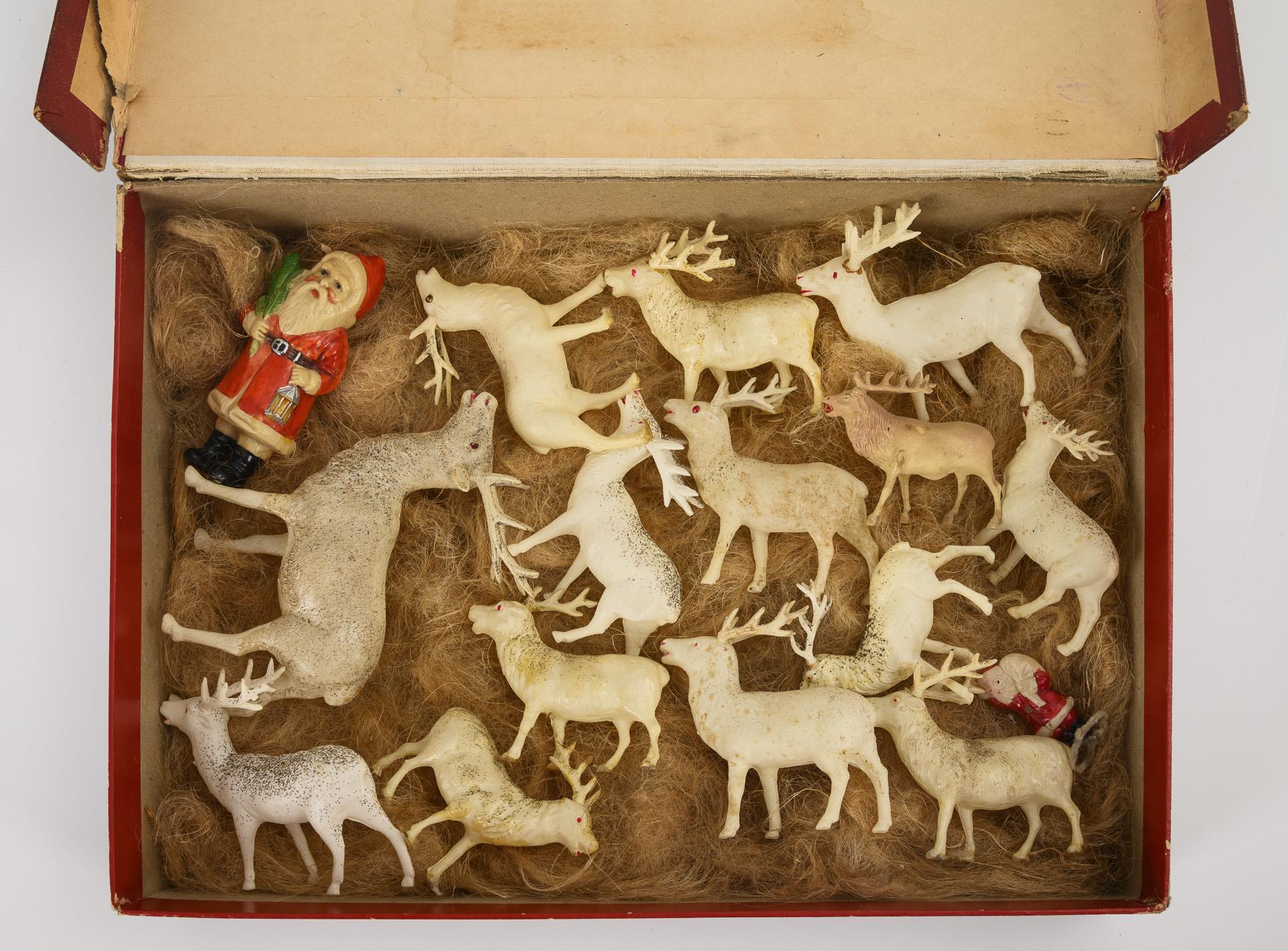 Bemalte Weihnachtsmänner (Juno bzw. Japan gemarkt). Dezent bemalte Hirsche teils mit Glitzer (häufig Japan gemarkt). 1 Geweih fehlt, teils Klebespuren. Alters-/Gebrauchsspuren am Karton.