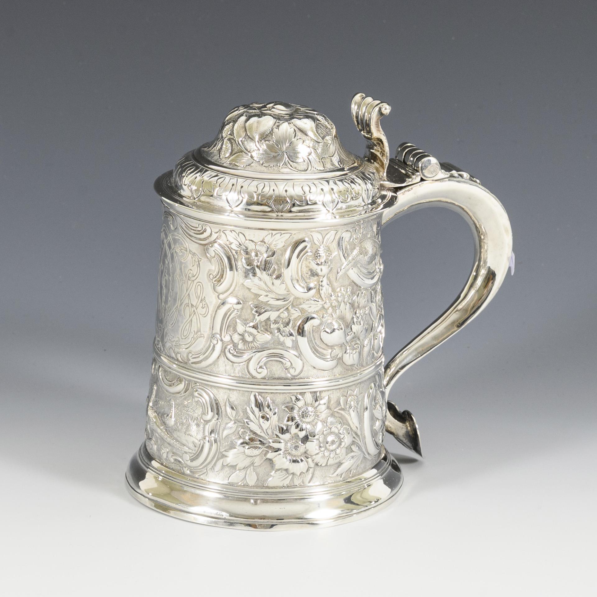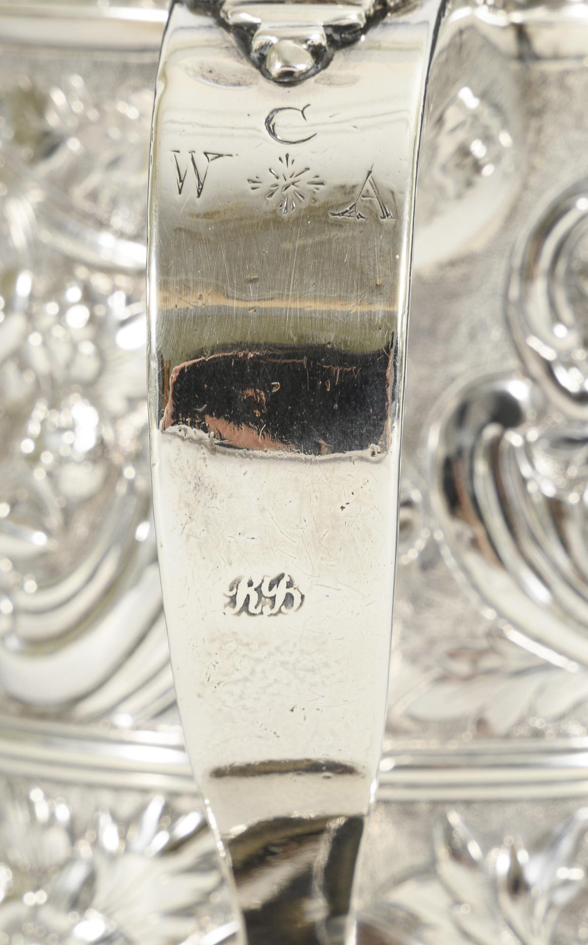 Silberkrug mit Blüten- und Rocaillenreliefs, schauseitiger Monogrammgravur und leicht gewölbtem Scharnierdeckel. Fußrand mit einer Delle, Haarriss am oberen Henkelansatz, innen 2 äußerlich kaum sichtbare, kleine Reparaturspuren.