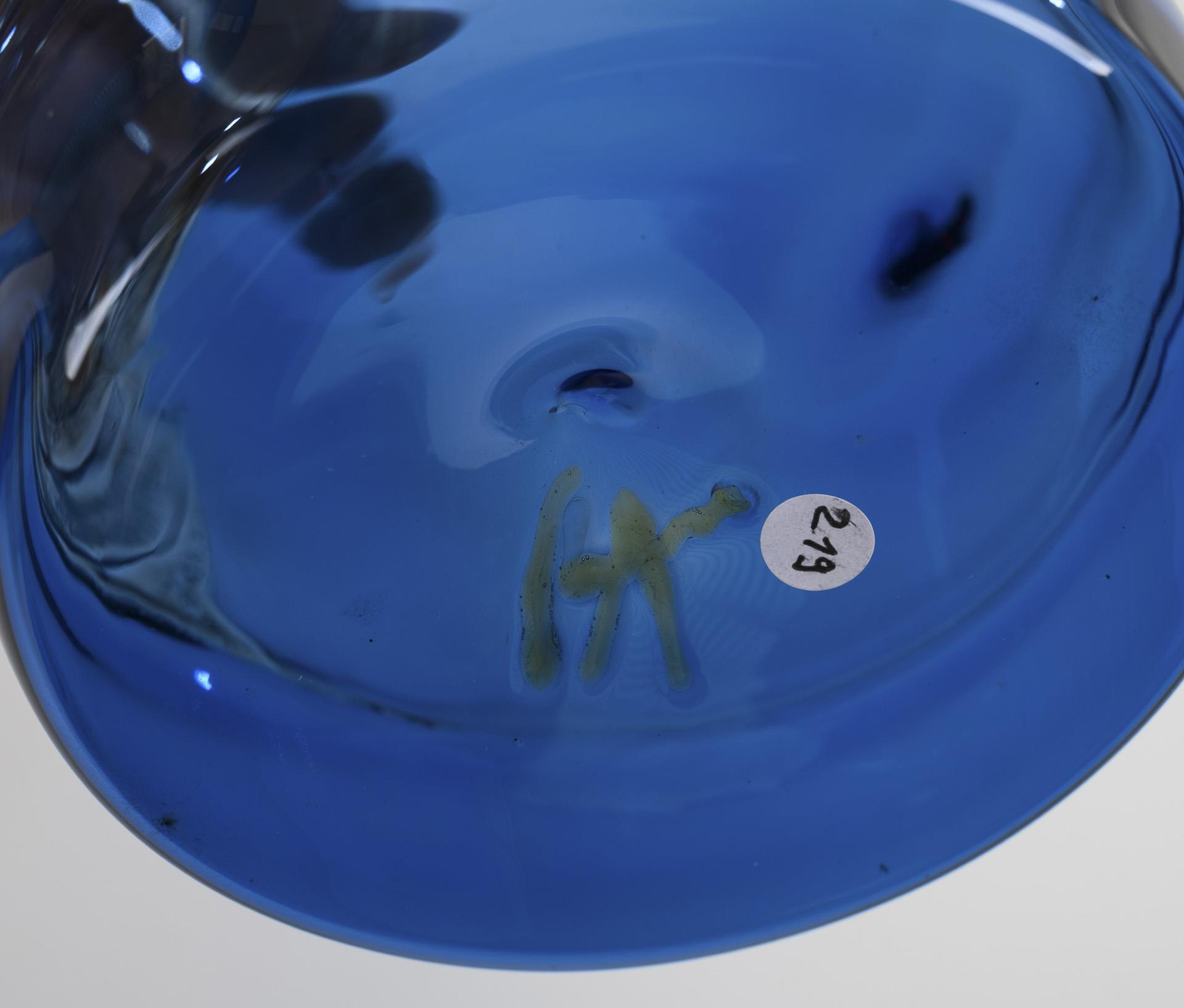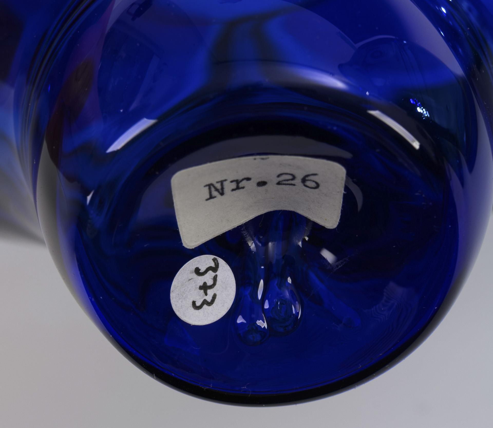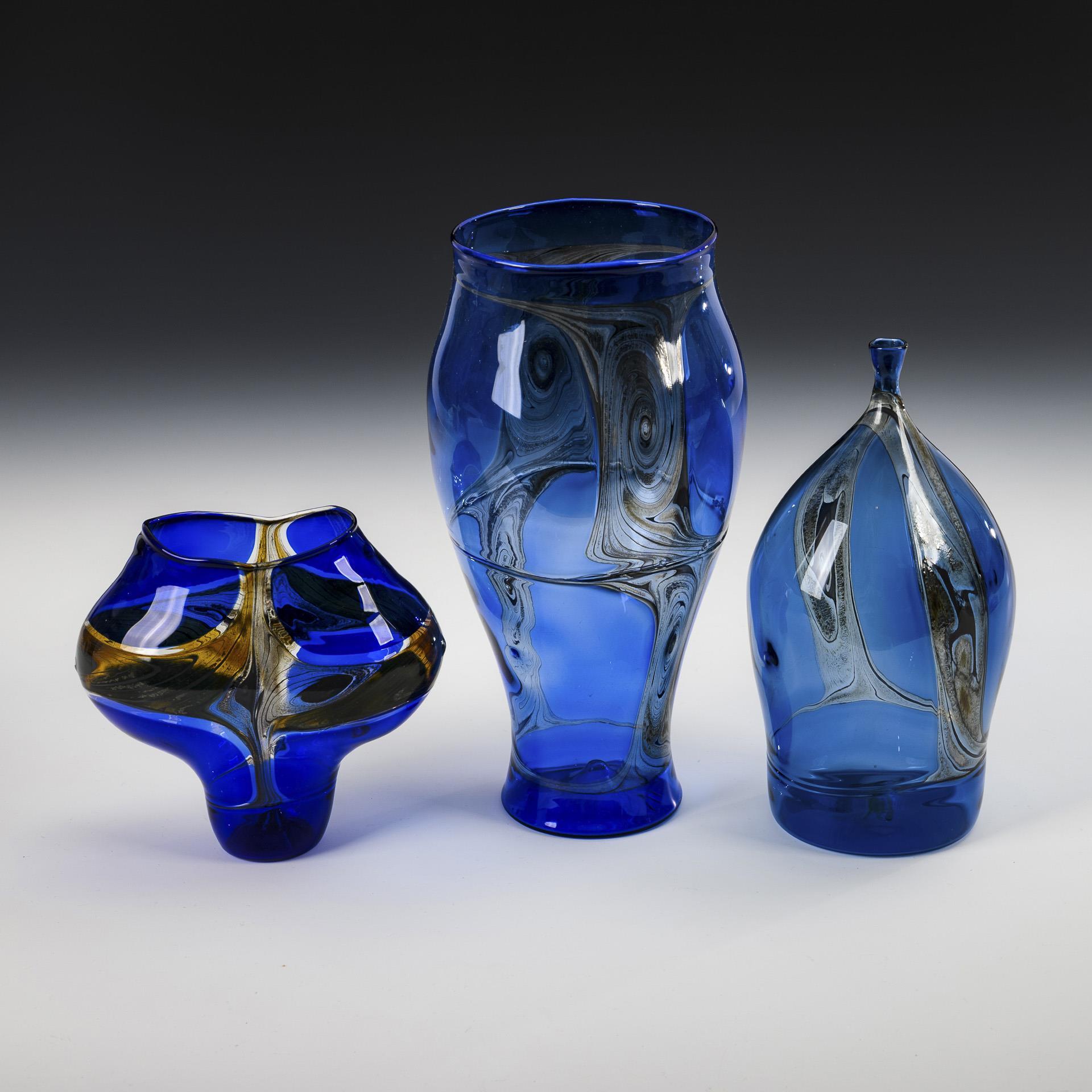 Montiertes und vor der Lampe geblasenes farbloses, blaues und 1x bernsteinfarbenes Glas, Glasemailaufschmelzung. H 25,5, 21,5 und 14 cm. 560 g.