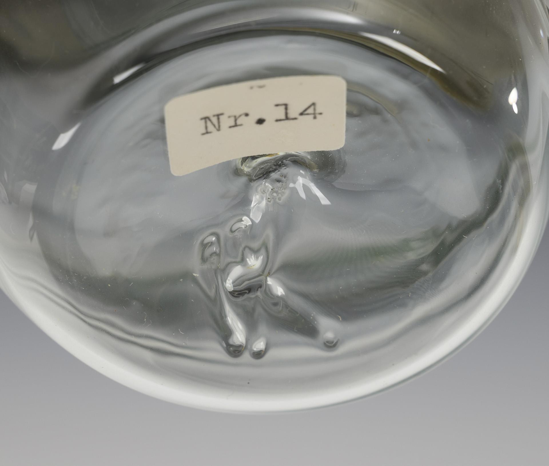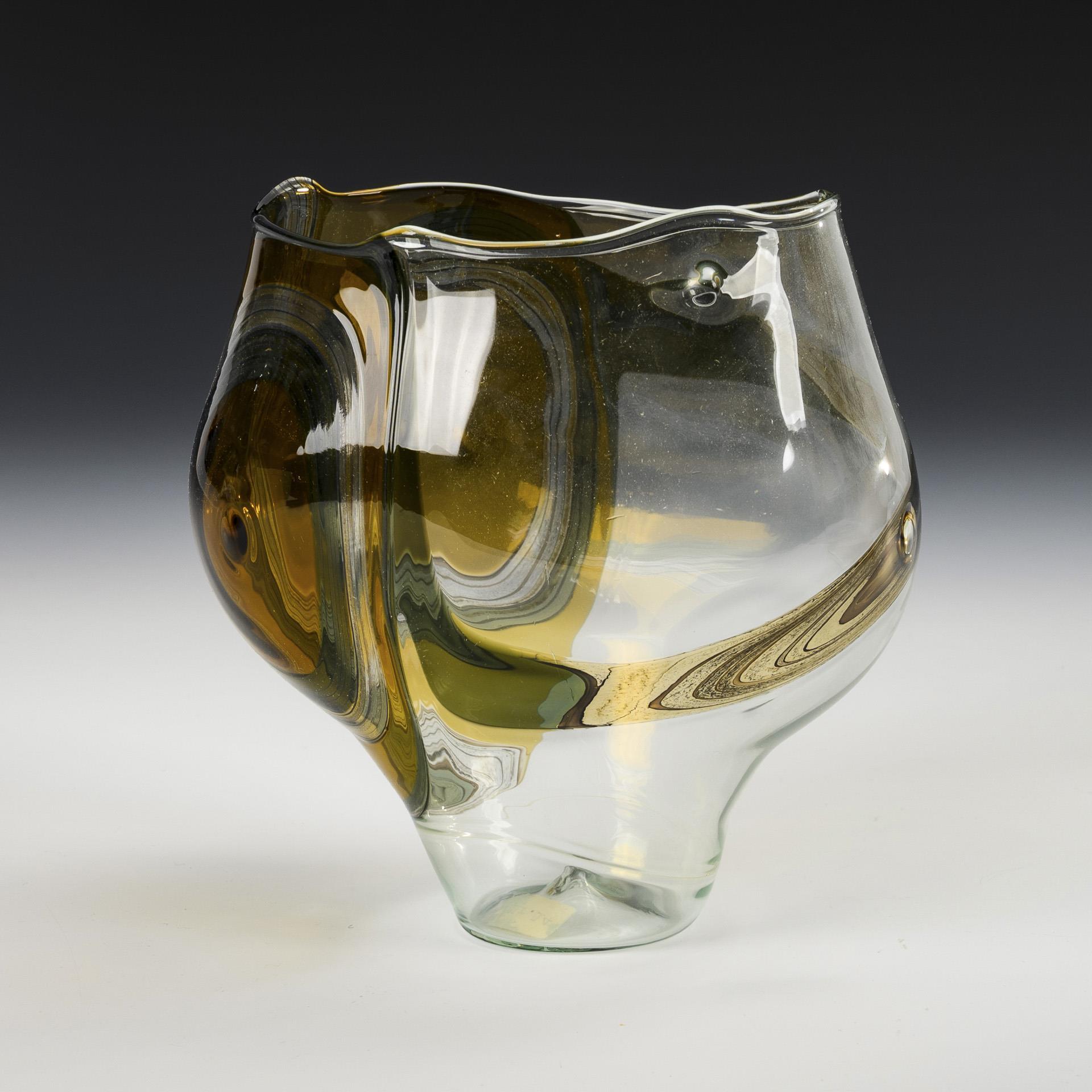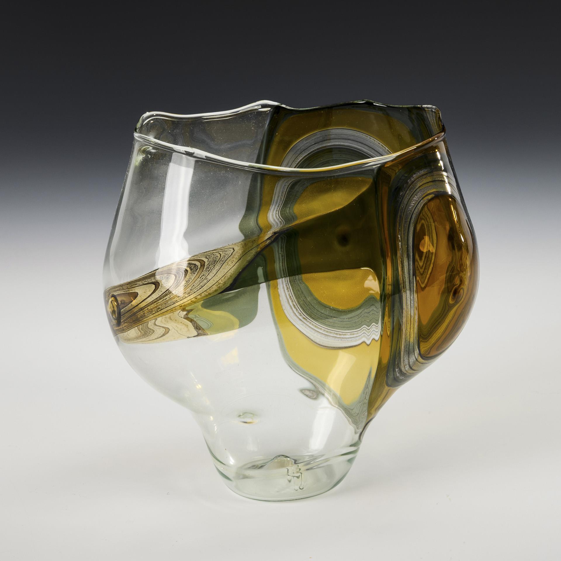 Montiertes und vor der Lampe geblasenes farbloses, olivgrünes und bernsteinfarbenes Glas, Glasemailaufschmelzung. H 17 cm. 210 g.