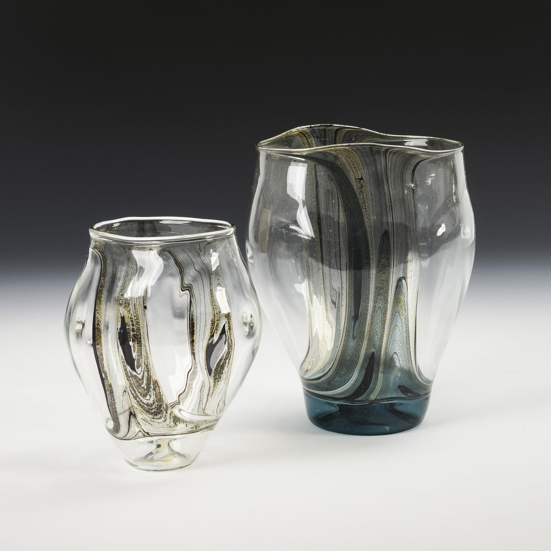 Montiertes und vor der Lampe geblasenes Glas, Glasemailaufschmelzung. H 18 und 13,5 cm. 350 g.