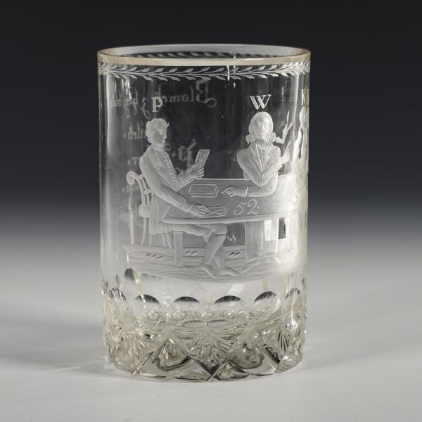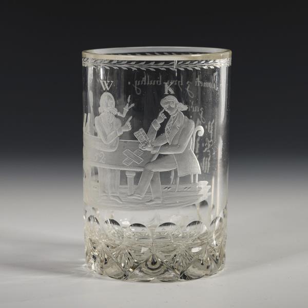 Zylinderbecher mit Linsenschliffband und Bodenstern. Schauseitig die gravierte Darstellung dreier mit Buchstaben bezeichneter Kartenspieler an einem Tisch, verso tschechich bezeichnet mit den Namen der Spieler "Blomek z hry bulky zaratej P. Aliter / K. Nedam. / W. Prohras.".