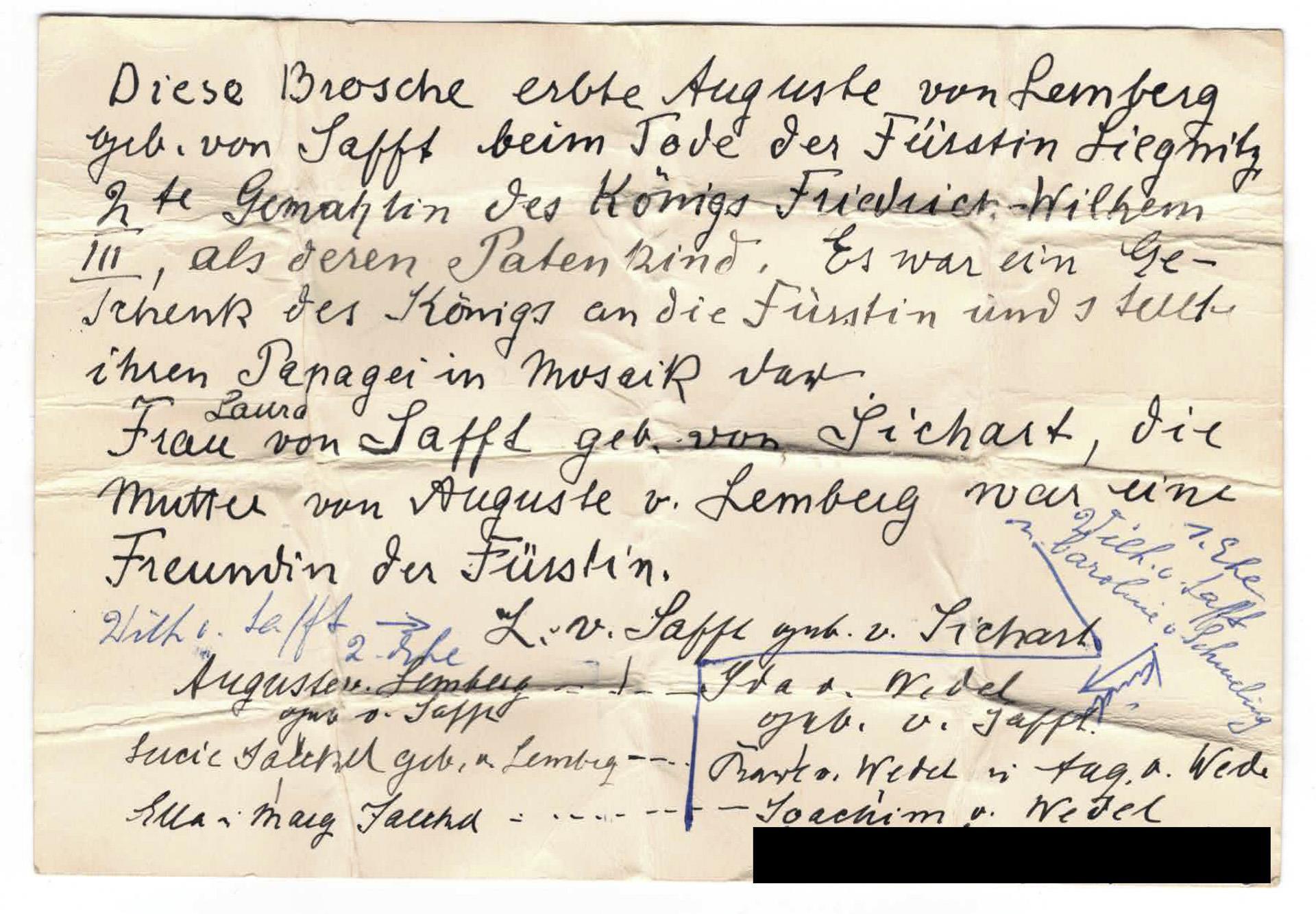 Provenienz : Beiliegend ein handschriftlicher Zettel, geschrieben von Laura von Safft, geb. von Sichart: "Diese Brosche erbte Auguste von Lemberg geb. von Safft [Tochter der Laura von Safft] beim Tode der Fürstin von Liegnitz, 2te Gemahlin des Königs Friedrich-Wilhelm III, als dessen Patenkind. Es war ein Geschenk des Königs an die Fürstin und stellte ihren Papagei in Mosaik dar. L. von Safft geb. v. Sichart. [Nachfolgend biografische Angaben, von zwei späteren Händen bis zur Großmutter des Einlieferers ergänzt]" Ein weiterer Zettel von der Großmutter des Einlieferers, Geschenkverweis zu Weihnachten als Geschenk an Schwiegertochter, liegt ebenfalls vor: "Diese Brosche stammt a. d. Besitz König Friedr.-Wilhelm III. Nach d. Tode der Königin Luise liess er seiner zweiten Frau, der Fürstin Liegnitz, deren Papagei in Mosaik arbeiten. Die Schwester meiner Urgroßmutter (Ida v. Wedel geb. v. Safft) Auguste v. Lemberg geb. v. Safft erbte als Patenkind der Fürstin die Brosche. Frau v. Lemberg vererbte sie an ihre Enkelin Ella Jaeckel, die mir den Schmuck zum Geschenk machte. [Name] Weitergegeben zu treuen Händen an [Name d. letzten Besitzerin] Weihnachten 1983".ANMERKUNG DES AUKTIONSHAUSES: Die Provenienz der Weitergabe im Erbgang ist nicht durch das Testament der Fürstin von Liegnitz belegbar. Allerdings ist eine Weitergabe als Schenkung noch zu Lebzeiten oder nach dem Tod der Fürstin durch ihre Familie zu Andenkenzwecken durchaus plausibel und den fürstlichen Geschenkpraktiken entsprechend. Die auf dem der Brosche beiliegenden Besitzvermerkszettel aufgezeichneten Personen Auguste von Lemberg, geb. von Safft und ihre Tochter Lucie Jaeckel, geb. von Lemberg, wurden anderweitig im Testament der Fürstin bedacht: im 1. Kodizill (Fol. 22) wird eine Zahlung an Auguste von Lemberg veranlasst: "Frau Auguste von Lemberg, geb. von Safft in Hirschberg, hinterlasse ich die Summe von 2000 rt." Im 9. Kodizill wird eine finanzielle Unterstützung der Tochter Lucie von Lemberg aus dem Vermögen der Fürstin festgelegt, die so lange zu zahlen sei, bis ihr zu dieser Zeit Verlobter und späterer Ehemann, ein Leutnant Jaeckel, den Rang eines Hauptmanns 1. Klasse erreicht habe. (vgl. Fol. 31). Diese testamentarischen Zuwendungen der Fürstin an die beiden Genannten legt ein enges freundschaftliches Verhältnis nahe, das durch Briefe der Auguste von Harrach unterstützt wird; so quartierte sie z. B. eine enge Freundin zeitweise für einen Besuch im Elternhaus der Auguste von Safft ein oder bat deren Mutter Laura von Safft um Ratschläge zur Auswahl einer Kinderfrau für ihren Neffen Ferdinand (vgl. Harrach, Wichard von, S. 69 und 147). Auch die Vorliebe der Fürstin für Papageien ist belegt; beispielsweise erwähnt sie in einem Brief ein von ihr als Haustier gehaltenes Exemplar, das "Auguste, Du Spitzbub", "Auguste bonjour" und "Auguste adieu" sagen konnte (vgl. Harrach, Wichard von, S. 124), ein weiterer Papagei aus ihrem Besitz soll, so die bekannte Salonnière Rahel Varnhagen, von Friedrich Wilhelm III. 1827 an die Opernsängerin Henriette Sontag verschenkt worden sein (vgl. Habermann, Paul und Gisela, S. 80).Zusätzlich entspricht der Stil der Brosche als Mikromosaikarbeit nicht nur dem modischen Zeitgeschmack, sondern ebenfalls dem der italienischen Kunst sehr zugewandten persönlichen Kunstgeschmack König Friedrich Wilhelms III. Vor diesem Hintergrund sowie der handschriftlichen Dokumentation entsprechend erscheint eine (wohl noch zu Lebzeiten erfolgte) Schenkung der Brosche an Auguste von Lemberg und eine Weitergabe innerhalb ihrer weiblichen Nachkommenschaft plausibel, kann aber nicht mit letzter Sicherheit belegt werden.