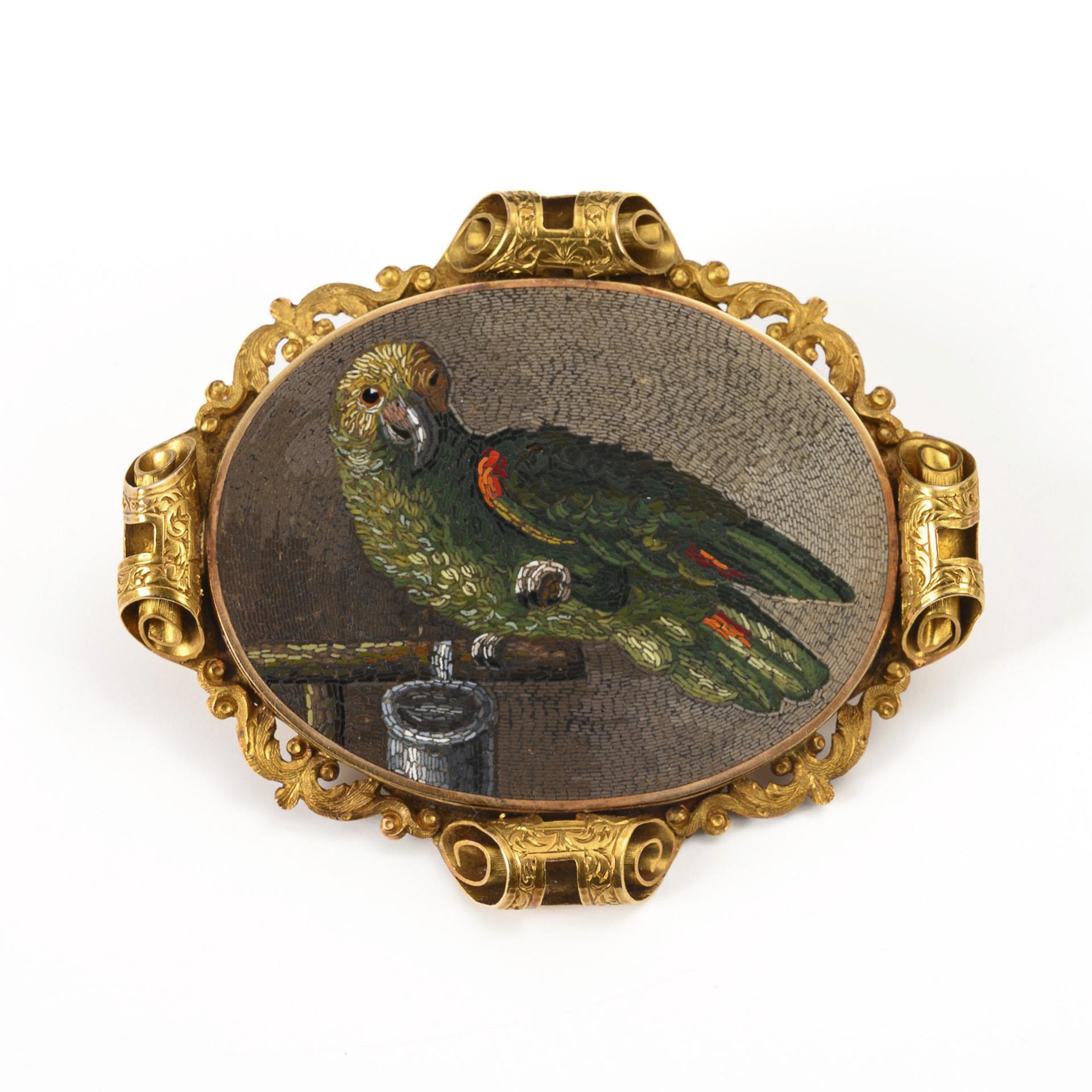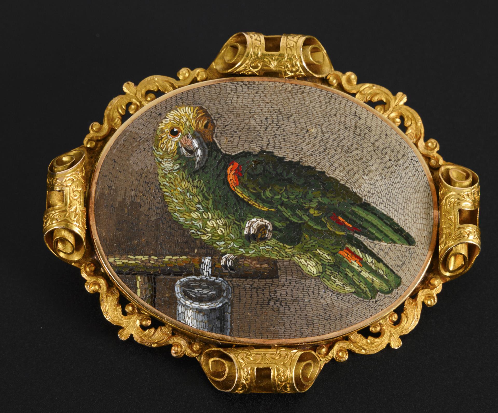 Historische Mikromosaik-Brosche wohl aus dem Besitz der Auguste von Harrach, Fürstin von Liegnitz (1800-1873), zweite Ehefrau des preußischen Königs Friedrich Wilhelm III. (1770-1840). In einem reich verzierten Goldrahmen das Mosaikbild eines auf einer Stange mit Napf sitzenden grünen Papageien mit gelbem Kopf und einzelnen roten Federn an Schwanz und Flügeln. Der Überlieferung zufolge soll es sich bei dem dargestellten Tier um den Lieblingspapageien der Fürstin handeln, die Brosche selbst soll von Friedrich Wilhelm III. als Geschenk an seine Frau in Auftrag gegeben worden sein. Ein Mosaikstein am Flügelansatz fehlt.