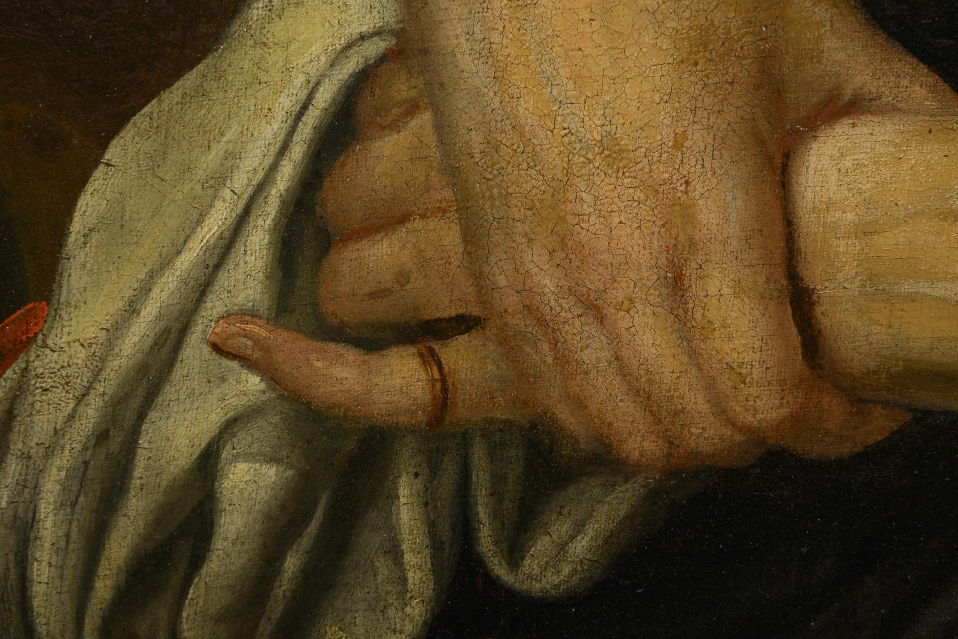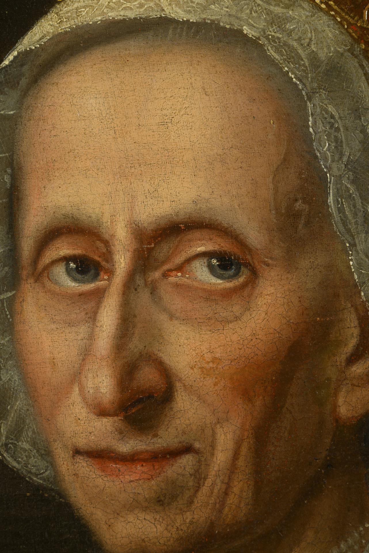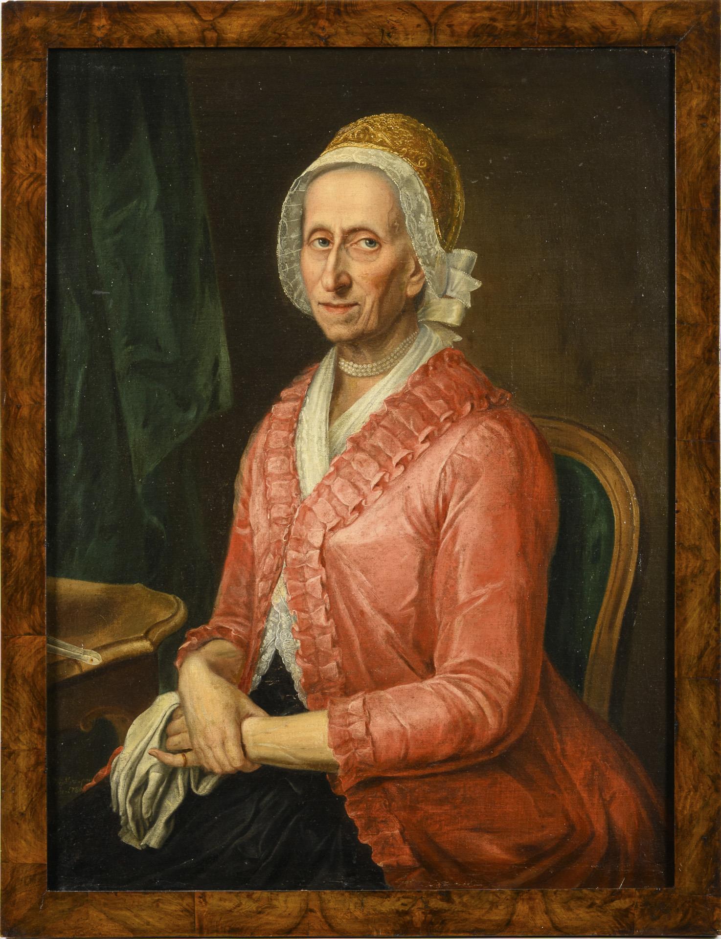 Qualitätvolles Porträt einer älteren Frau mit Haube und im rosafarbenen Oberteil mit schwarzem Rock. Leinwand doubliert.