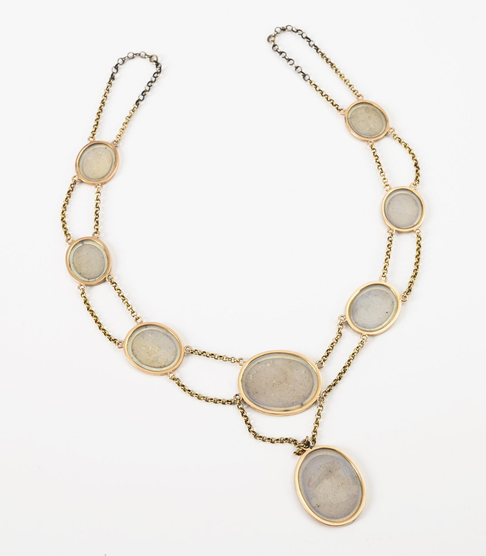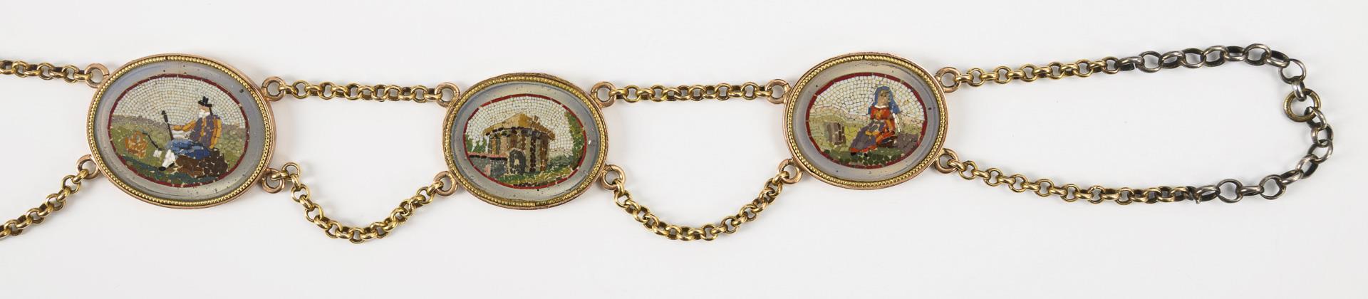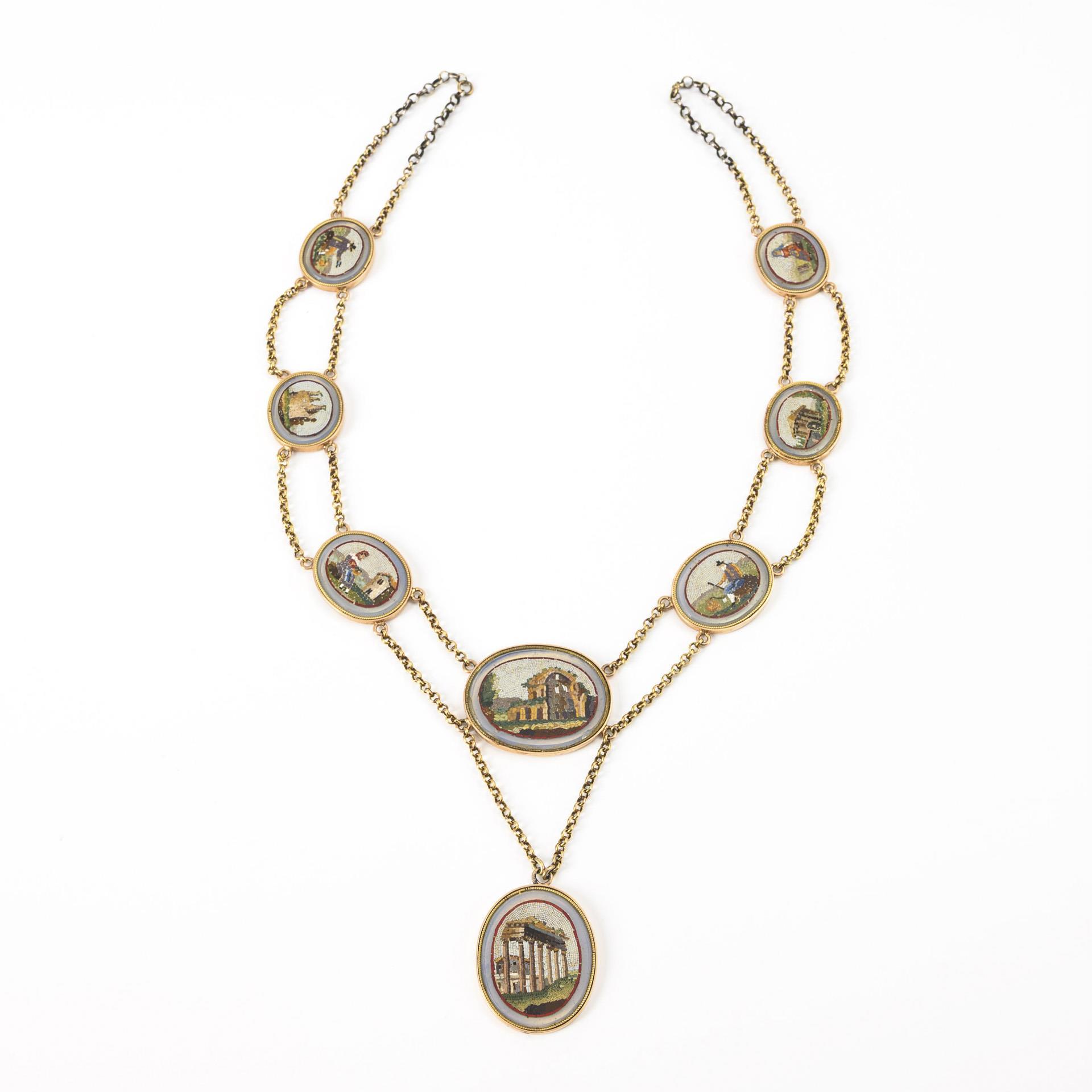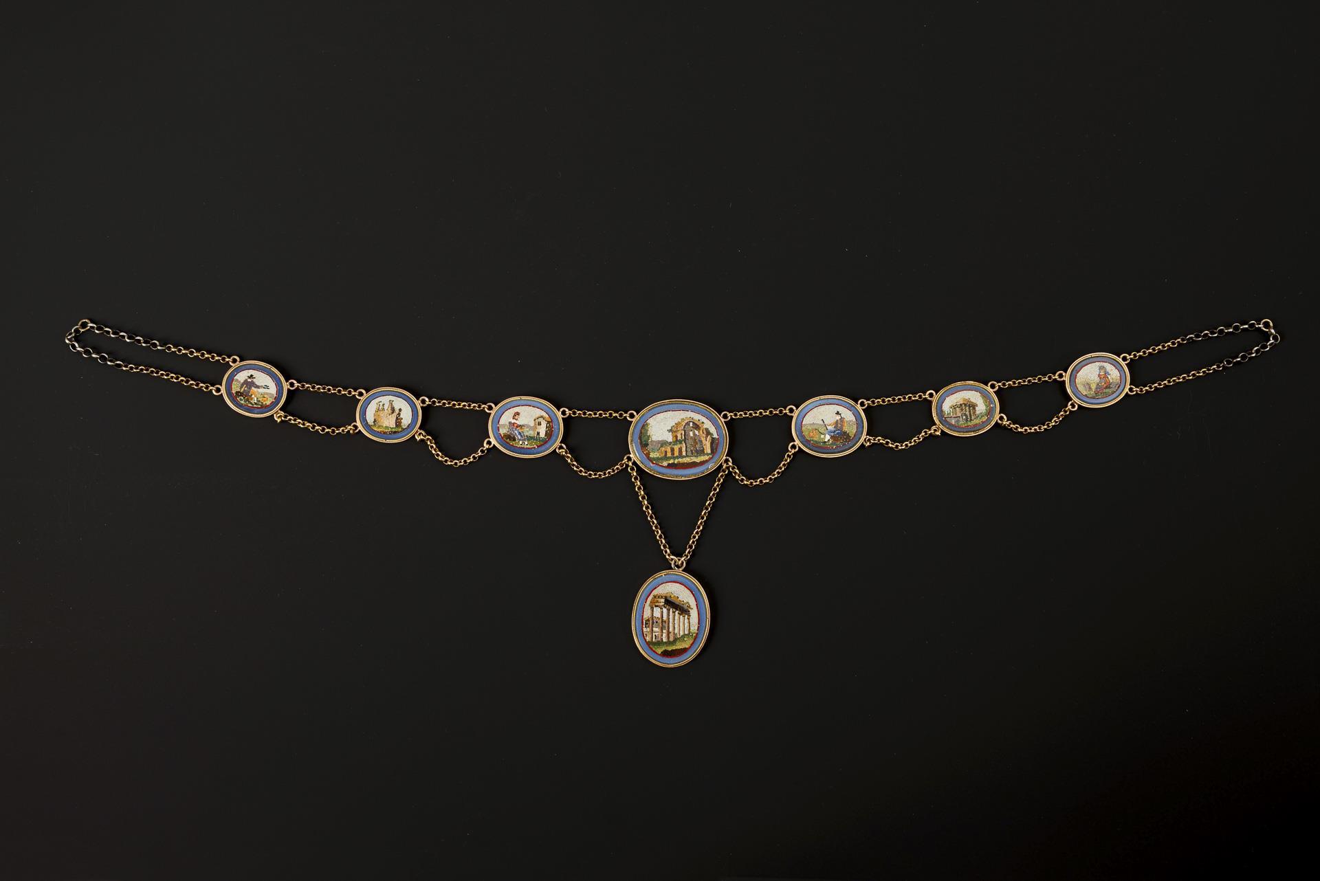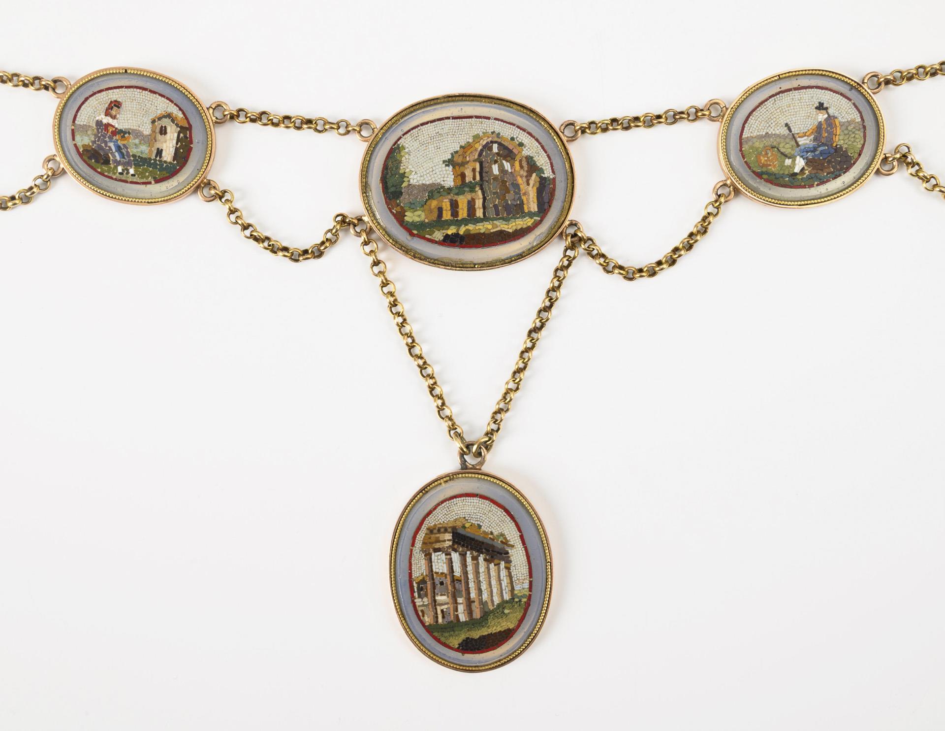 Seltenes Mikromosaik-Collier, wohl aus dem 2. Drittel des 19. Jahrhunderts mit im Verlauf angeordneten Mikromosaiken, abwechselnd romantisch-idealisierte Ruinen und Pastoralszenen mit arbeitender Landbevölkerung darstellend. Zeittypisch ohne Verschluss; das Collier wird mit einem Band geschlossen (beiliegend ein schwarzes Samtband). Die Rahmungen der Mosaike sowie die Ketten sind in Gold gearbeitet, die Ketten jedoch wohl zur Steigerung der Belastbarkeit beim Tragen an den beiden Verschlussstellen je durch den kurzen Einsatz einer Silberkette verstärkt. Dazu ein historisches Etui.