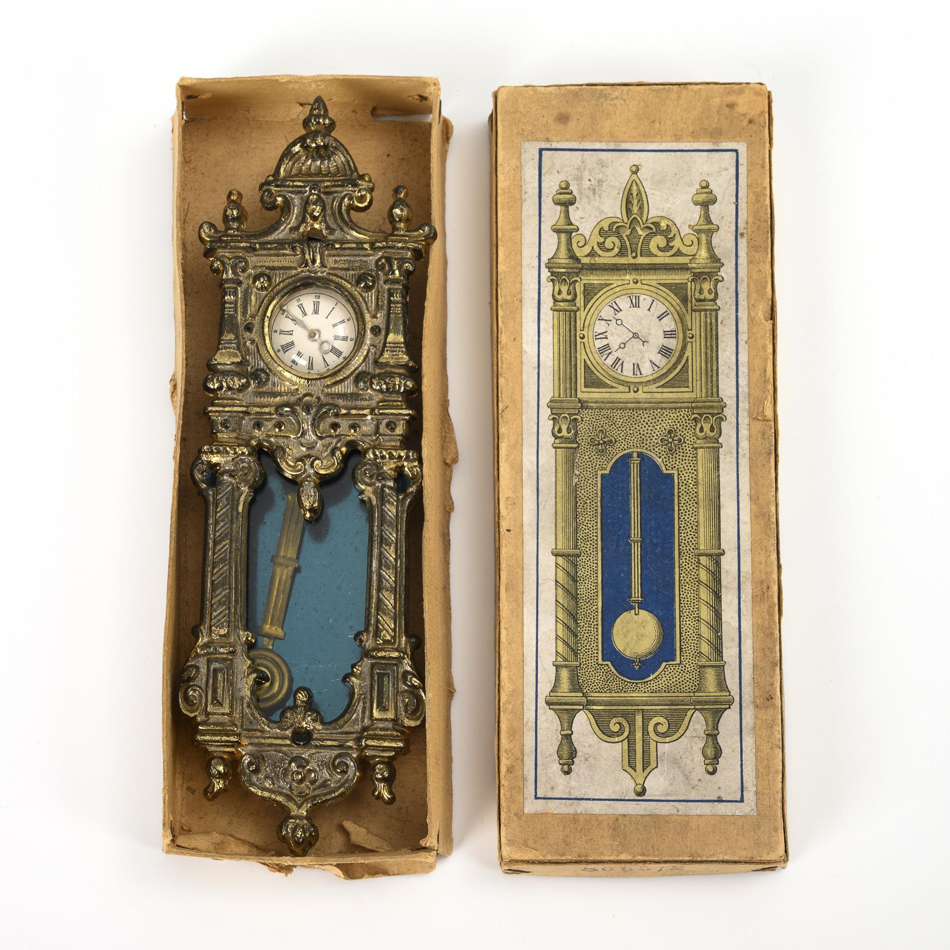 Puppenstubenregulator in Originalkarton.