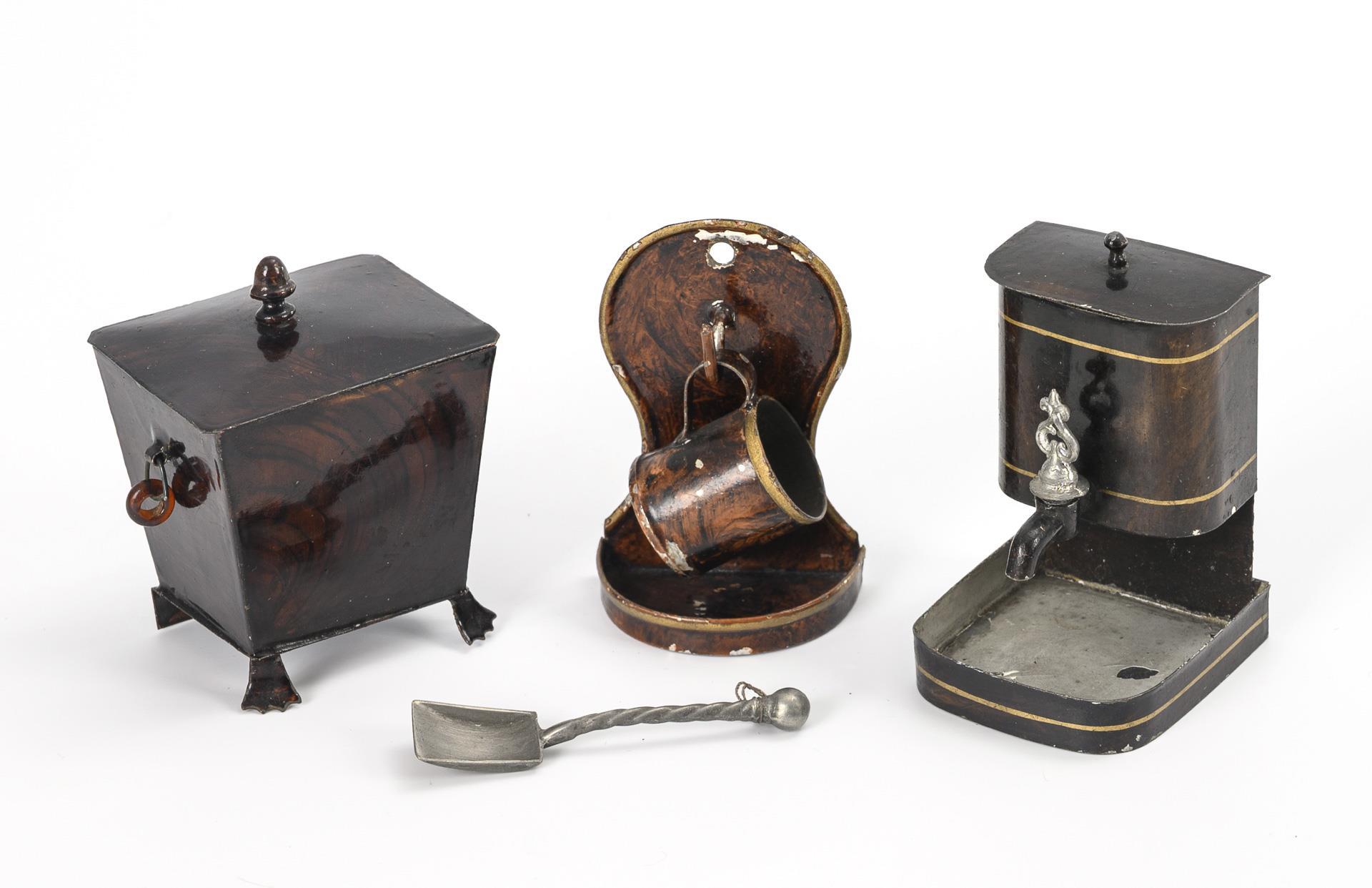 Kohlenkasten, Lavabo und Wandmeste mit Becher. Kleine Lackdefekte, wenige, winzige Retuschen am Lavabo.