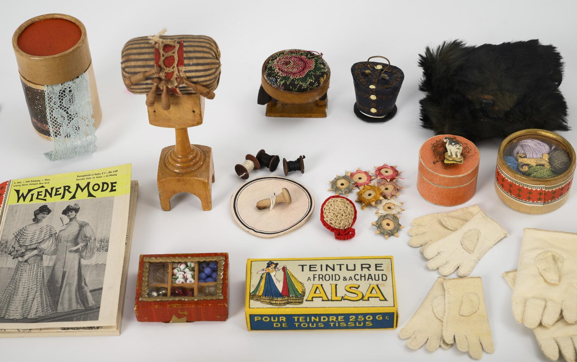 2 "Polarfuchs"-Stolas, dunkelbrauner Fellmuff mit Bärenkopf, 3 Paar weiße Handschuhe, "Wiener Mode"-Magazin mit Schnittmuster, Klöppelstock, Goldblechspiegel und etwas Nähzubehör. Teils leichte Altersspuren.