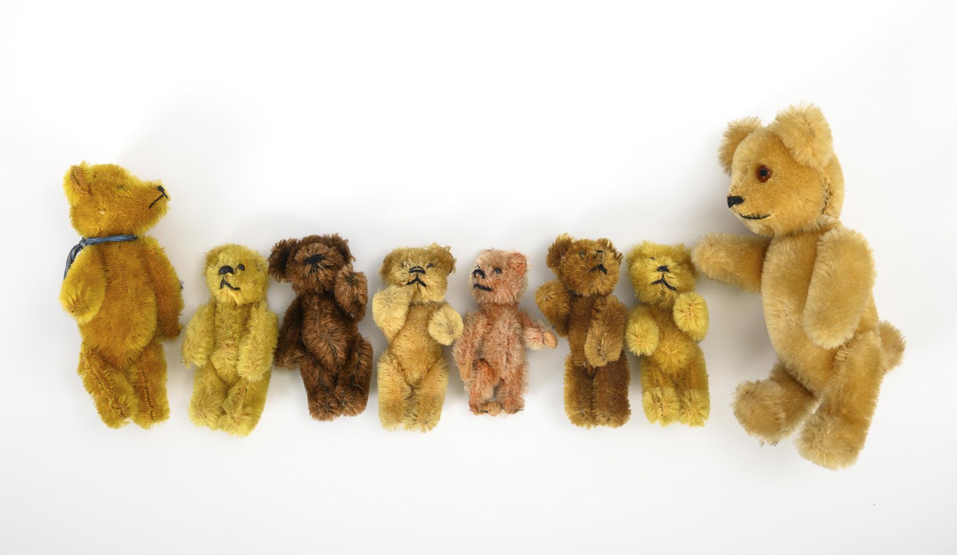 5 blonde, 2 braune und 1 rosa Vorkriegs-Teddy mit beweglichen Gliedern. (7 x Schuco). L 6 - 13 cm. Yes- und No-Mechanik intakt, teils mit minimalen Altersspuren, 1x Fußfilze defekt.