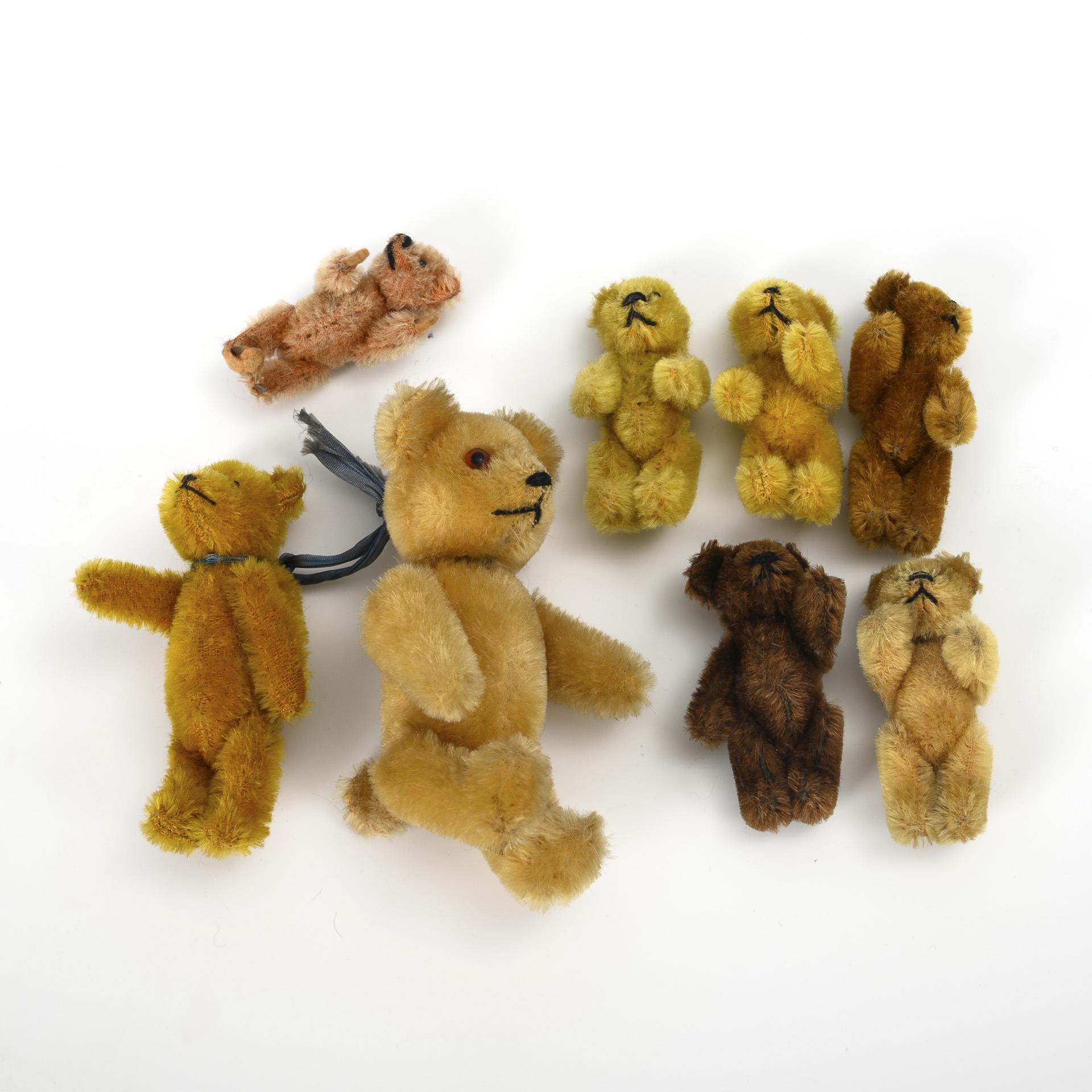 Blonder Yes-No-Teddy und 7 Miniatur-Teddys. Schuco.