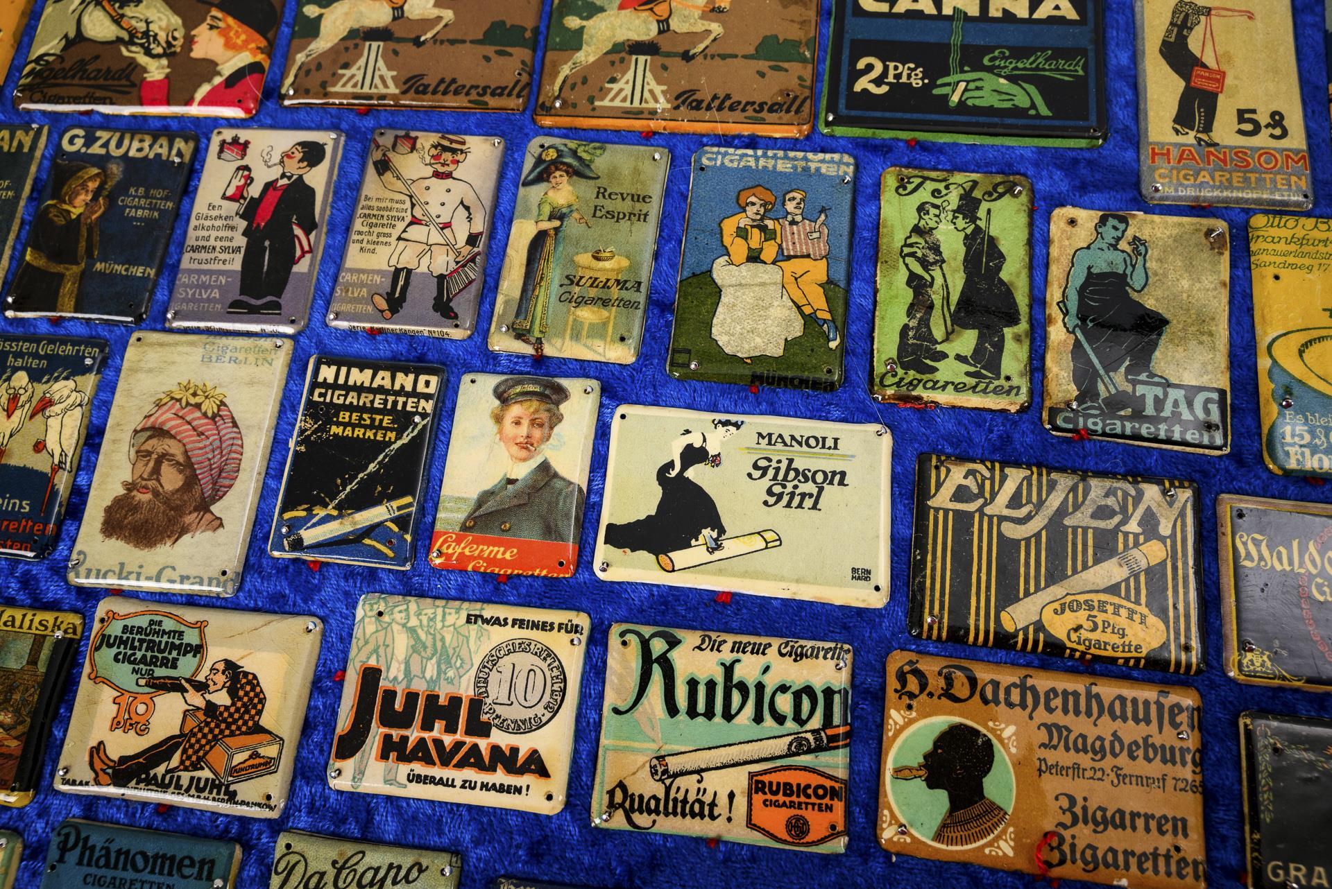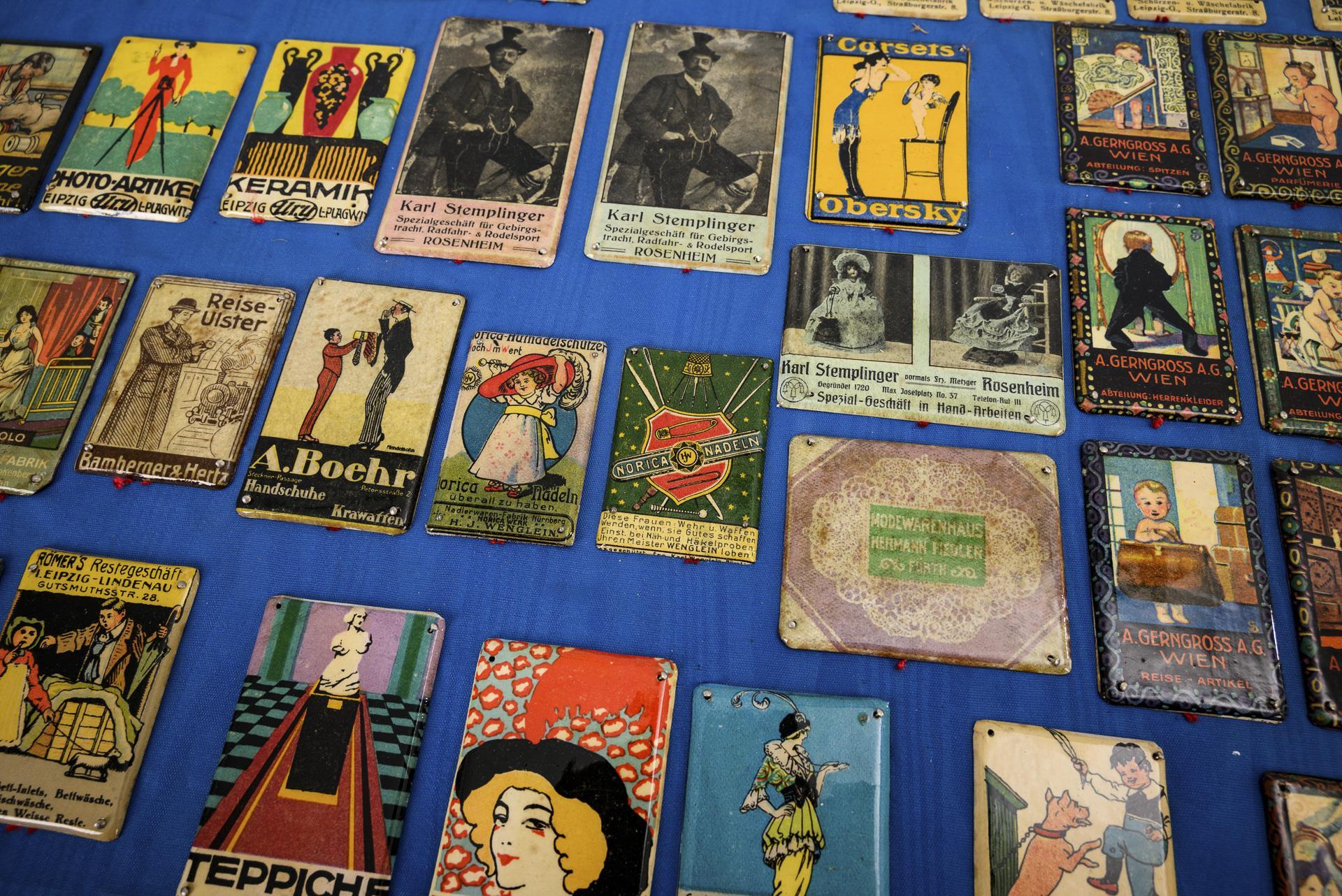 Einige Kaufhäuser (Ury bzw. Otto Freiberg Leipzig, Zapff Würzburg, Gerngross Wien), etliche Firmen (Stemplinger Rosenheim, Norica Nürnberg, Steiner Paradiesbetten usw.). 1 Tafel mit zahlreichen Schuhpflegeplaketten (Pilo Schuhputz, Continental-Absätze usw.), 1 Tafel zum Thema Tabak (Cardinal, Zuban, Mazeppa, Tattersall, Rubicon usw.). Teils einige Serienbilder: z.B. "Bubenstreiche", Wanderburschen, Vier Lebensalter. Teils einige Alters-/Gebrauchsspuren.