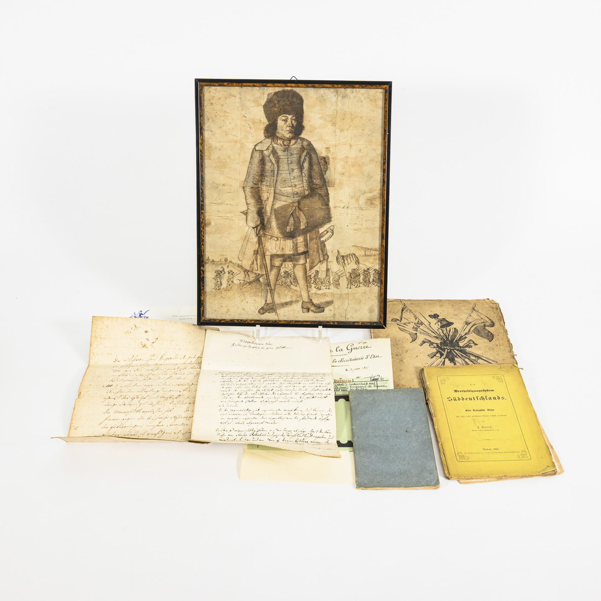 Tuschzeichnung: Laut Beschriftung "Hauptmann Schwan" um 1700, Im Hintergrund Truppen im Gleichschritt ..., Papier wohl geklebt, verglast und gerahmt, 40 x 32 cm. / Broschüre: "Geschichte der Sendlinger Schlacht", 20 Seiten, nach 1830. / Geret: "Das Vertheidigungssystem Süddeutschlands. Eine strategische Skizze", Ansbach 1866, 64 Seiten, ohne Karten. / F.G. Friedr. Körner: "Vaters Heimkunft von Hellas. Ein Schauspiel mit Gesängen zur Feier der K. Bayerschen Krieger aus Griechenland", Lindau 1834, 34 Seiten. / 2 Schreiben an einen Hauptmann Stoll in Ludwigsburg, bezüglich eines Stipendiums, (datiert 1702 und 1802?), geschrieben vom Magistrat zu Urach(?) / Schriftstück an den Bürgermeister von Urach Herr Enslin, 9. Januar 1775, ebenfalls in einer Stipendiensache. / Abschrift eines Schreibens des französischen Kriegsministeriums zur Einsetzung des Chef d' Escadron Gilley, vom 3 Juni 1815. Alle Teile mit starken Altersspuren.