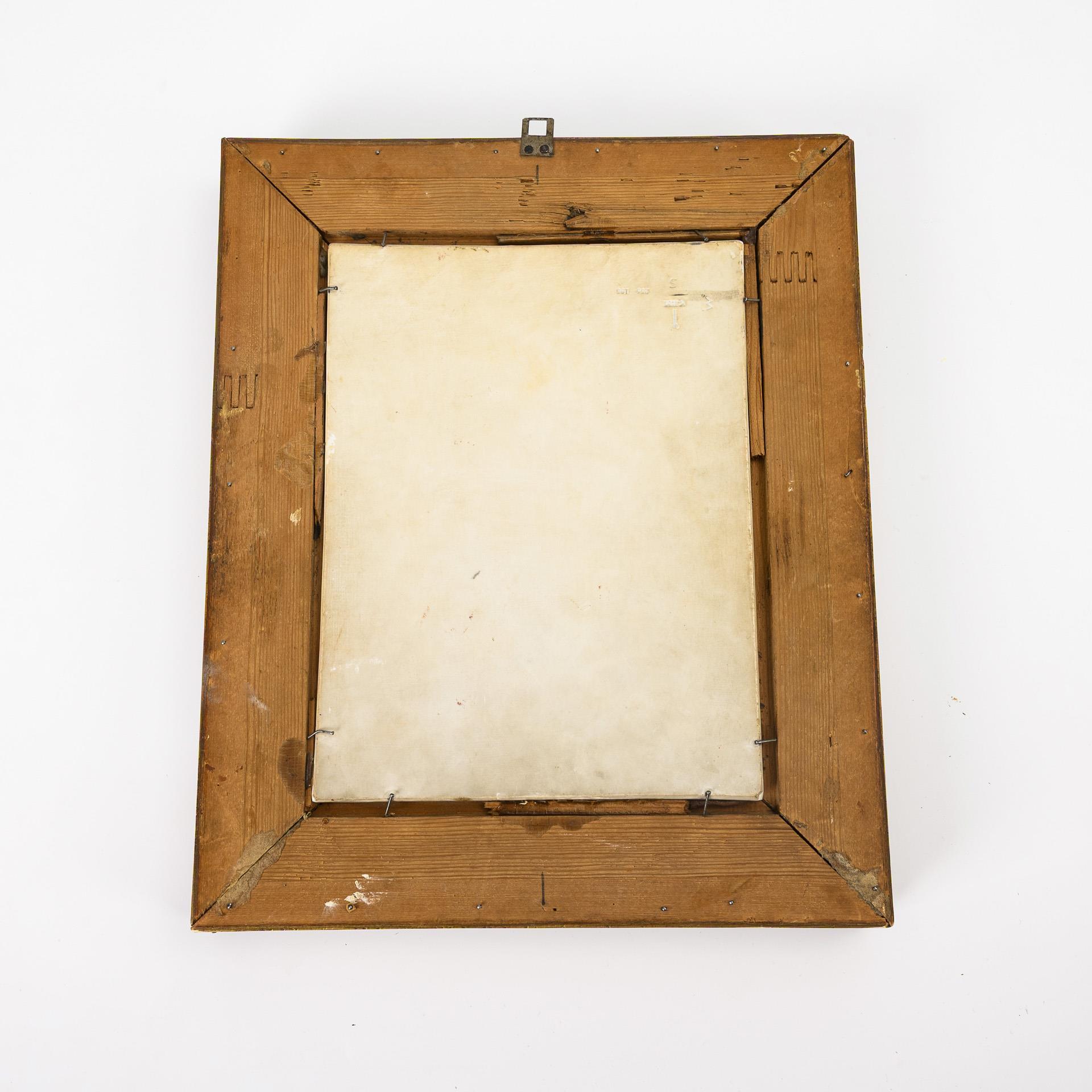 Polychrome Malerei. 25 x 18,5 cm, im goldbronzierten Holzrahmen (35,5 x 29 cm). Ca. 1,6 kg.