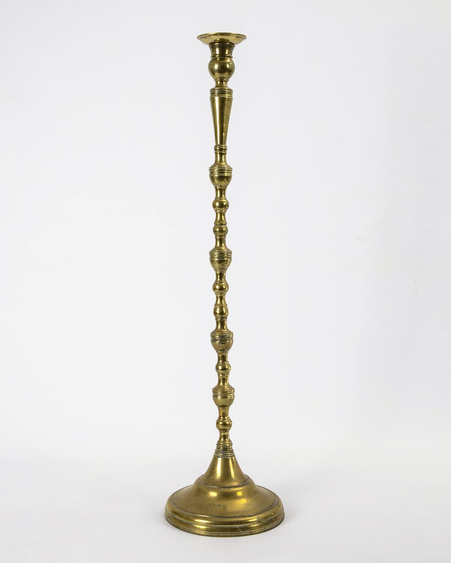Altarleuchter mit konisch ansteigendem Rundfuß, schlanker Schaft mit 4 Balustern und konisch ansteigendem Übergang zur Vase mit Einsteck-Kerzentülle. Einige Kerben/Dellen, kleiner Haarriss an der Vasenlippe.