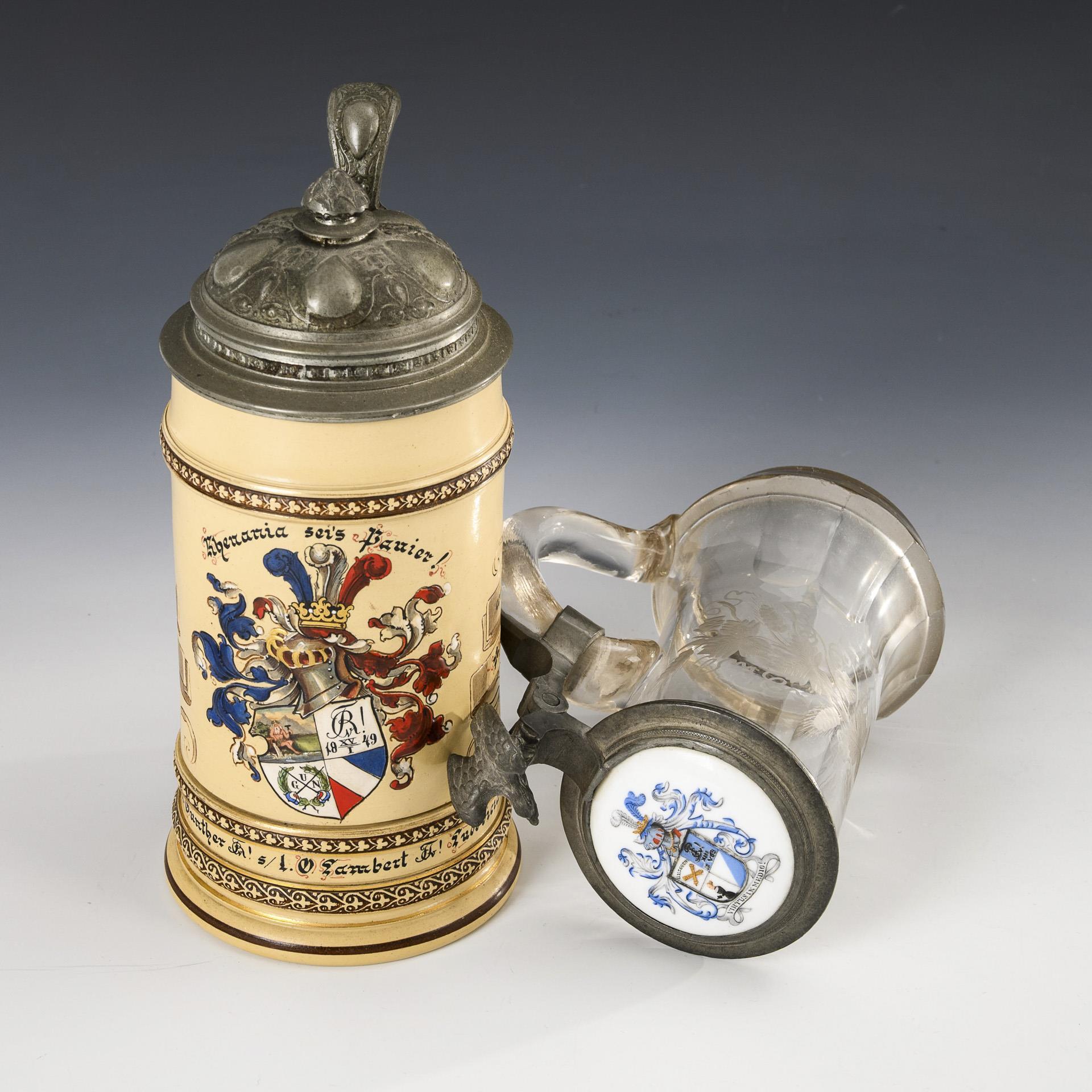 Keramikkrug mit reliefiertem Verbindungswappen der Rhenania Heidelberg; darunter Widmung. / Facettiert geschliffener Glaskrug mit Weinlaubschliff und Porzellanplakette am Zinndeckel mit Adlerdrücker. Auf der Plakette gemaltes Wappen der Verbindung "Erlanger Pfarrerstochter", im Deckel Widmung von Dr. Ebers an Dr. Lambert. 1 Kerbe am Zinndeckel. / Chips am Glas, Lötreparatur und leichte Kerben am Zinndeckel.