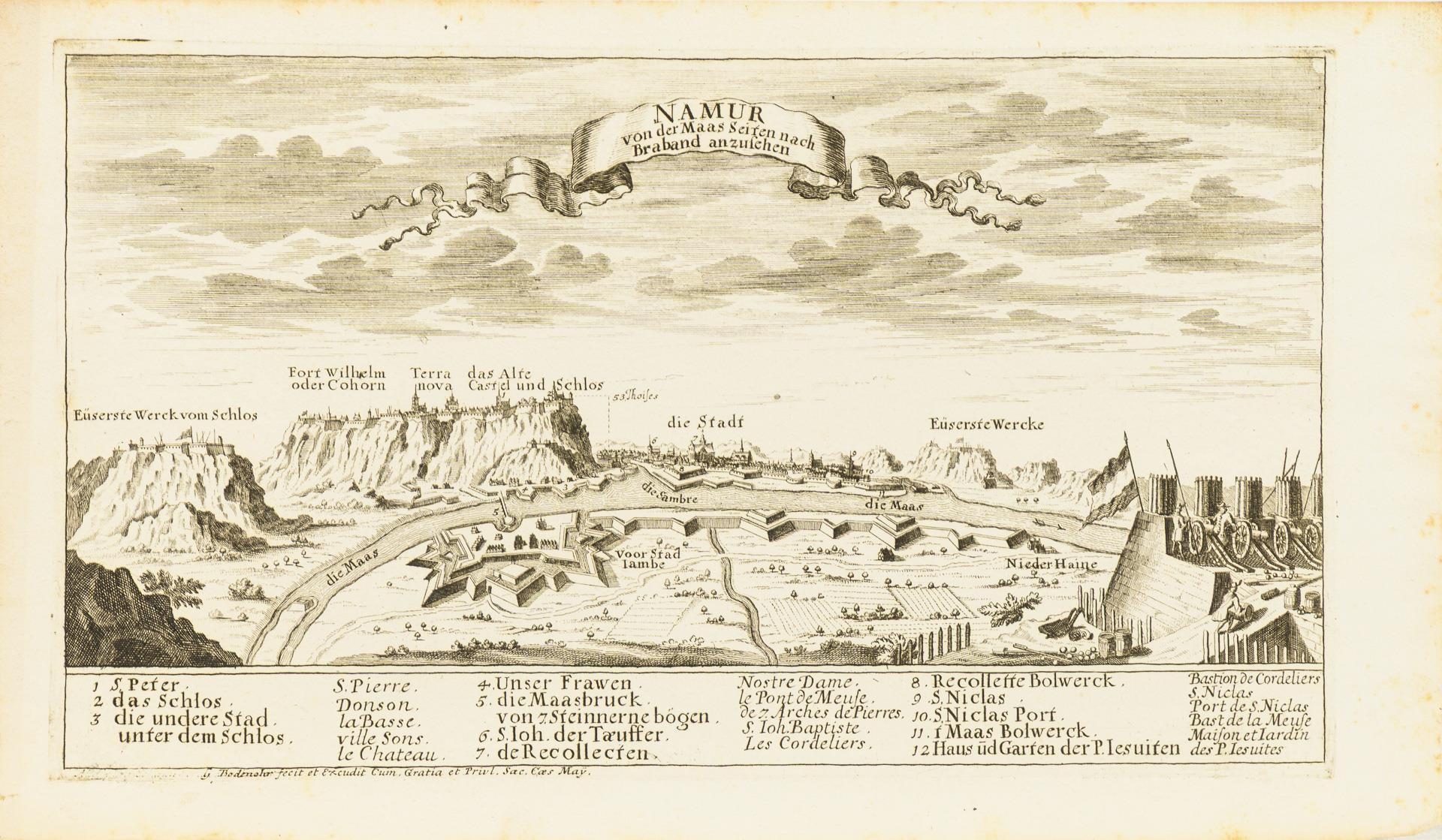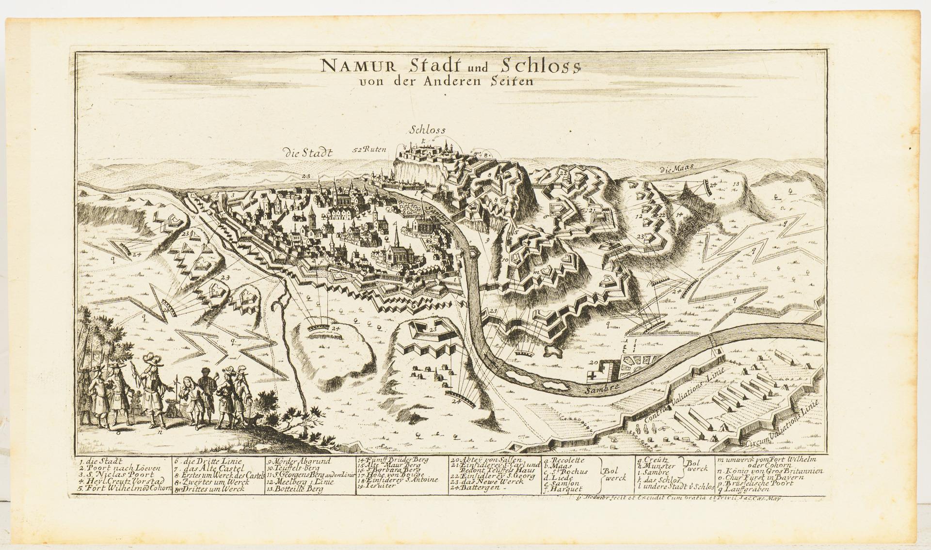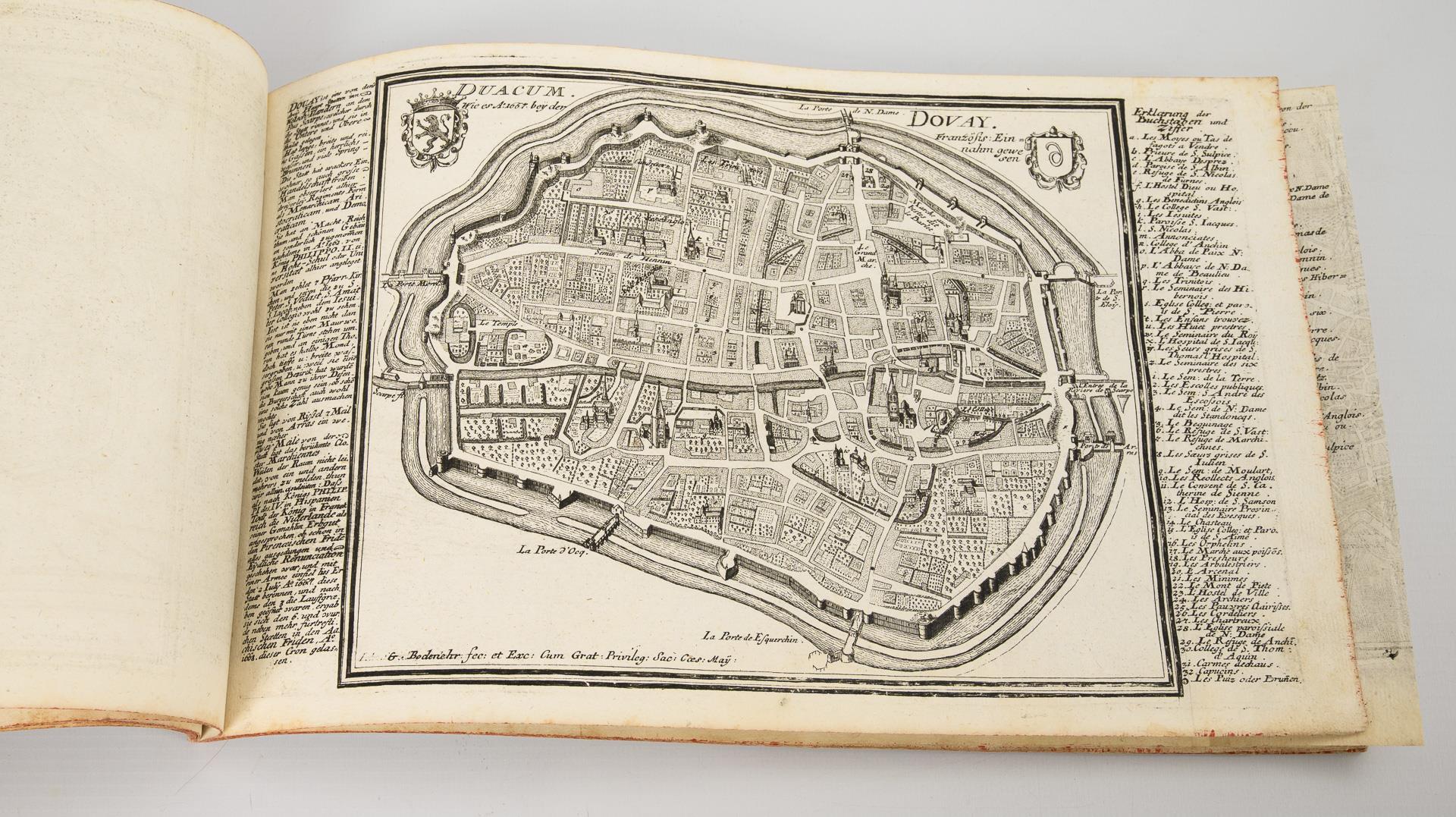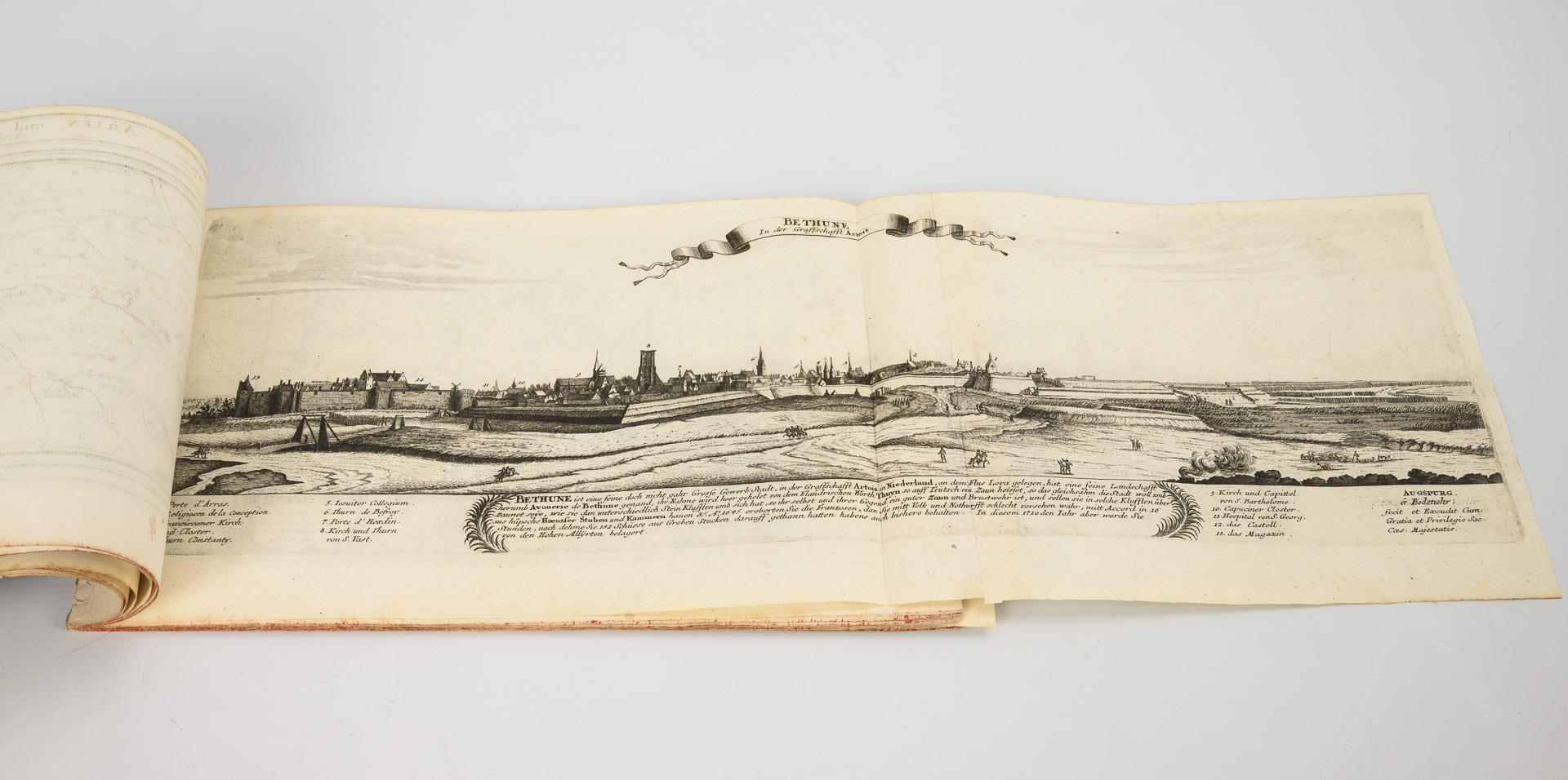 Fragment. "... Dermahliger Begebenheiten (in Französisch Niderland), durch Unterschiedliche Geographische, Hydrographische Topographische, Chronologische Genealogische, Historische etc. Carten, Abrisse und Tabellen erlaeutert.", Augsburg (um 1730), 33 Blätter gebunden und 6 einzelne Blätter, wohl dazugehörig. Hauptsächlich an- und Draufsichten, sowie Fortifikationsanlagen. / Dazu "Schweinfurt" von Johann Herman R.V. / "Kameryk in den Jaare 1581 ...".