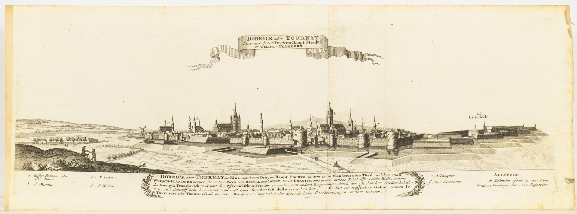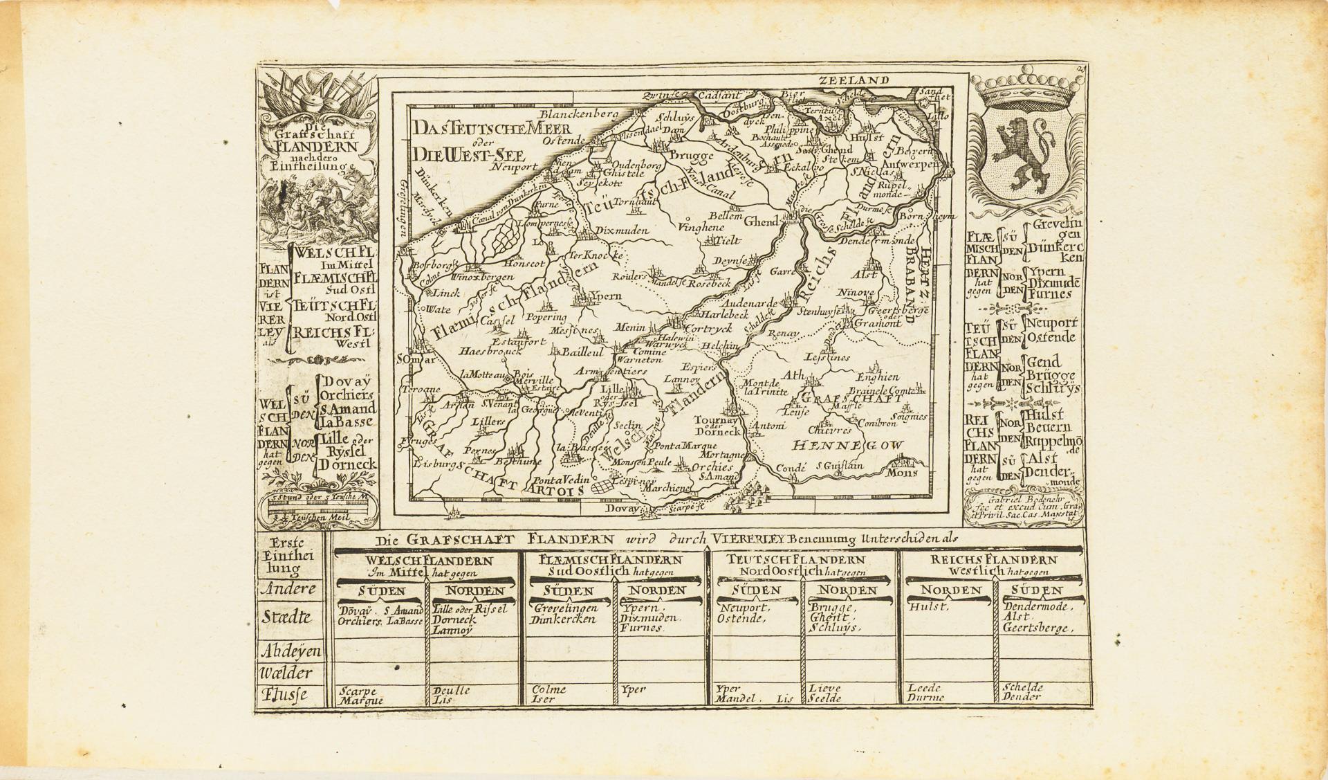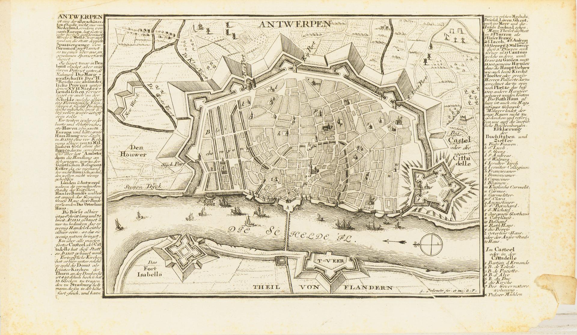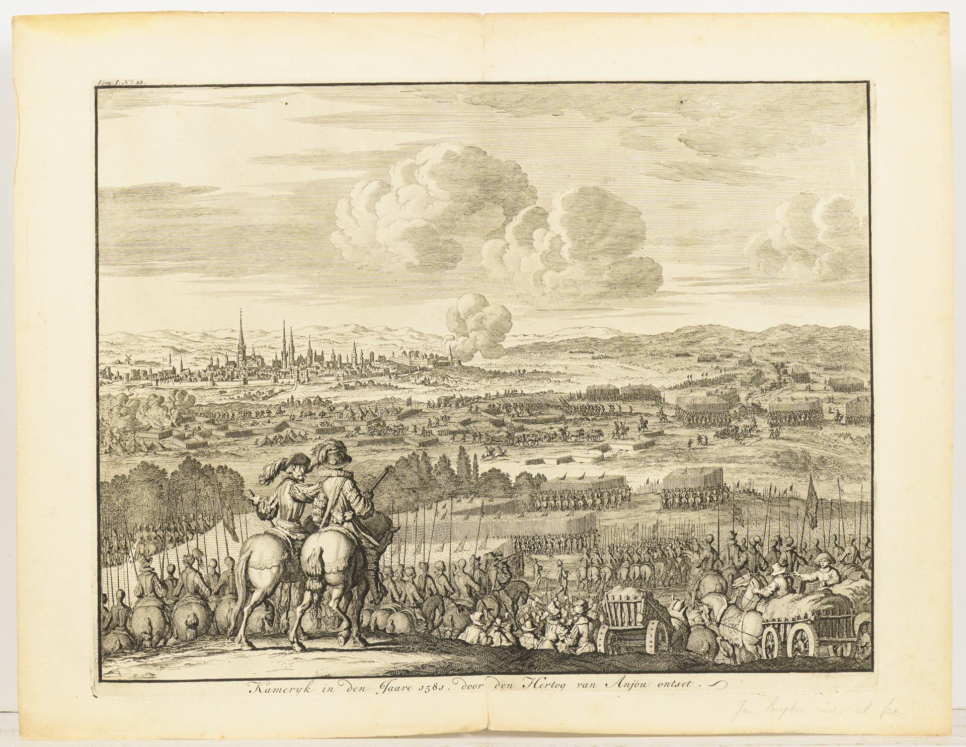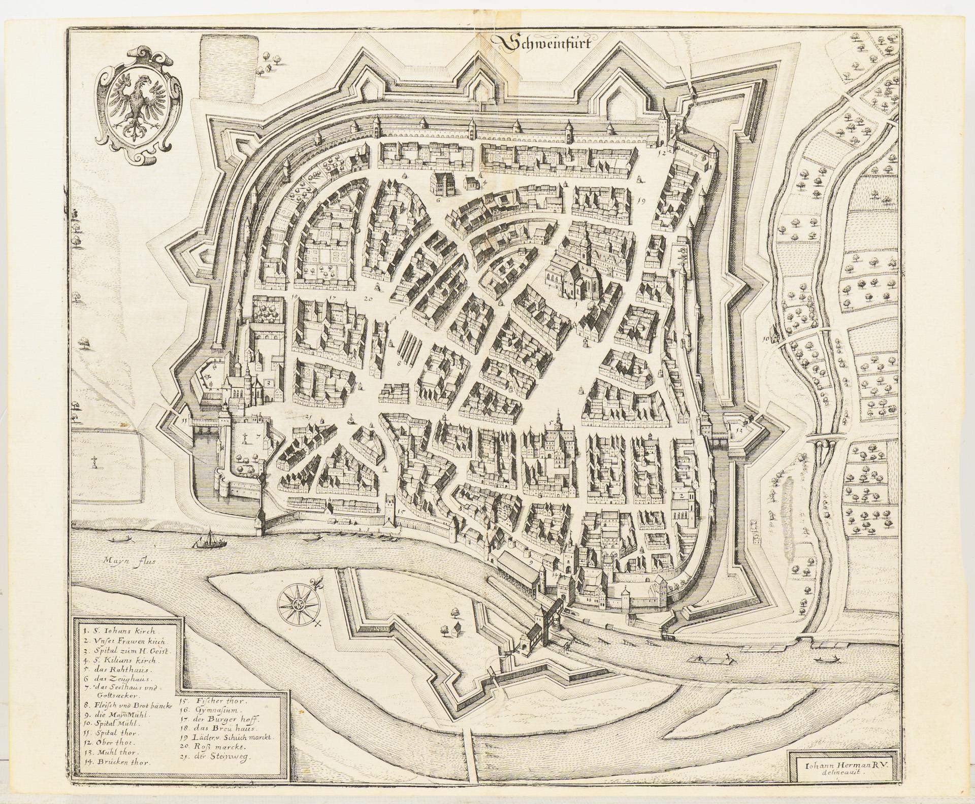 Fragment. "... Dermahliger Begebenheiten (in Französisch Niderland), durch Unterschiedliche Geographische, Hydrographische Topographische, Chronologische Genealogische, Historische etc. Carten, Abrisse und Tabellen erlaeutert.", Augsburg (um 1730), 33 Blätter gebunden und 6 einzelne Blätter, wohl dazugehörig. Hauptsächlich an- und Draufsichten, sowie Fortifikationsanlagen. / Dazu "Schweinfurt" von Johann Herman R.V. / "Kameryk in den Jaare 1581 ...".