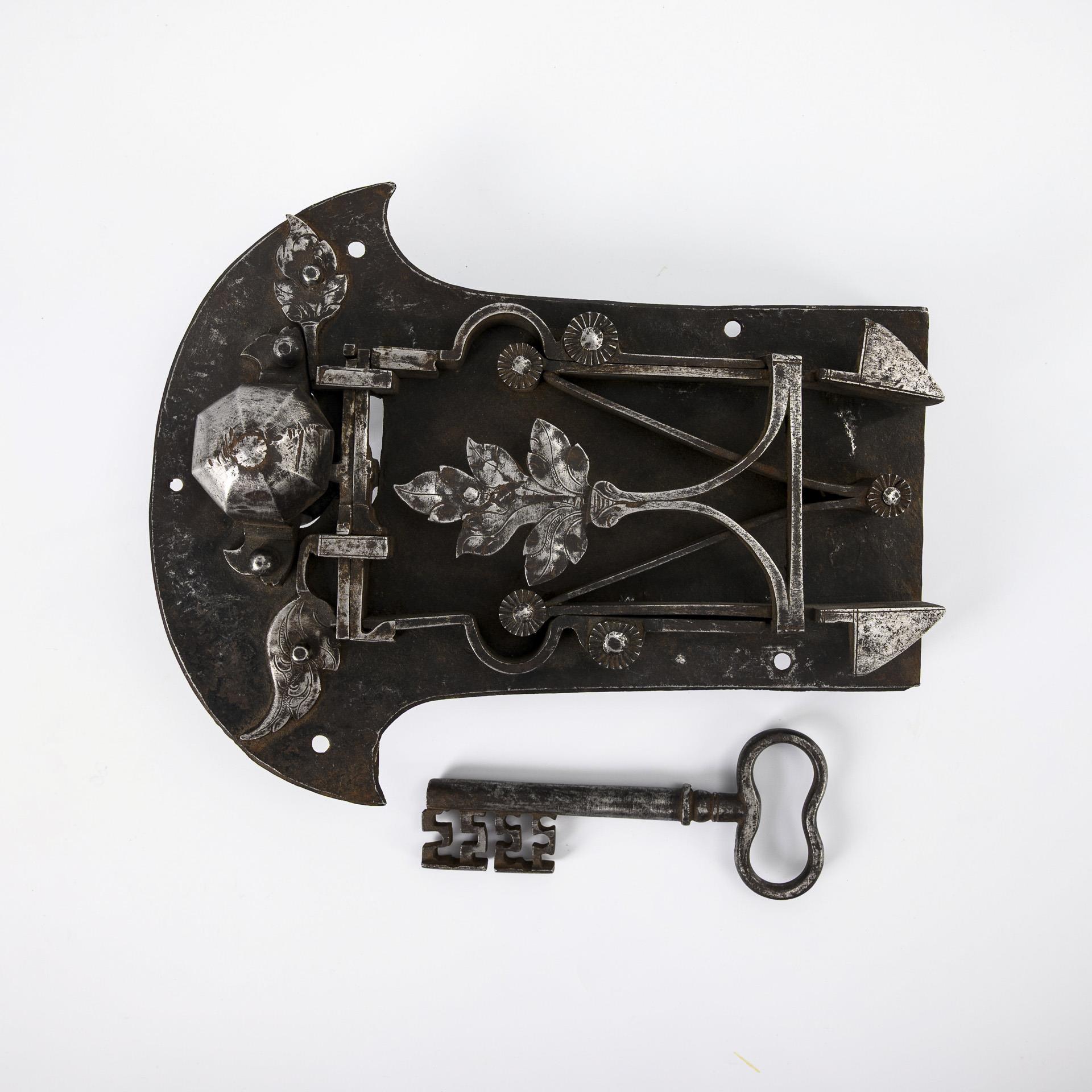Wohl großes Truhenschloss mit 2 Fallen und Kuppelkapelle mit 3 Richtscheiben als Eingericht sowie Verzierungen in Form von gravierten Blättern und sternförmige Unterlegscheiben an den Nieten. / Nicht zum Schloss gehörender Hohldornschlüssel mit gedrückter Reide sowie Bart mit Mittelbruch, mäanderförmigen Richtscheiben und Rippe. 1 Falle und Stulp etwas verbogen, sonst kaum Alters-/Gebrauchsspuren.