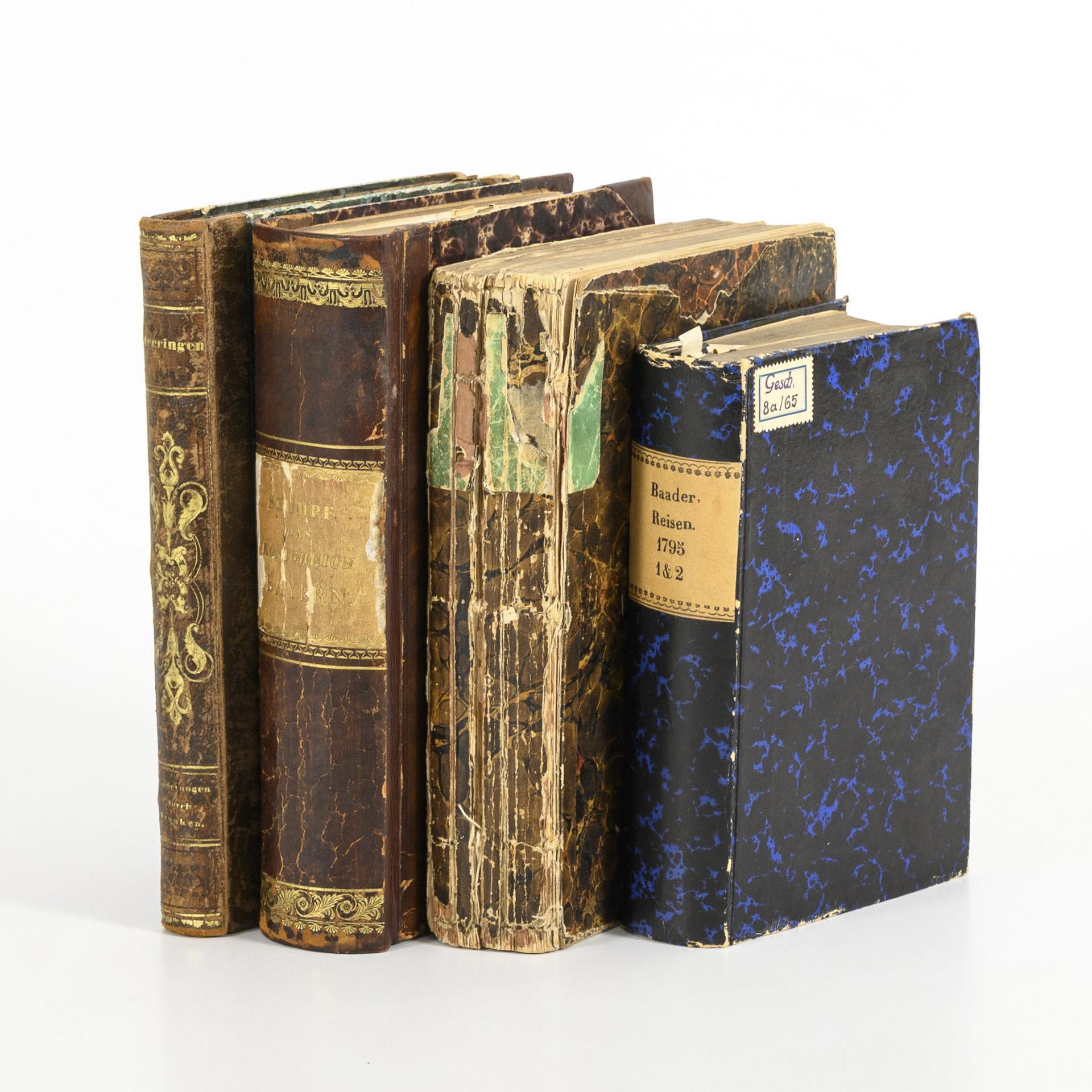Klement Alois Baader: "Reisen durch verschiedene Gegenden Deutschlands in Briefen", 2 Bände in einem Band. Augsburg 1795; 1797, bei Johann Melchior Lotter und Kompagnie. 10, 284, 10, 4673 Seiten. Besitzvermerk. / Ludwig Braunfels: "Die Mainufer und ihre nächsten Umgebungen" mit Stahlstichen nach Zeichnungen von Fritz Bamberger. Würzburg ohne Jahr, Etlinger'schen Verlagsbuchhandlung. 458 Textseiten und zahlreiche Stahlstiche, inklusive der Mainkarte. Starke Gebrauchsspuren, Seiten lose. / Gustav von Heeringen: "Wanderungen durch Franken" mit Stahlstichen, Leipzig, Georg Wigand's Verlag. 183 Textseiten und wohl 30 Stahlstiche. Im Halbledereinband. / Pleichard Stumpf: "Bayern - Ein geographisch-statistisch-historisches Handbuch des Königreiches". Fragment. München 1852, Verlags-Expedition des ... Handbuches. 1088 Seiten mit zahlreichen Illustrationen. Im Halbledereinband mit zahlreichen fehlenden Seiten. Alle mit Alters- und Gebrauchsspuren.