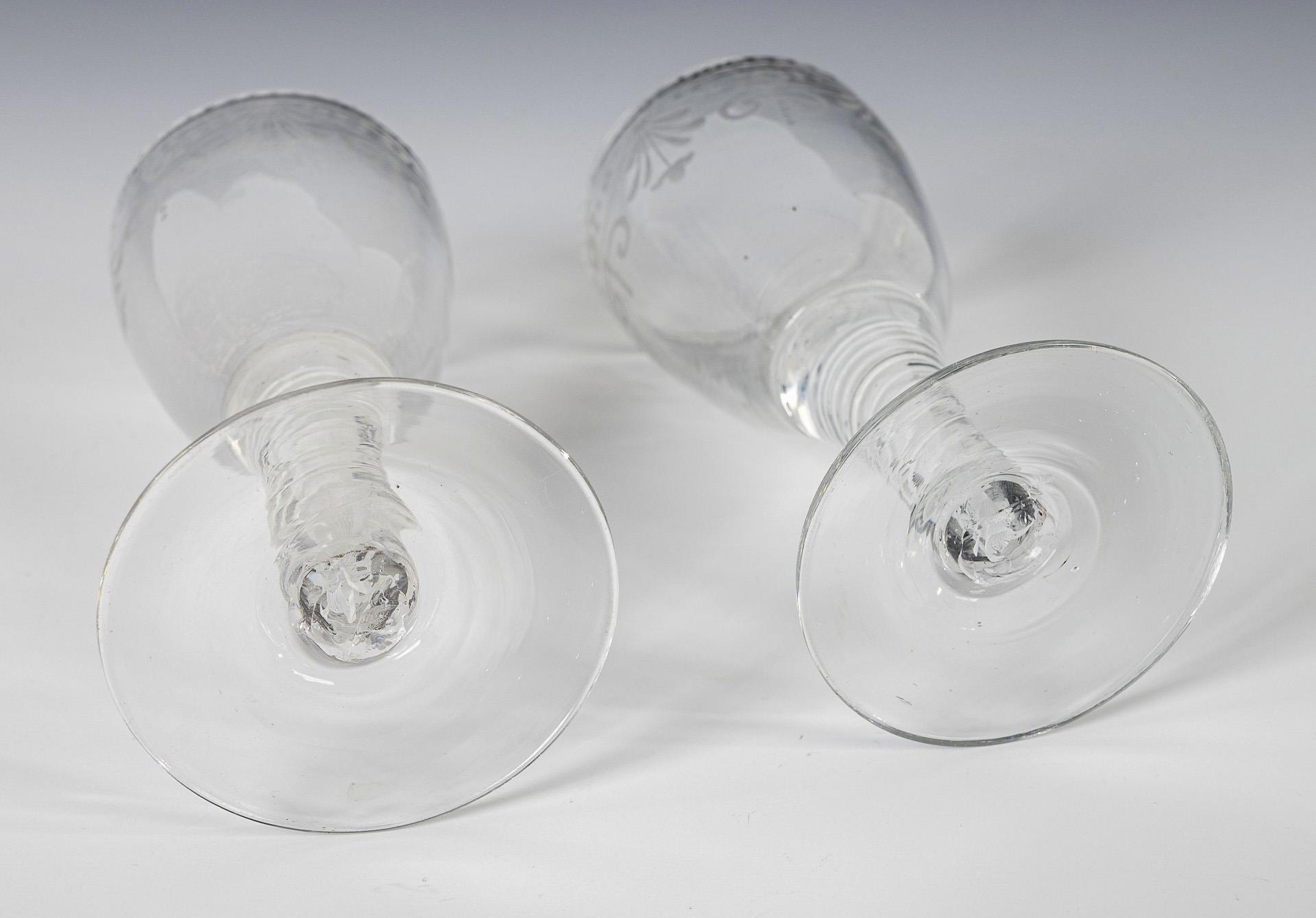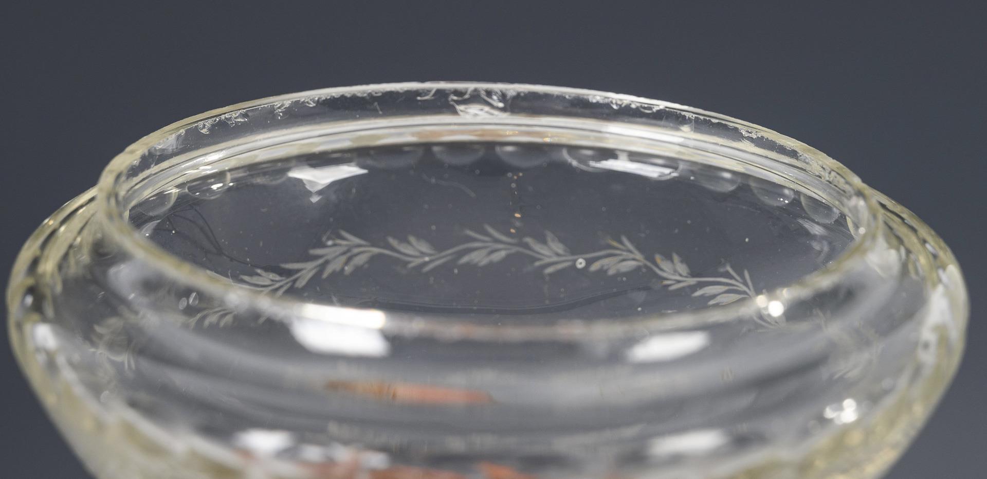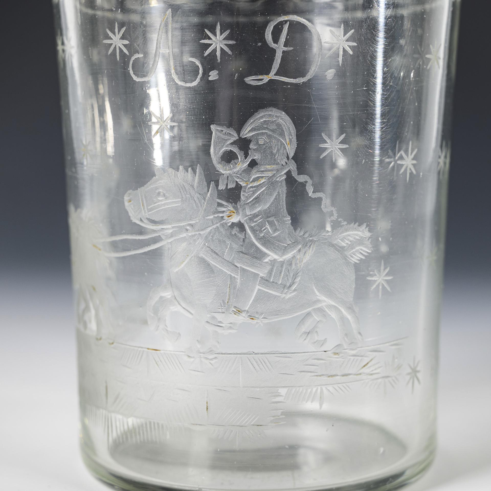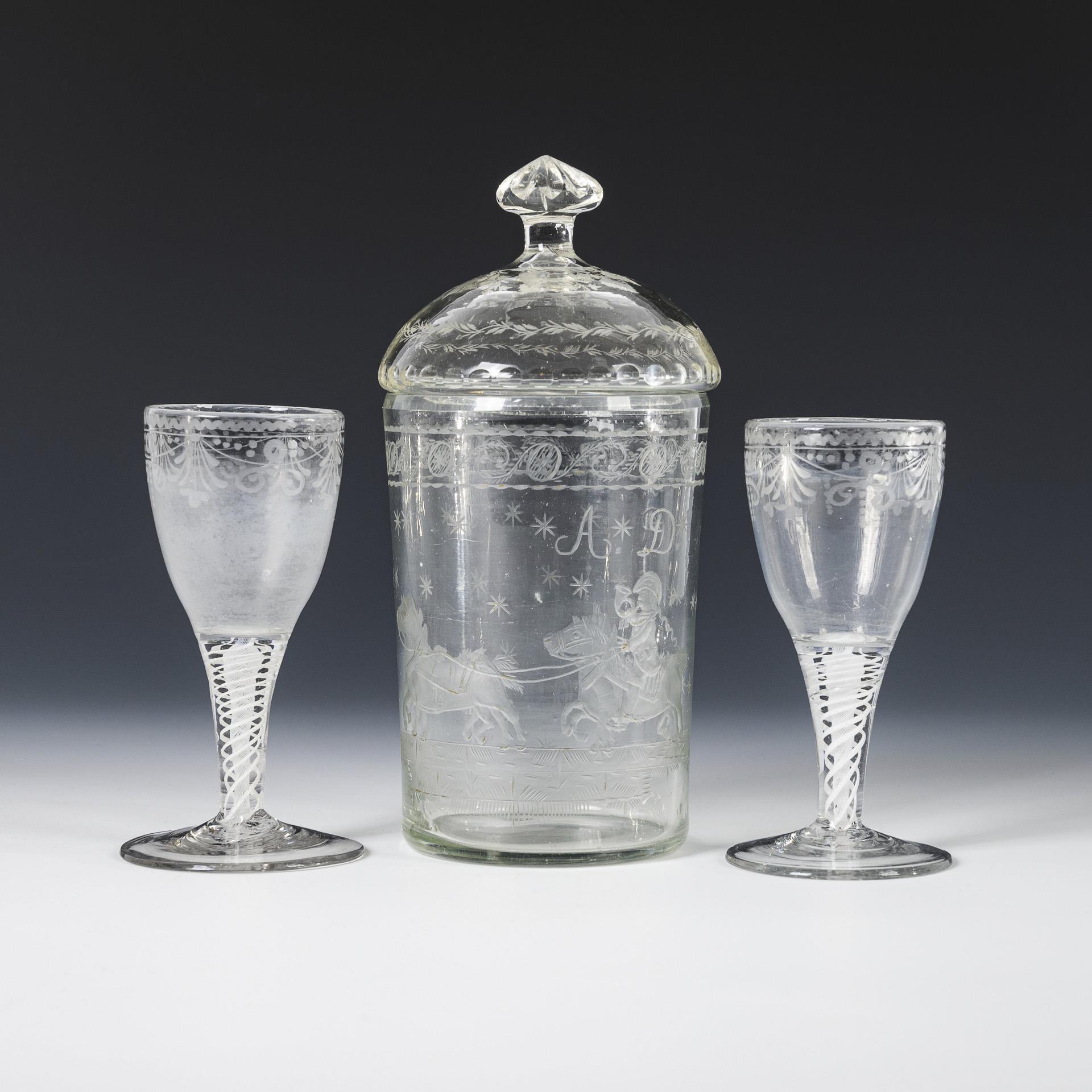 1x norddeutsch, 2. H. 18. Jh.: Paar Kelchgläser mit halbovoider Kuppa, konischem Schaft mit eingeschlossenen weißen Spiralfäden, Rundfuß mit Abriss (H 12 cm). / 1x 1. H. 19. Jh.: Zylinderdose mit ergänztem Knaufdeckel: unter einer gravierten Mäanderbordüre die schauseitige Darstellung eines Postillons zu Pferd mit zwei weiteren Pferden sowie den Buchstaben "A D", umlaufend graviertes Sternchendekor (H 18,5 cm). Deckelinnenrand bestoßen, Kelchglas innen beschlagen.