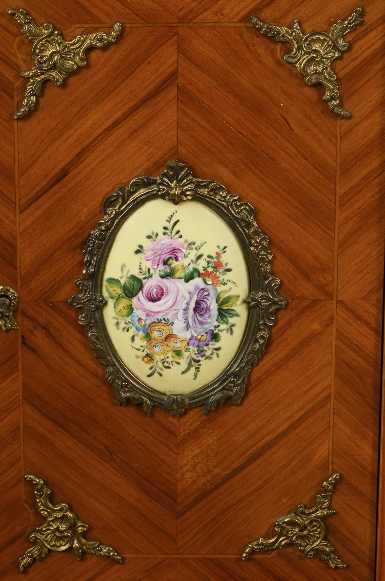 2-teiliges Stilmöbel, bestehend aus einem 2-türigen Aufsatzschrank mit 2 Sockelschüben und einem 1-schübigen Tisch mit ausziehbarer Schreibplatte und 4 geschwungenen Spitzbeinen. Kunstvolles Furnierbild mit floralen Intarsien und Fadeneinlagen, ovale Porzellaneinlagen mit crèmefarbenem Fond und farbiger Blumenmalerei, florale und teils figürliche Bronzebeschläge und Messingzierleisten, Bronzegriffe an den Schüben. Innen 3 Fächer mit bordeauxroter Samtauskleidung.