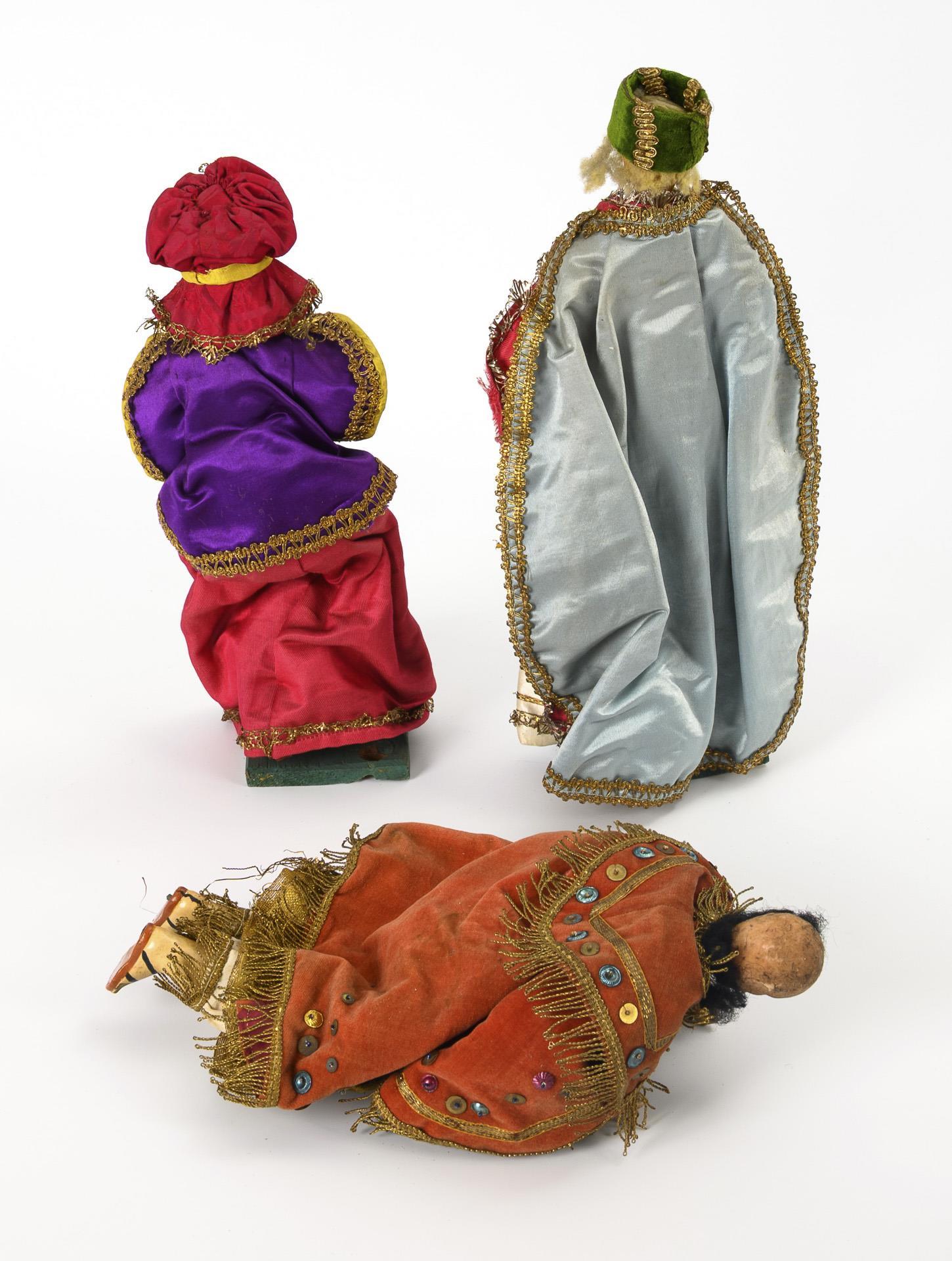 Die drei Könige in prächtigen Gewändern, dabei einer kniend. 1 Wachsfinger fehlt, je Alters-/Gebrauchsspuren, ohne Attribute.