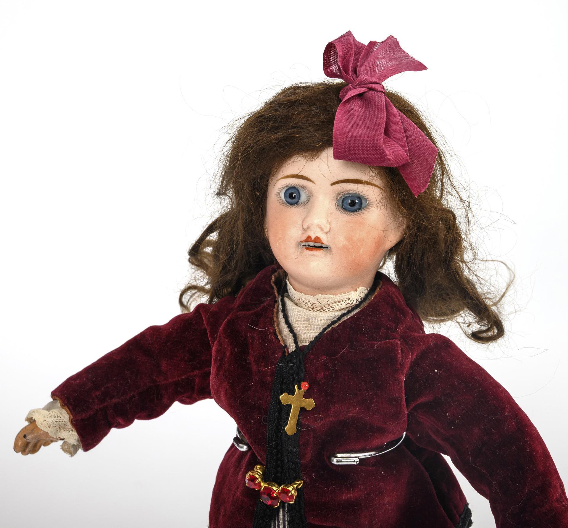 Kurbelkopf, feste blaue Glasaugen, braune Mohairperücke. 11-teiliger Gliederkörper. Gestreifter Rock, weinrote Samtjacke, weinrote Schuhe. Halskurbel mit 1 Chip, Körper mit Farbdefekten, linker Mittelfinger fehlt.
