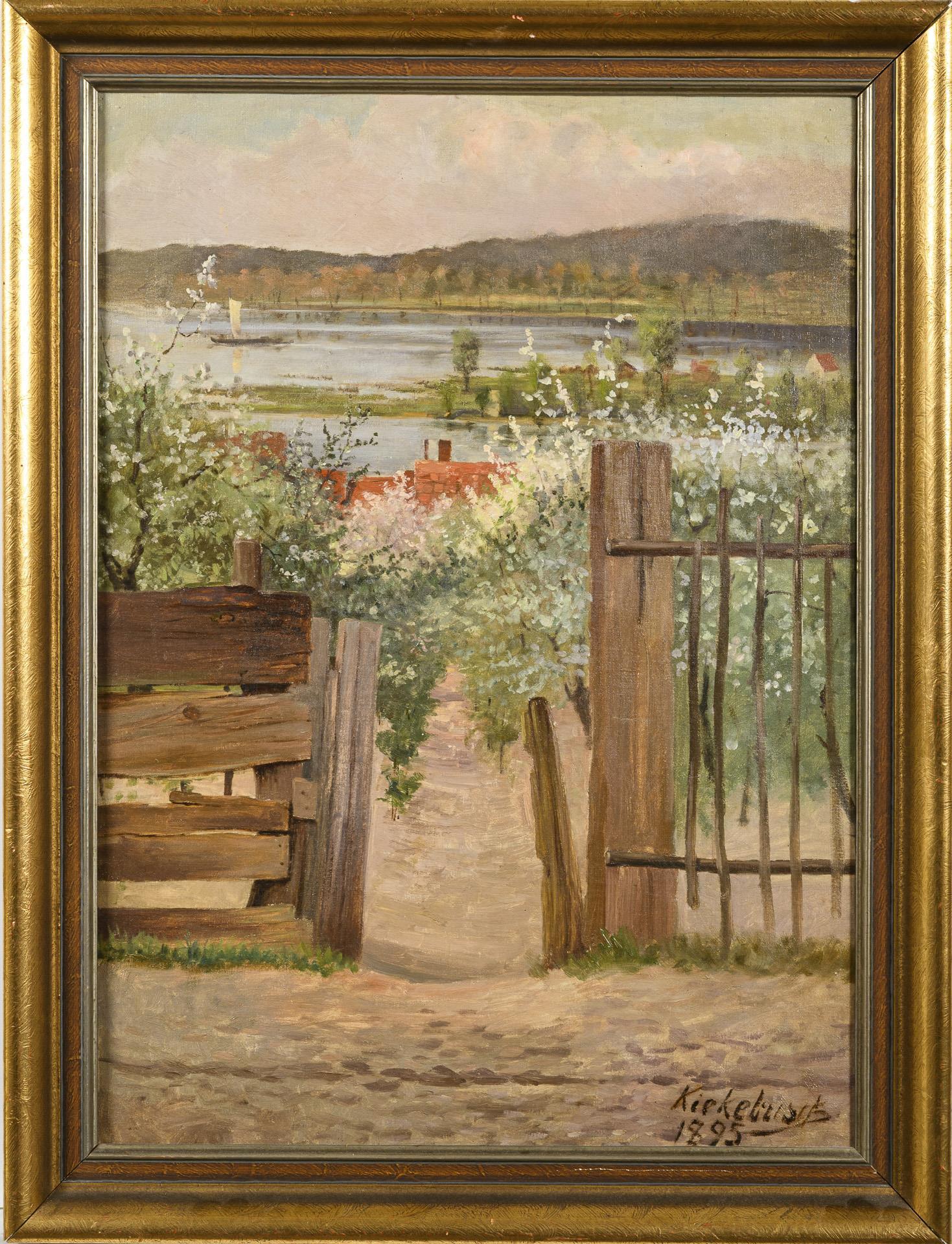 Blick über einen Zaun und die blühenden Obstbäume auf den Fluss mit dem Segler. Leichte Altersspuren.
