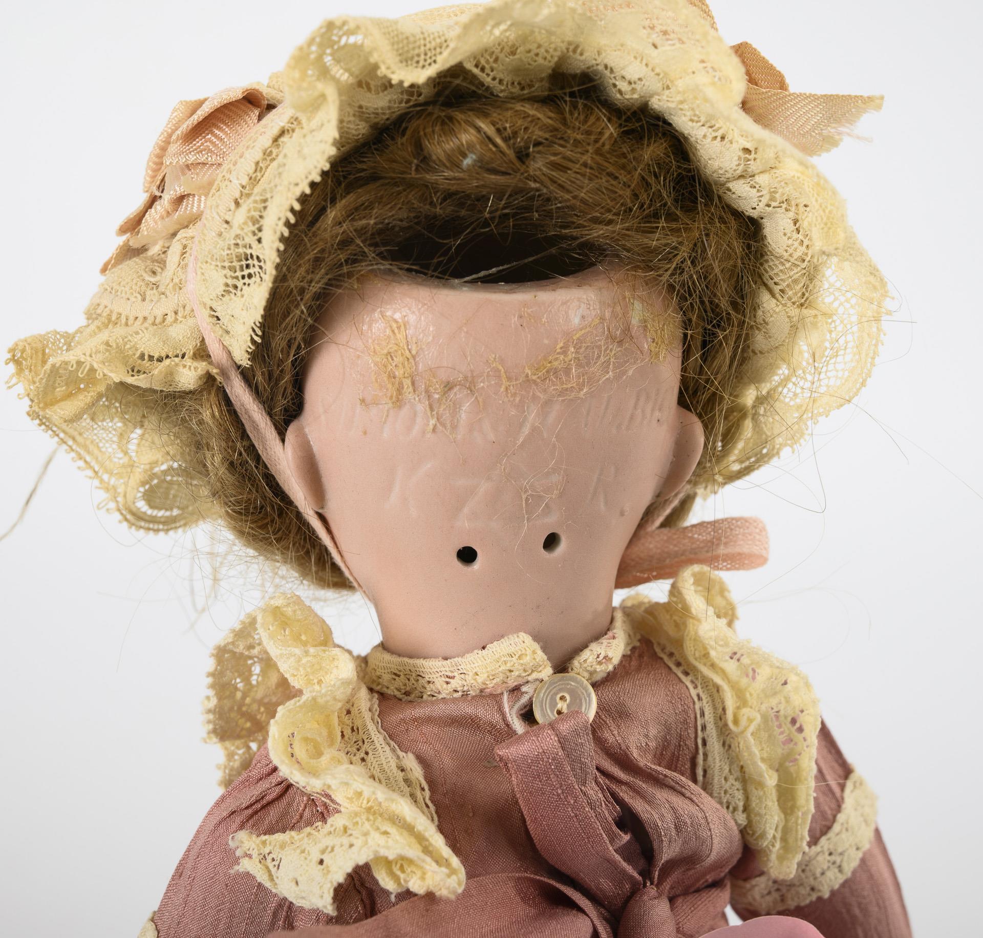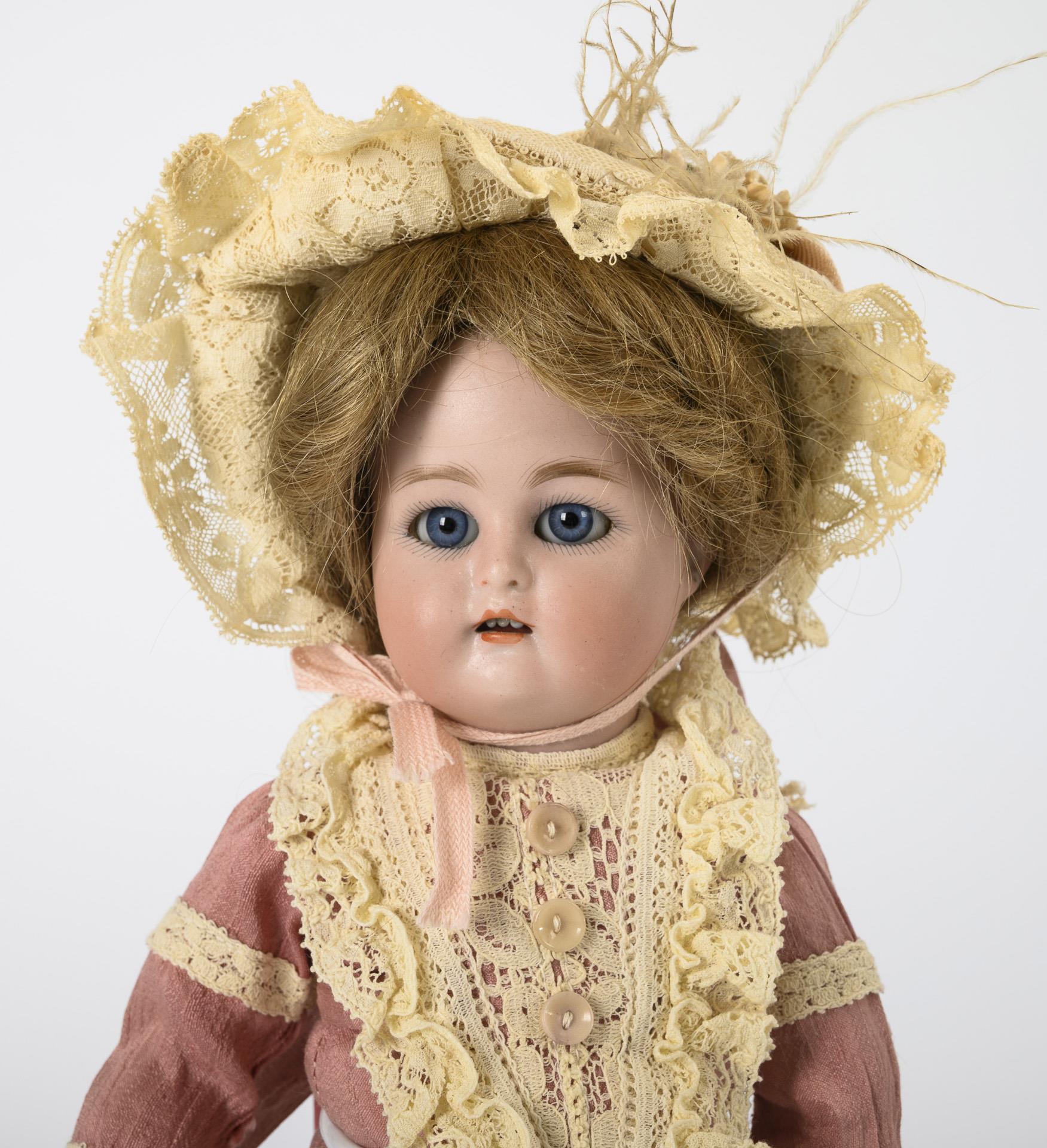 Kurbelkopf, blaue Schlafaugen, Ohrlöcher, alte dunkelblonde Echthaarperücke mit Haarkranz. 15-teiliger Gliederkörper. In alter Art nachgenähtes Kostüm mit altrosa Oberteil und Spitzenkragen, blauer Rock, blaue Stoffschuhe, weißer Hut. Kopf durchleuchtet: ohne Risse, lediglich 1 winziger Chip am rechten Auge und an den Ohrlöchern.