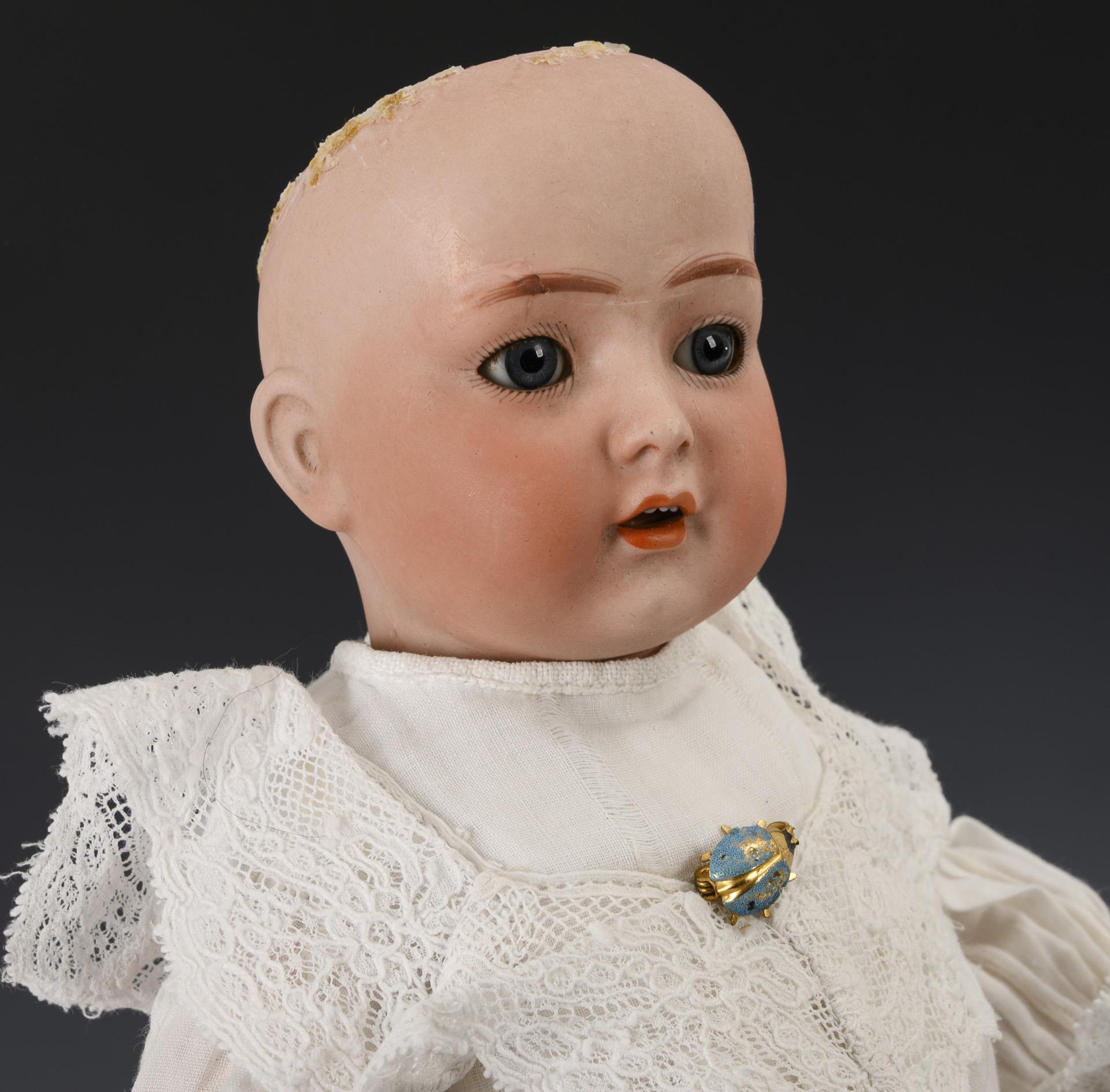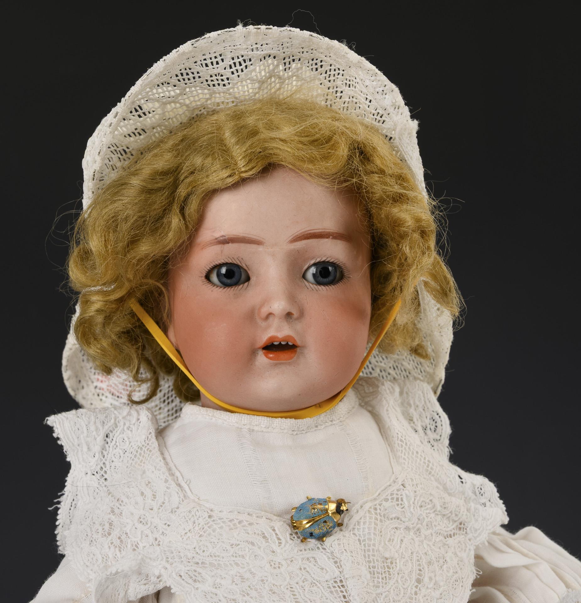 Restaurierter Kurbelkopf, blaue Schlafaugen, blonde Mohairperücke. 15-teiliger Gliederkörper. Weißes Kleid, Hut mit Blumenschmuck, hellblaue Stoffschuhe. Großer, geklebter Ausbruch an der Stirn, Rumpf überstrichen.