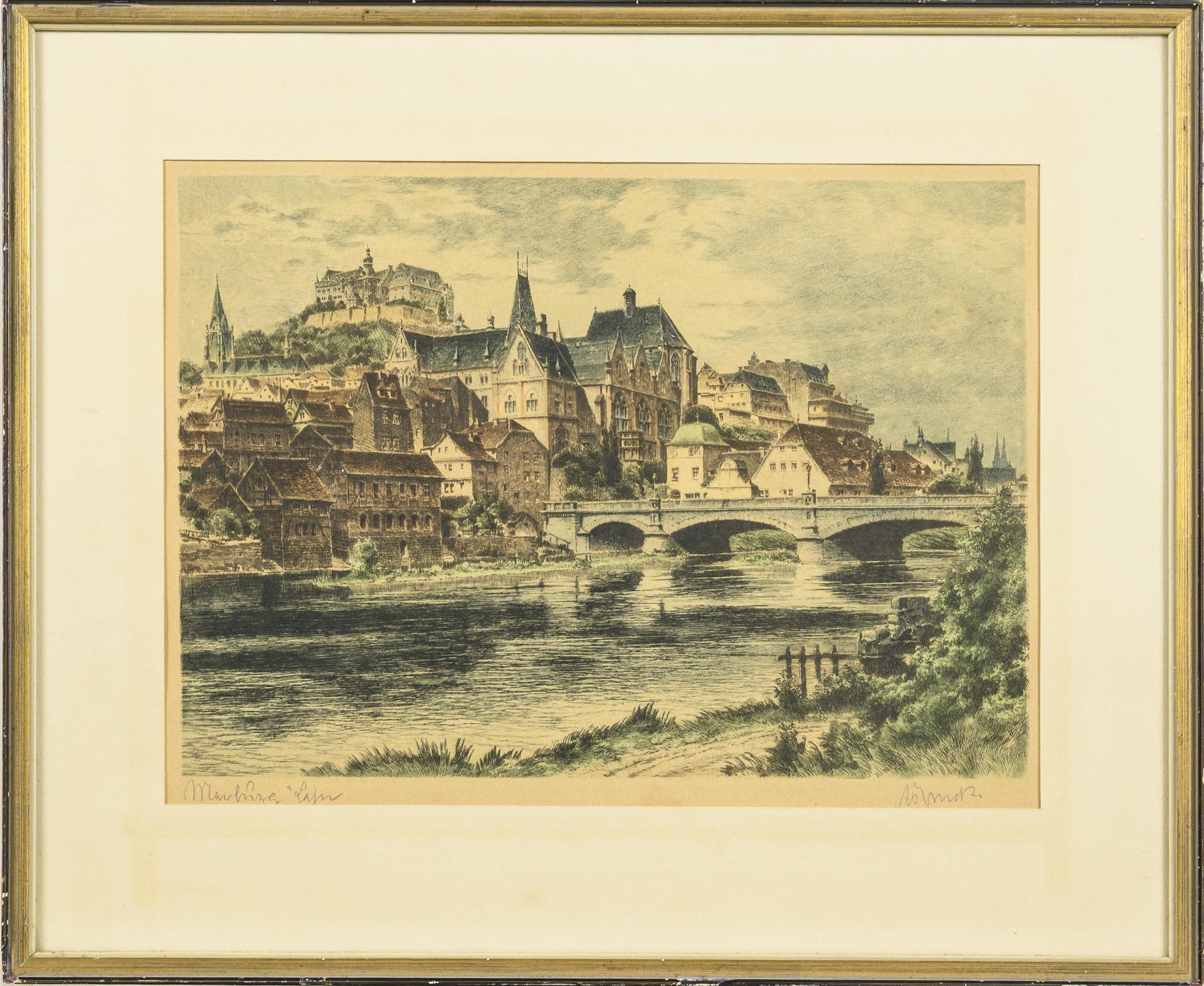 Die mittelalterliche Stadt mit der Burg, vom Fluss aus gesehen. Lichtbräunung im Passepartoutausschnitt, nicht ausgerahmt.