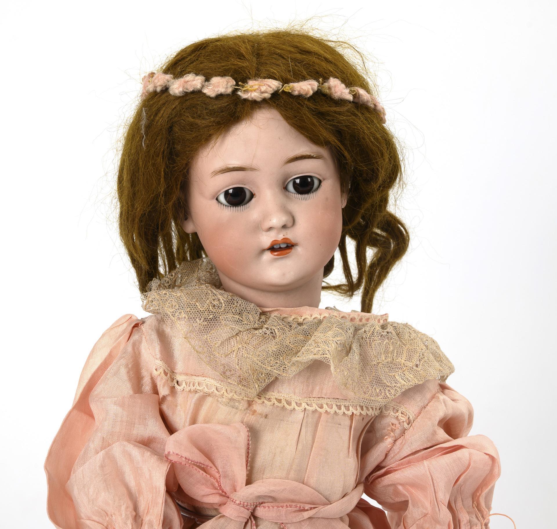 Kurbelkopf, braune Schlafaugen, Ohrlöcher, braune Mohairperücke. Früher, 15-teiliger Gliederkörper. Rosa Seidenkleid mit Spitzen, passende Stoffschuhe und Haarkranz. Kopf durchleuchtet: ohne Defekte. Körper teils übermalt, 1 Finger geklebt.