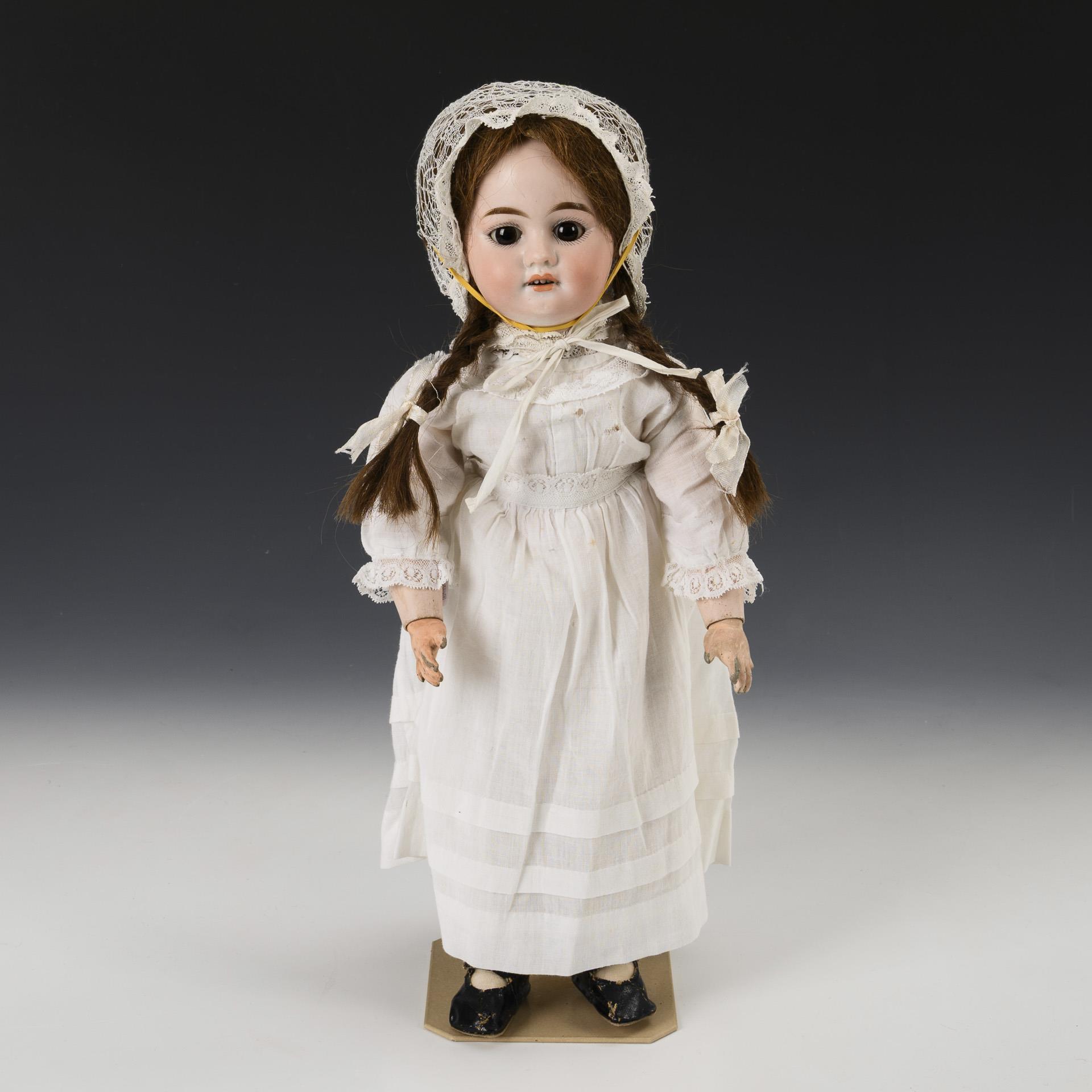 Kurbelkopf, braune Schlafaugen, braune Echthaarperücke mit Zöpfen. 17-teiliger Gliederkörper. Weißes Kleid und Häubchen, schwarze Wachstuchschuhe. Kopf durchleuchtet: ohne Defekte. Körper mit Farbdefekten, kleiner Finger links fehlt.